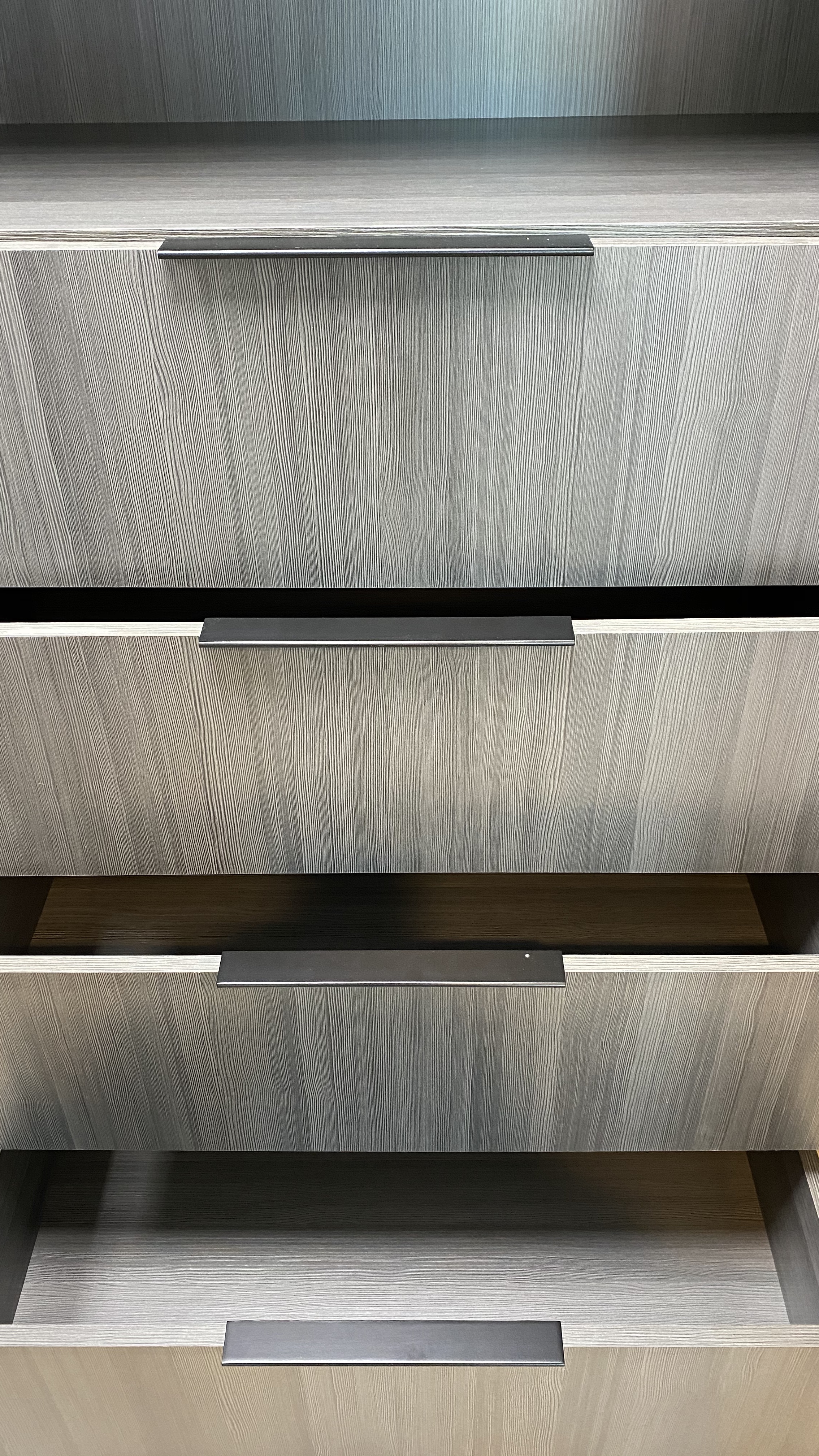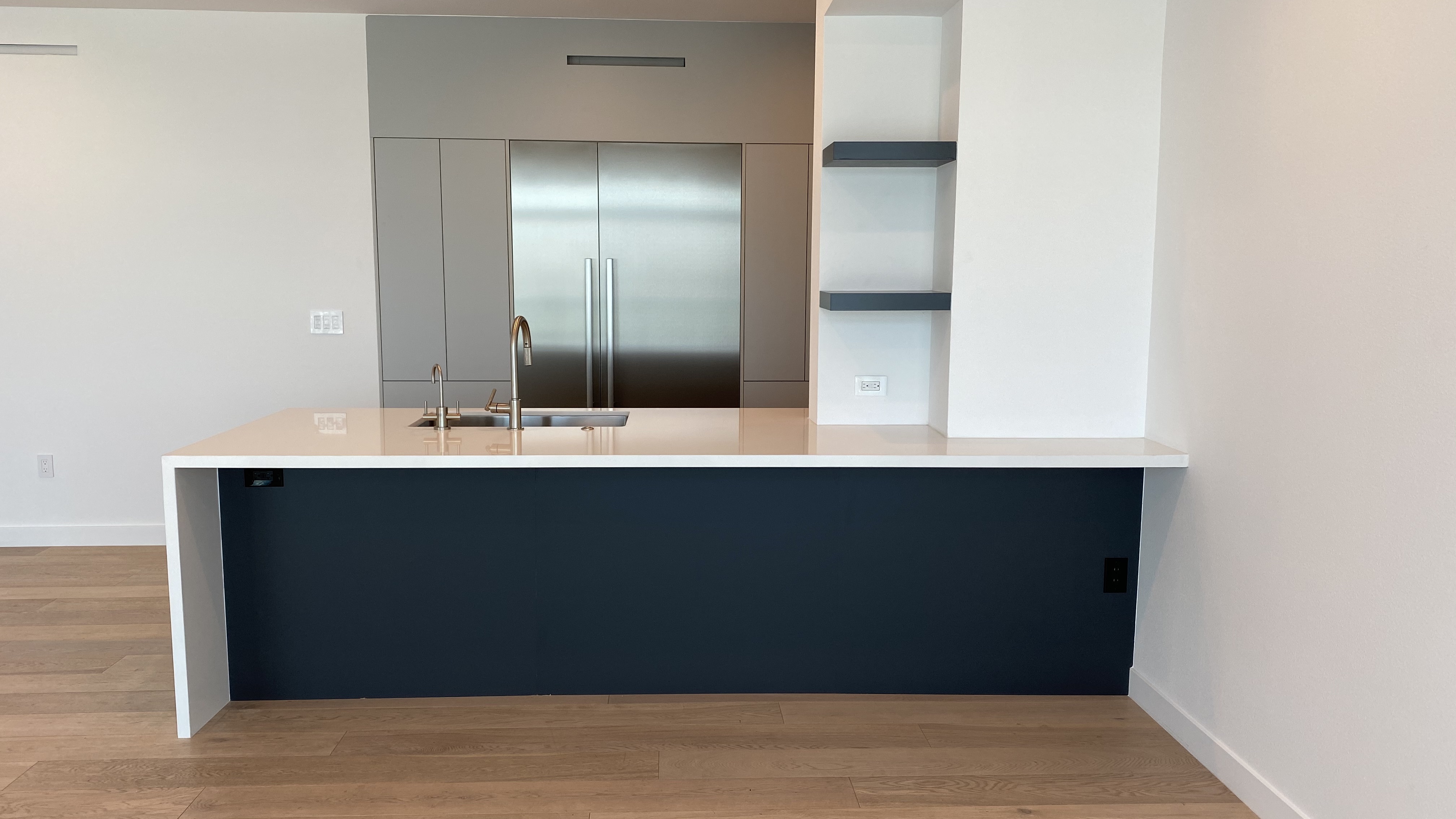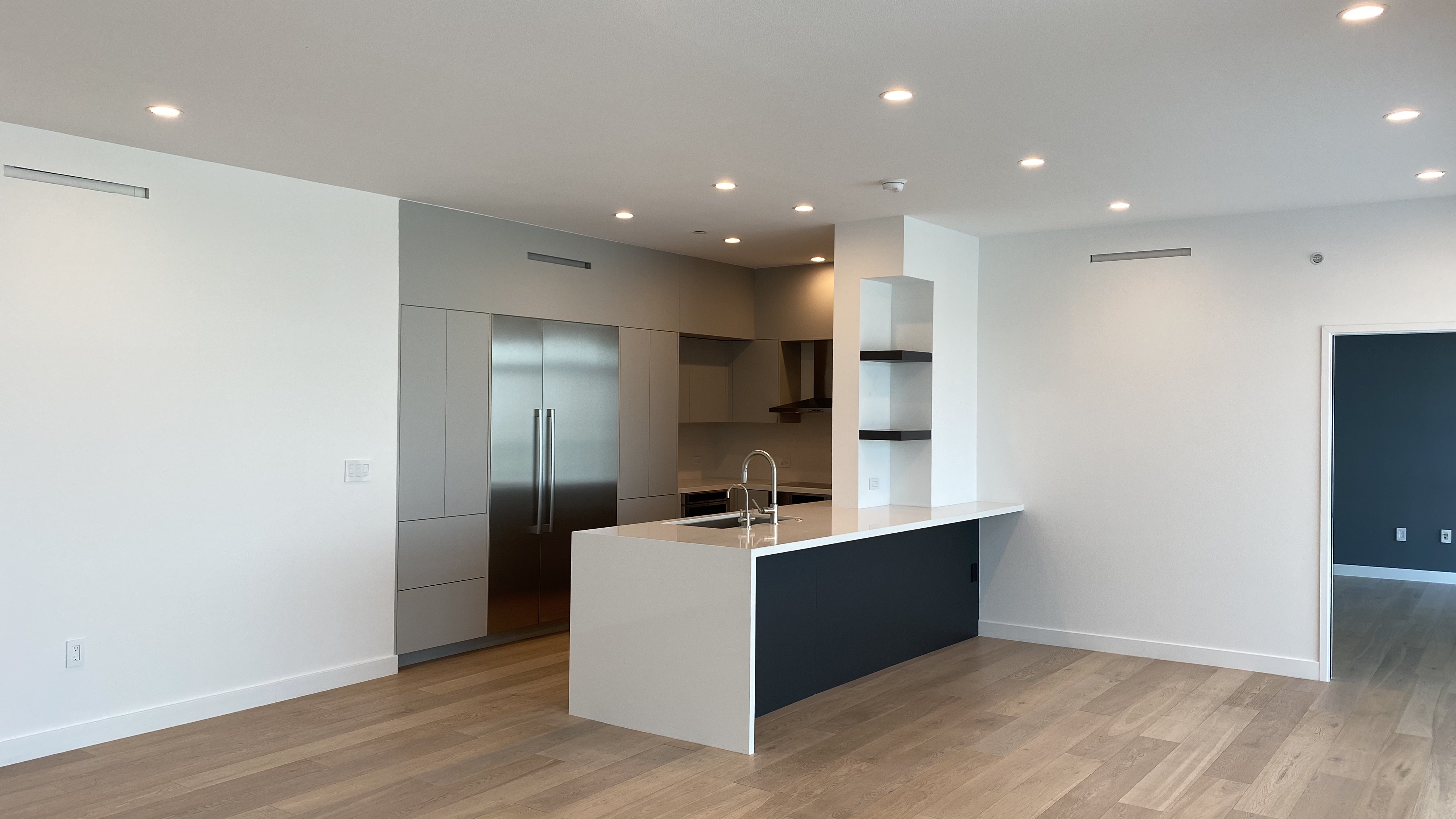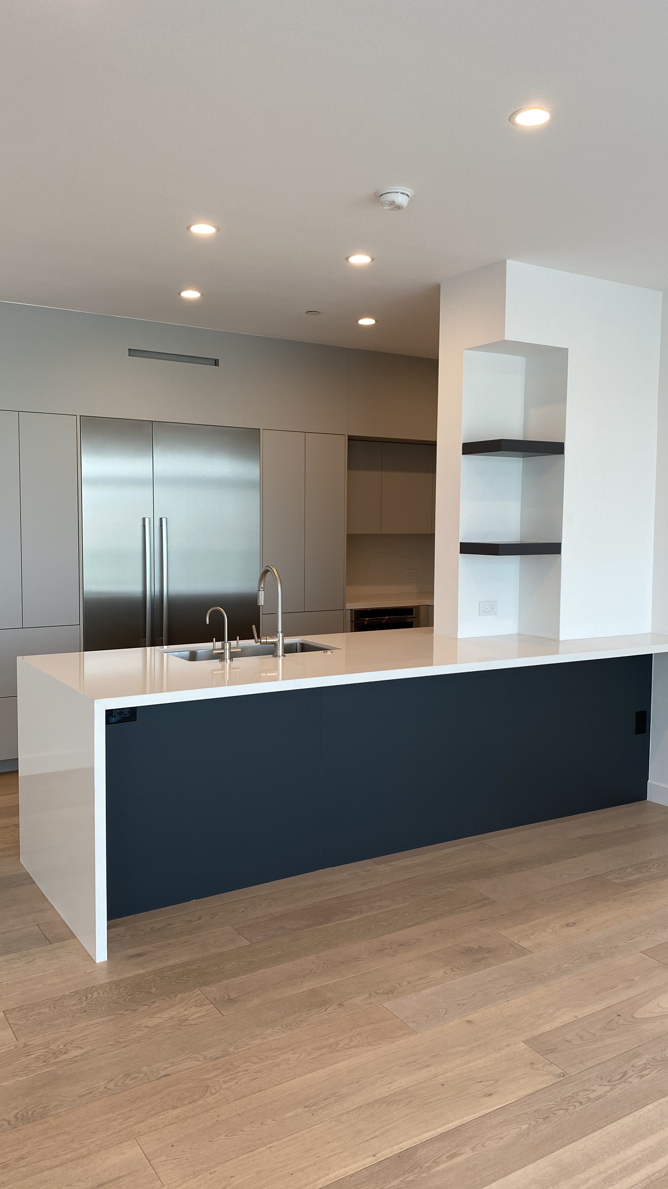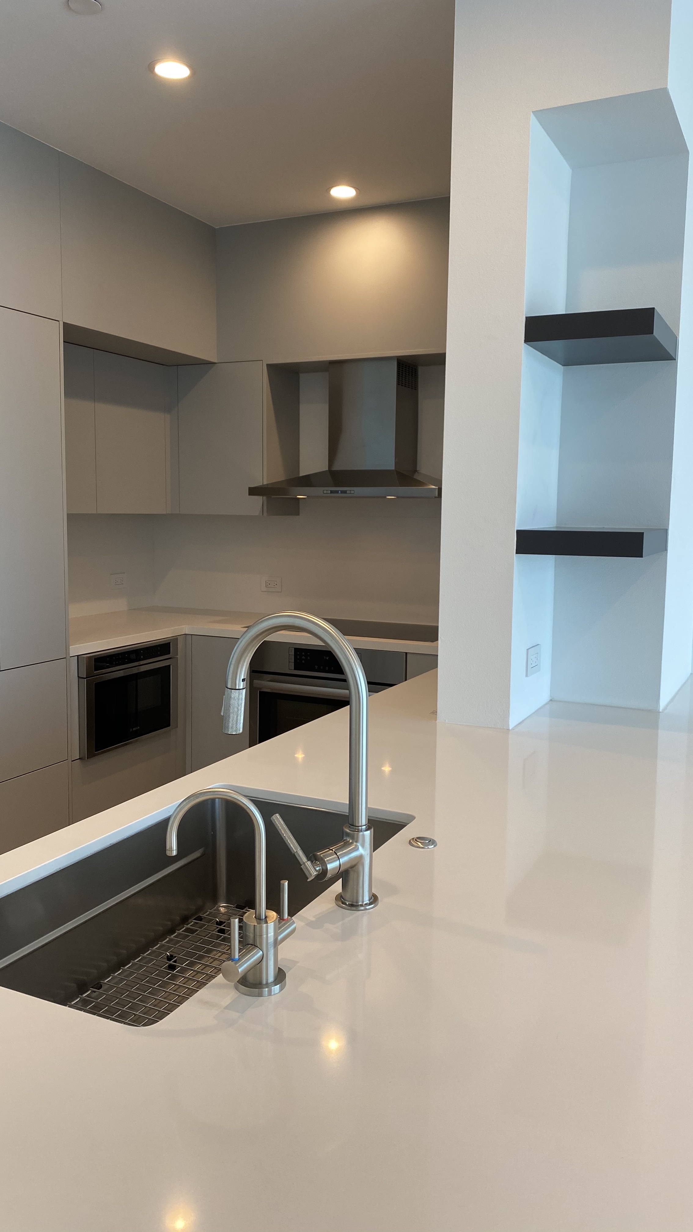 The kitchen was rebuilt with custom two-tone lacquer cabinetry — crisp white paired with soft gray — creating depth without visual noise. The millwork was fabricated for seamless integration, concealing storage while maintaining sharp geometry. Custom quartzite countertops introduce organic movement against the lacquered surfaces, balancing polish with texture. Stainless steel appliances were carefully integrated to preserve the linear aesthetic while delivering high performance.