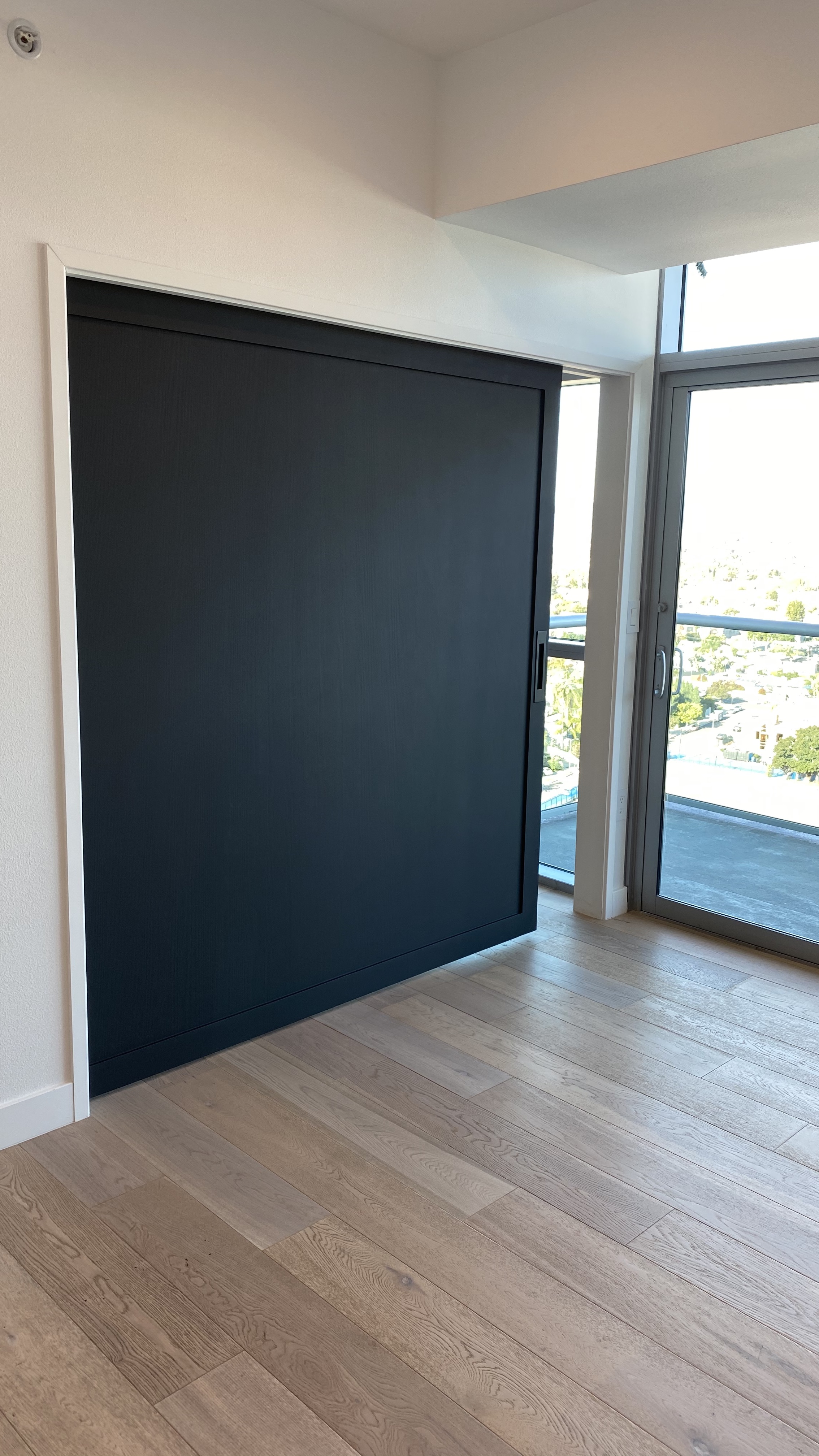 One of the defining architectural features is the oversized pocket door divider. Designed to create flexibility between the guest bedroom and living area, it allows the space to transition from private retreat to open-plan entertaining environment in seconds — an intentional response to modern condo living.