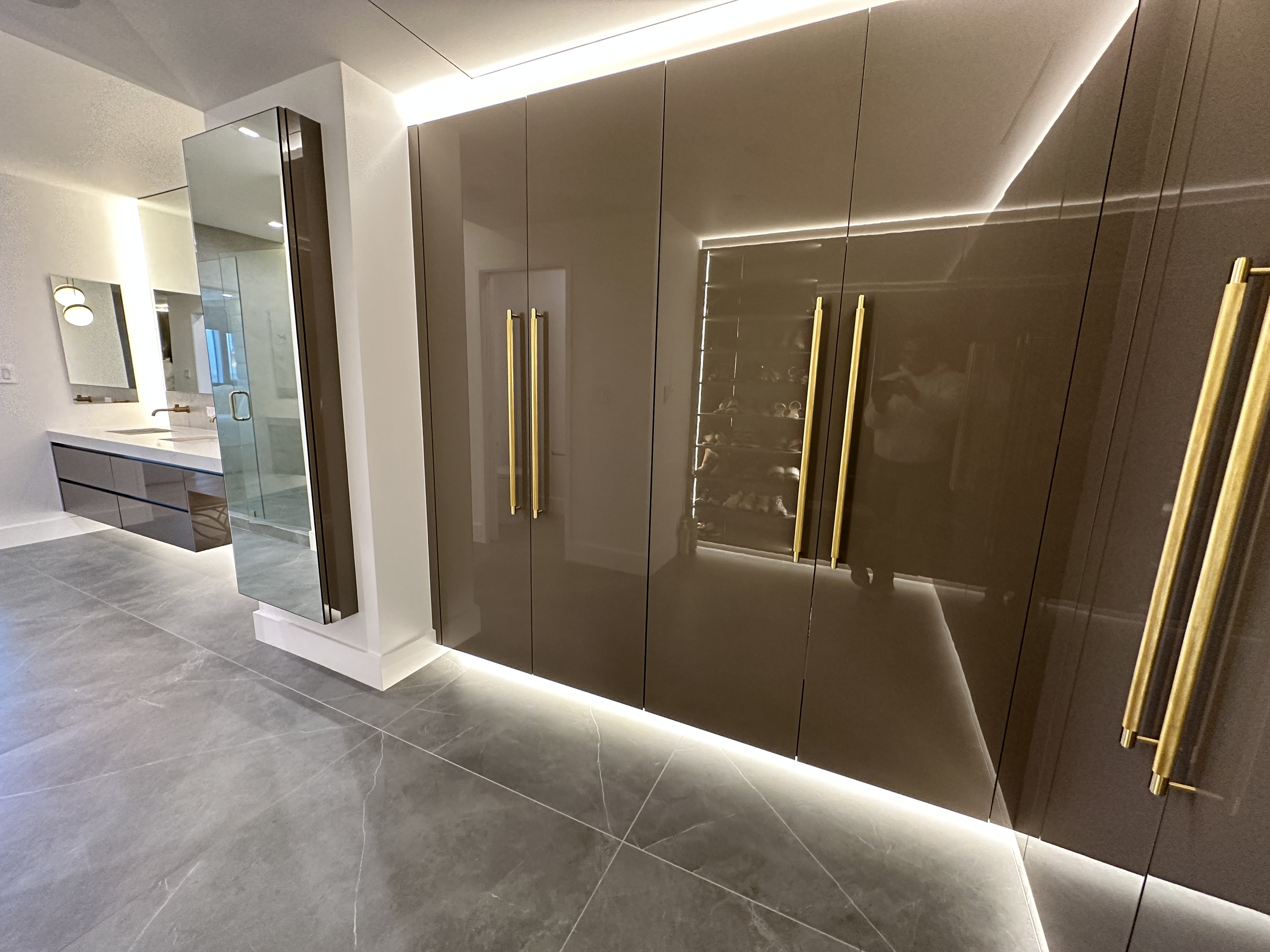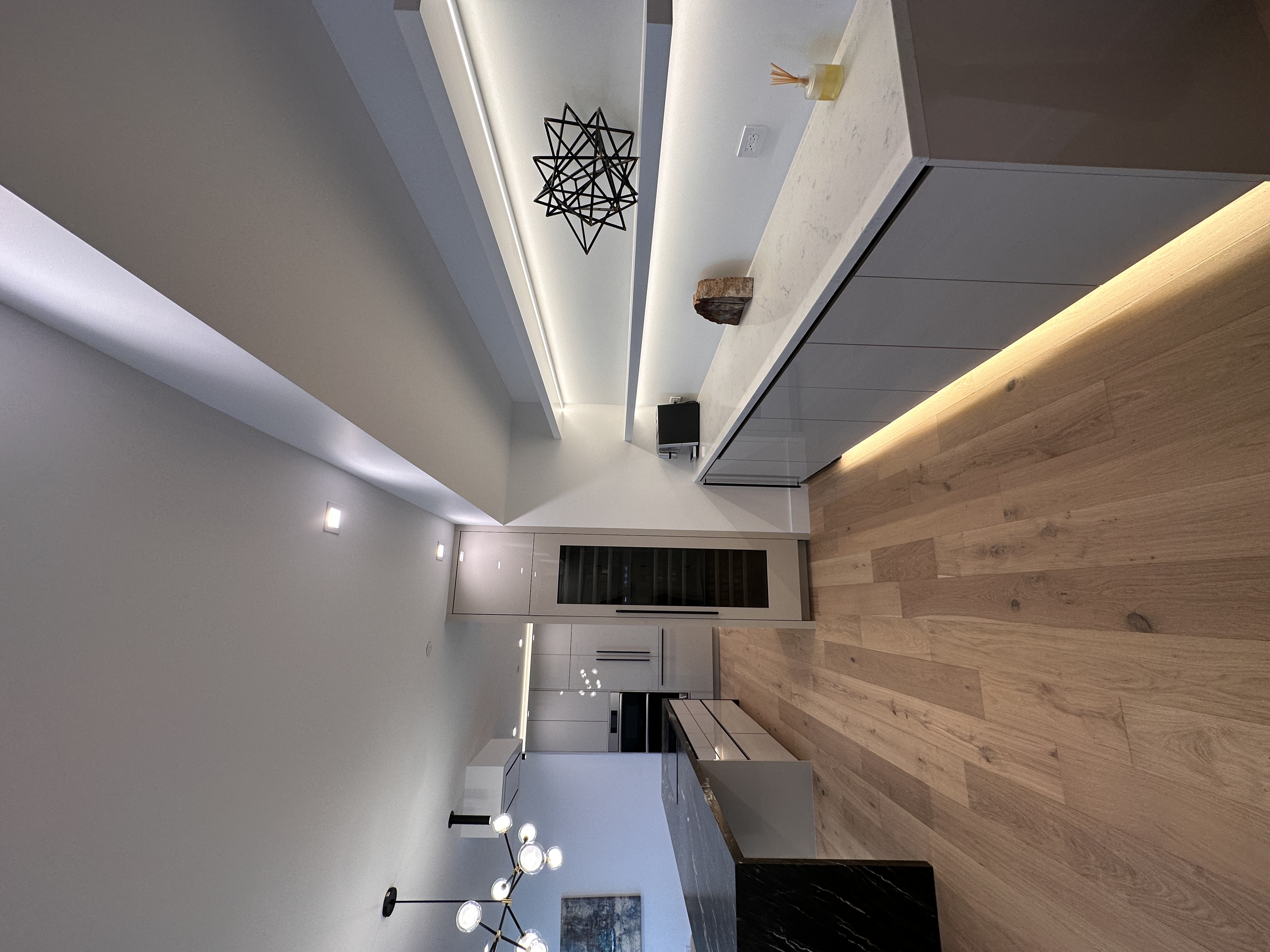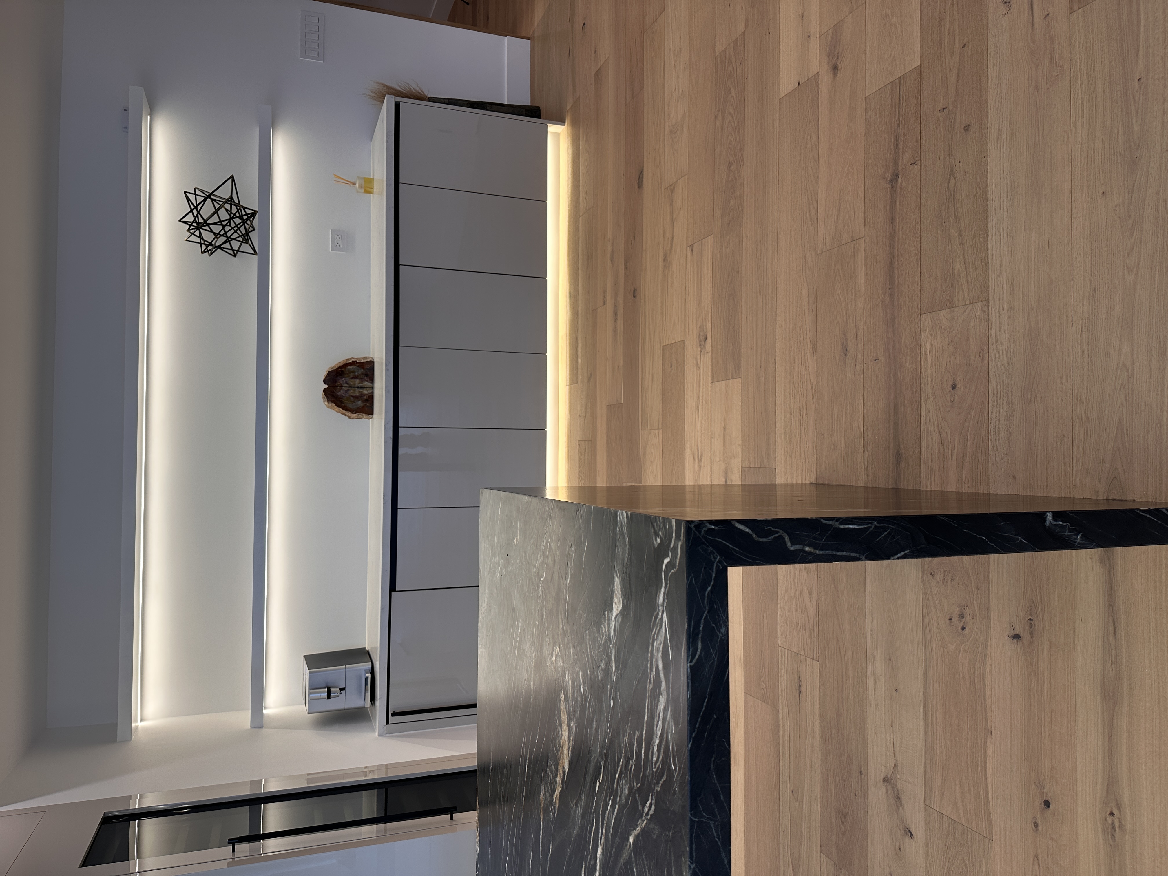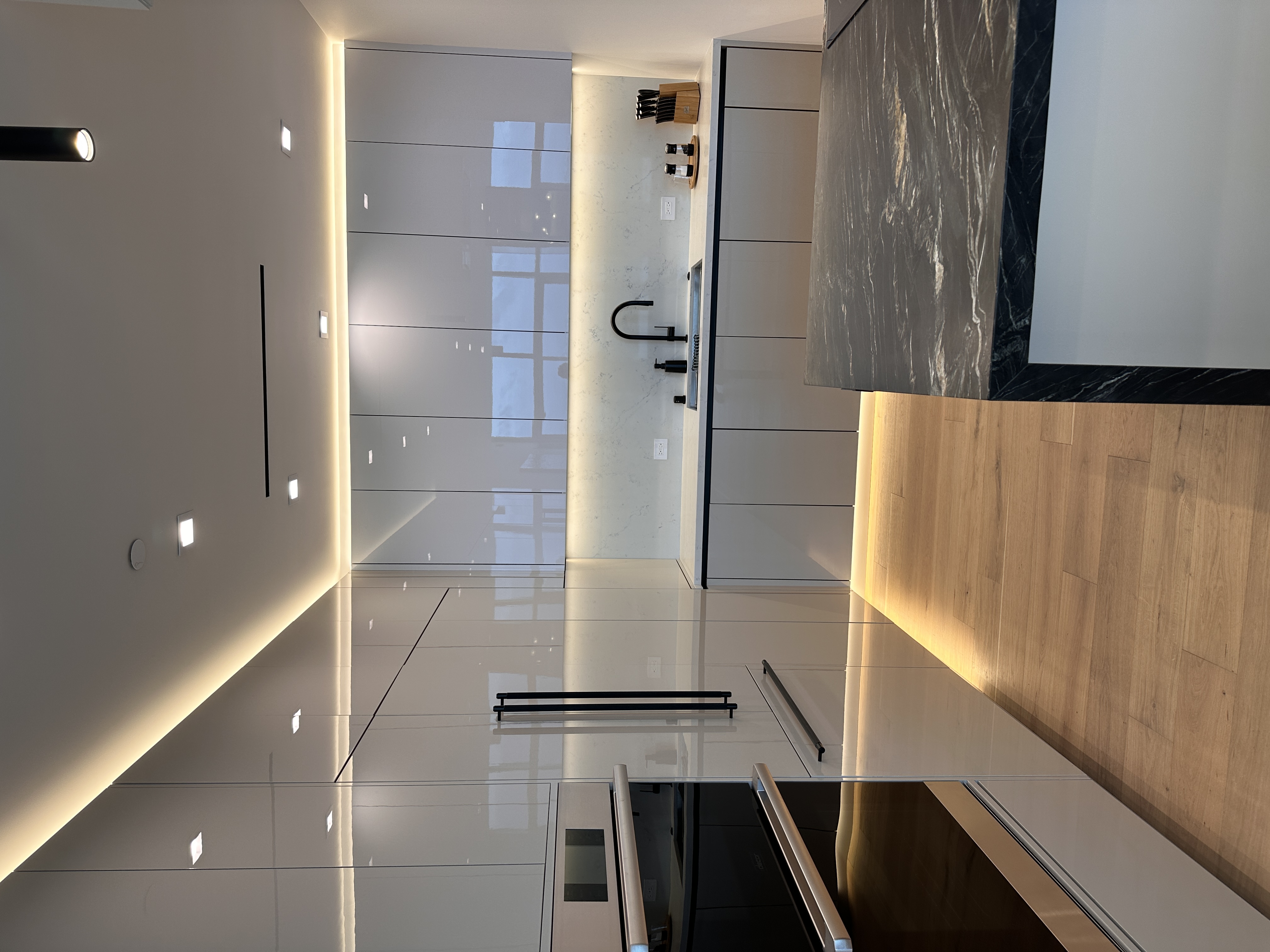 White oak wide-plank floors add organic texture and balance the cooler finishes, grounding the space with natural warmth. Custom built-ins and flush panel doors showcase precision craftsmanship and minimalistic design, while matte brass accents and contemporary lighting elevate the overall experience. Designed for both beauty and high-performance living, this kitchen exemplifies modern luxury at its most serene.