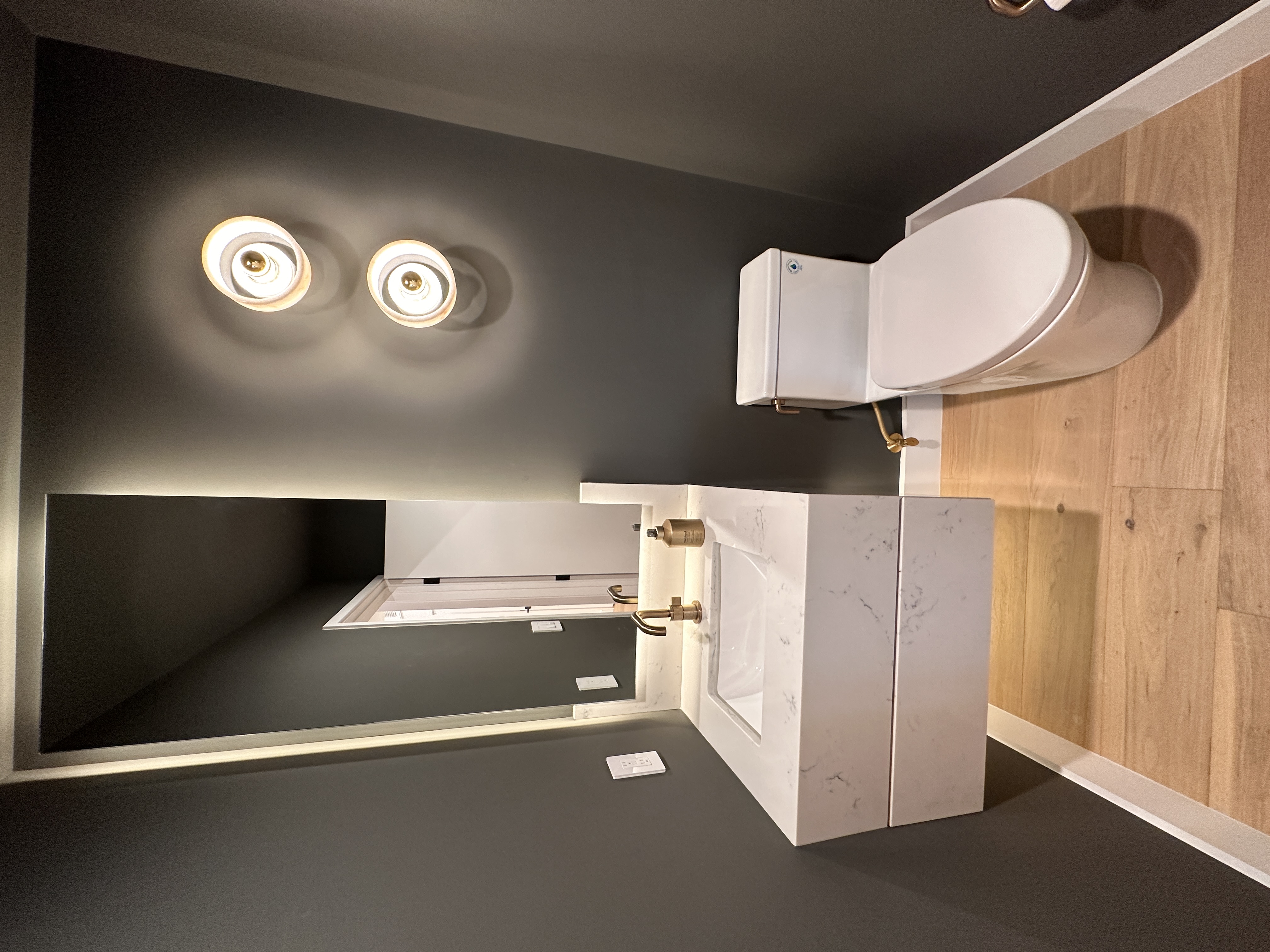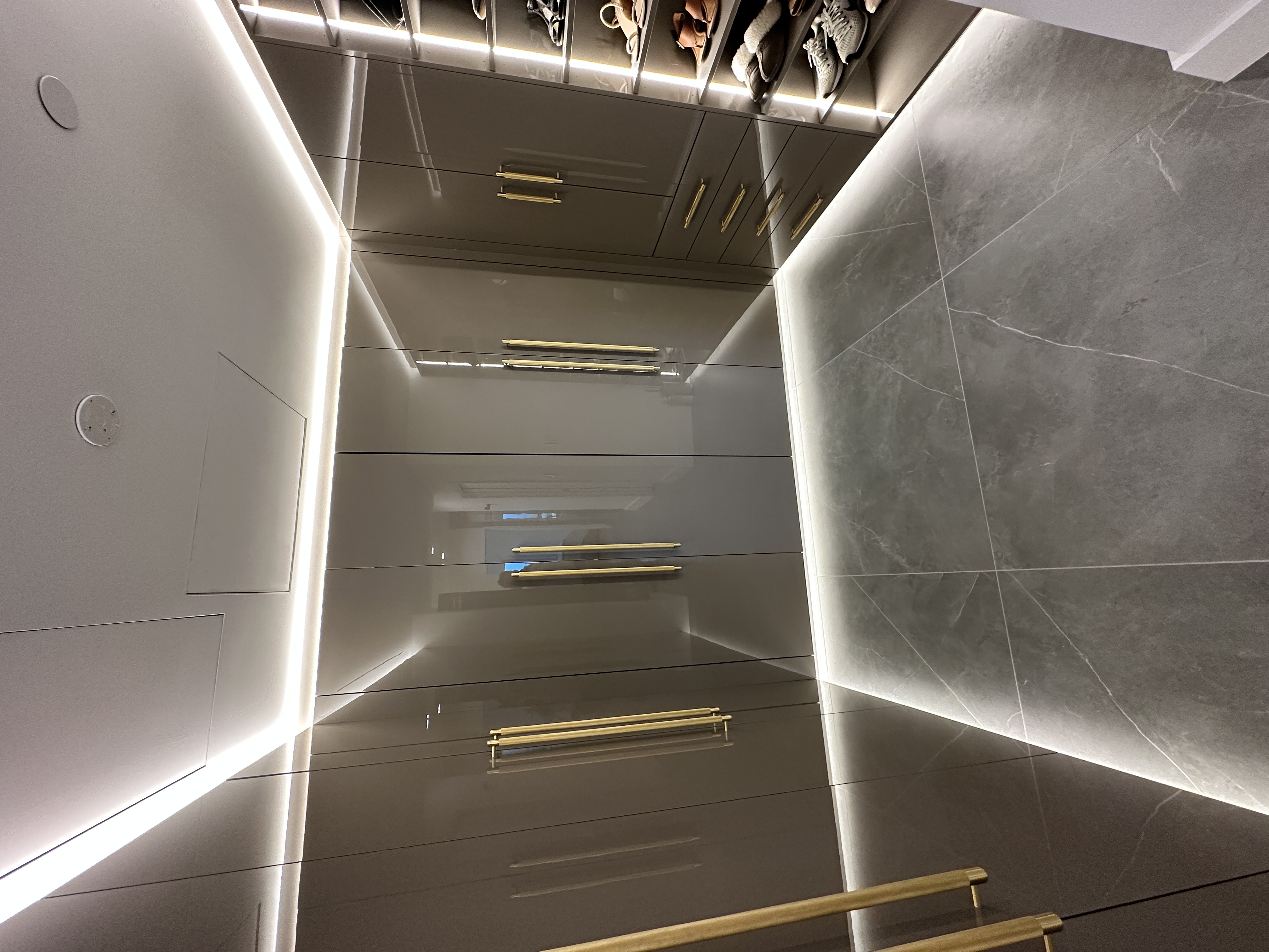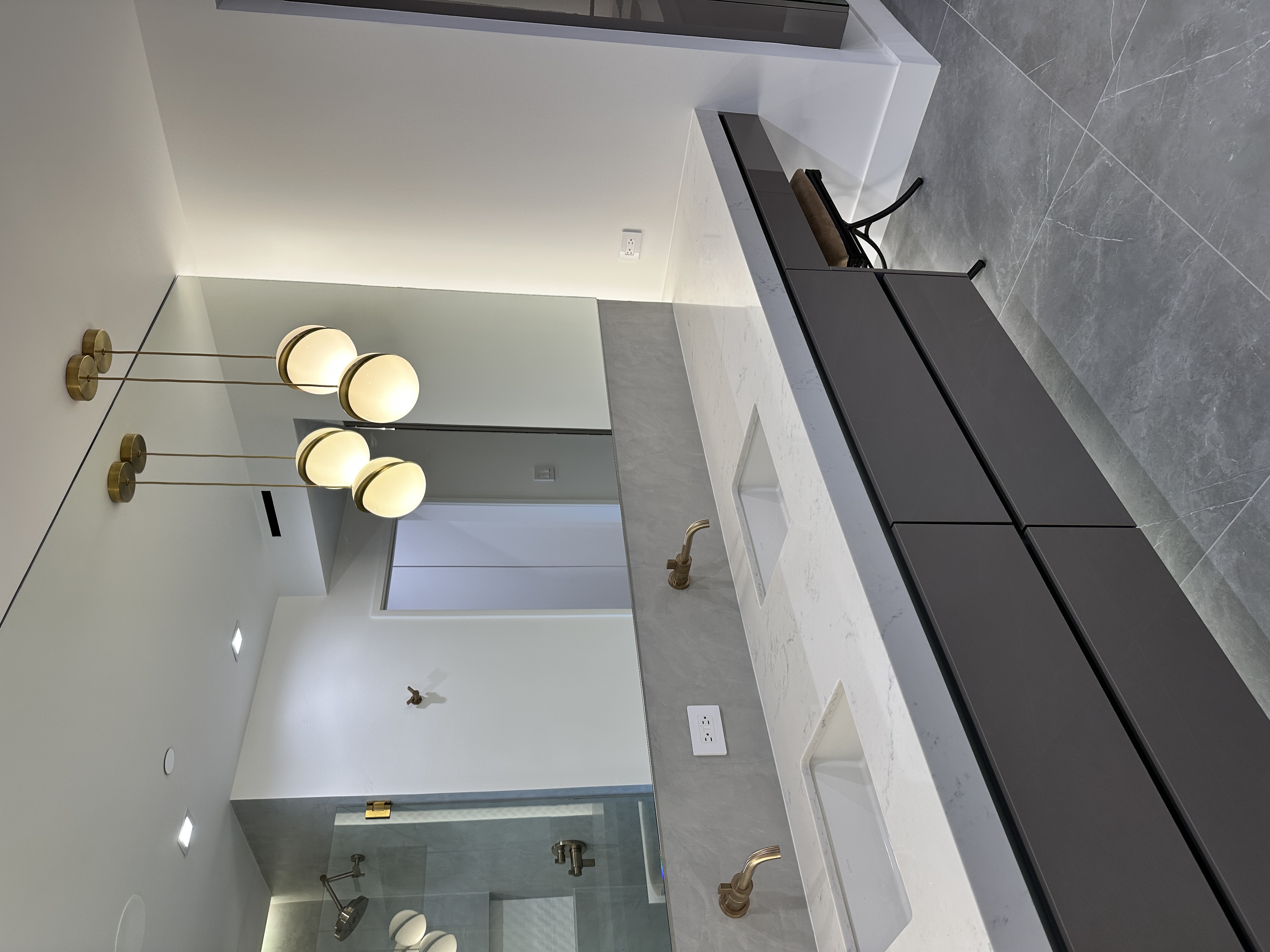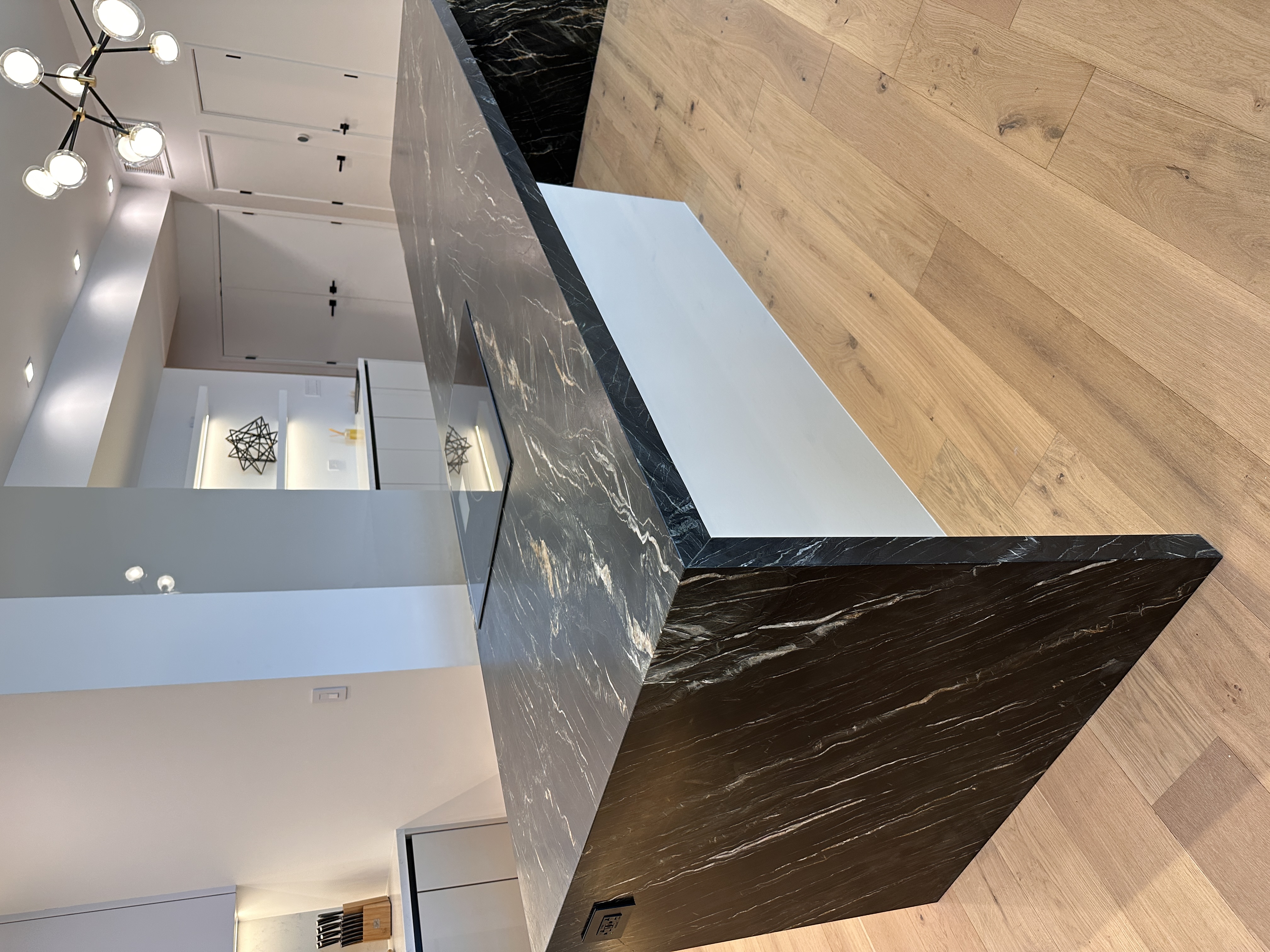 White oak wide-plank floors add organic texture and balance the cooler finishes, grounding the space with natural warmth. Custom built-ins and flush panel doors showcase precision craftsmanship and minimalistic design, while matte brass accents and contemporary lighting elevate the overall experience. Designed for both beauty and high-performance living, this kitchen exemplifies modern luxury at its most serene.