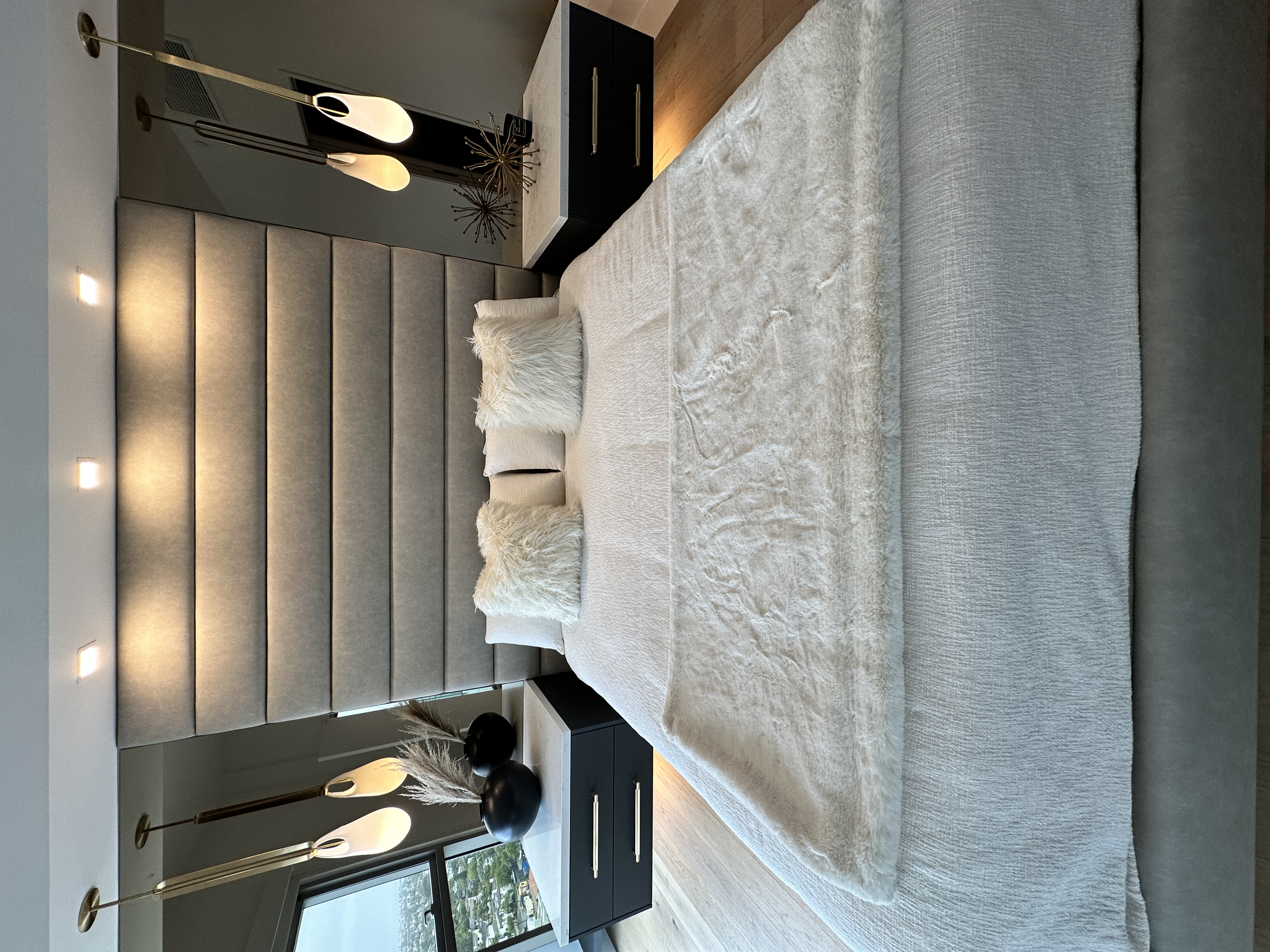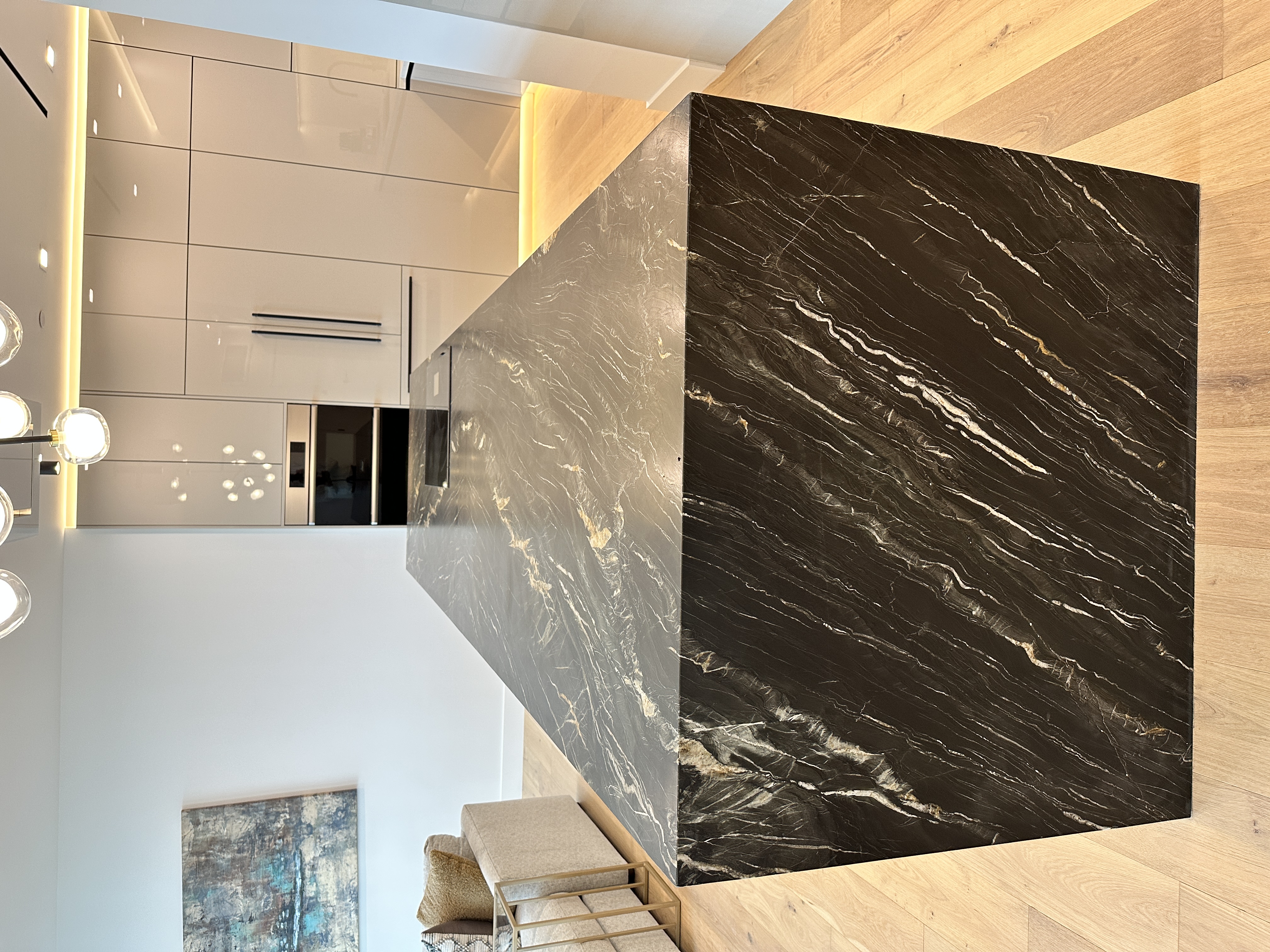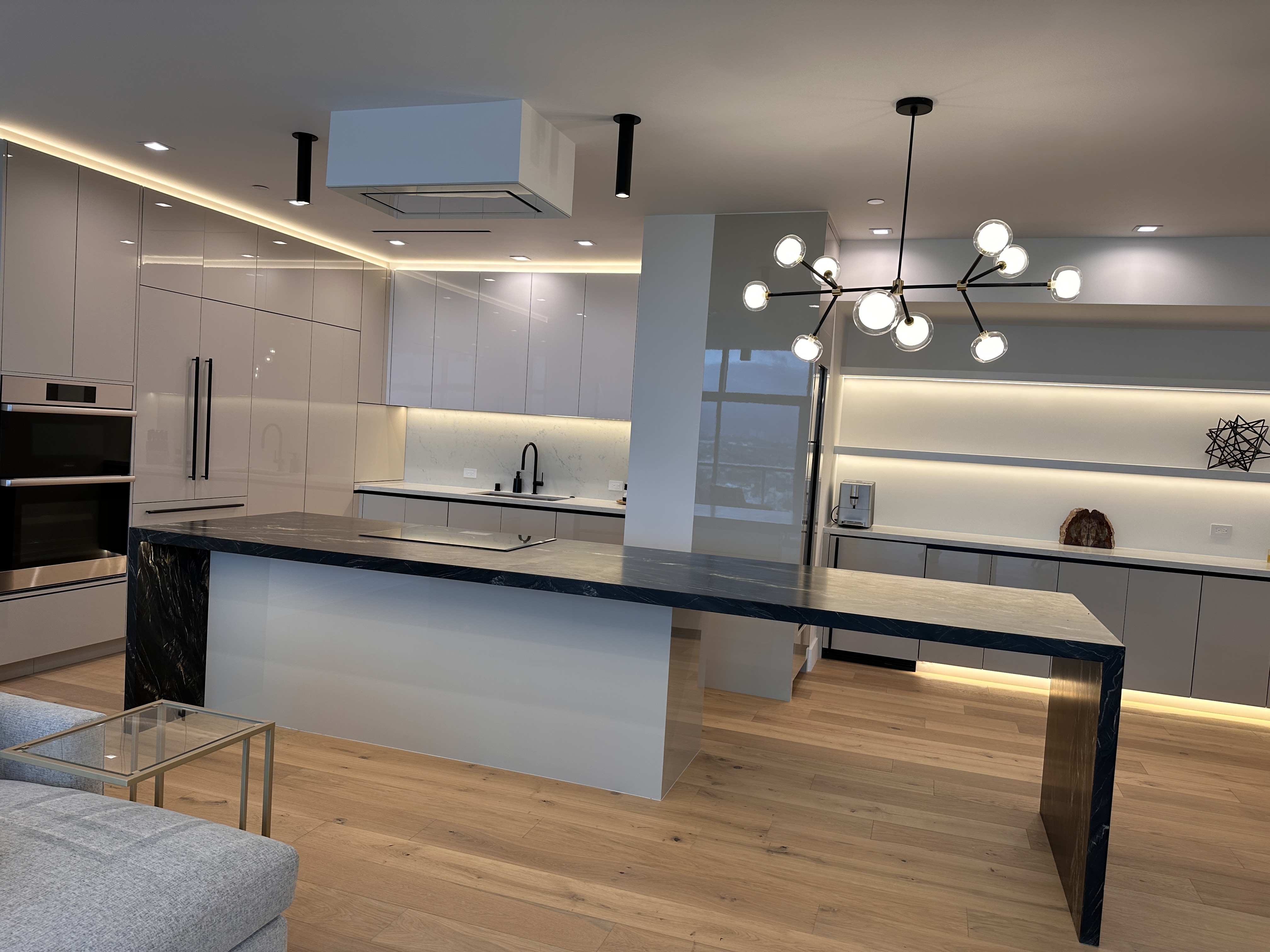 This refined penthouse kitchen blends coastal serenity with metropolitan sophistication. At its heart, a dramatic black quartzite island with striking waterfall edges anchors the open space, offering both sculptural presence and functional elegance. Sleek, high-gloss acrylic cabinetry in soft gray tones reflects ambient light, while integrated lighting under the floating shelves and base cabinets creates a warm, gallery-like atmosphere.