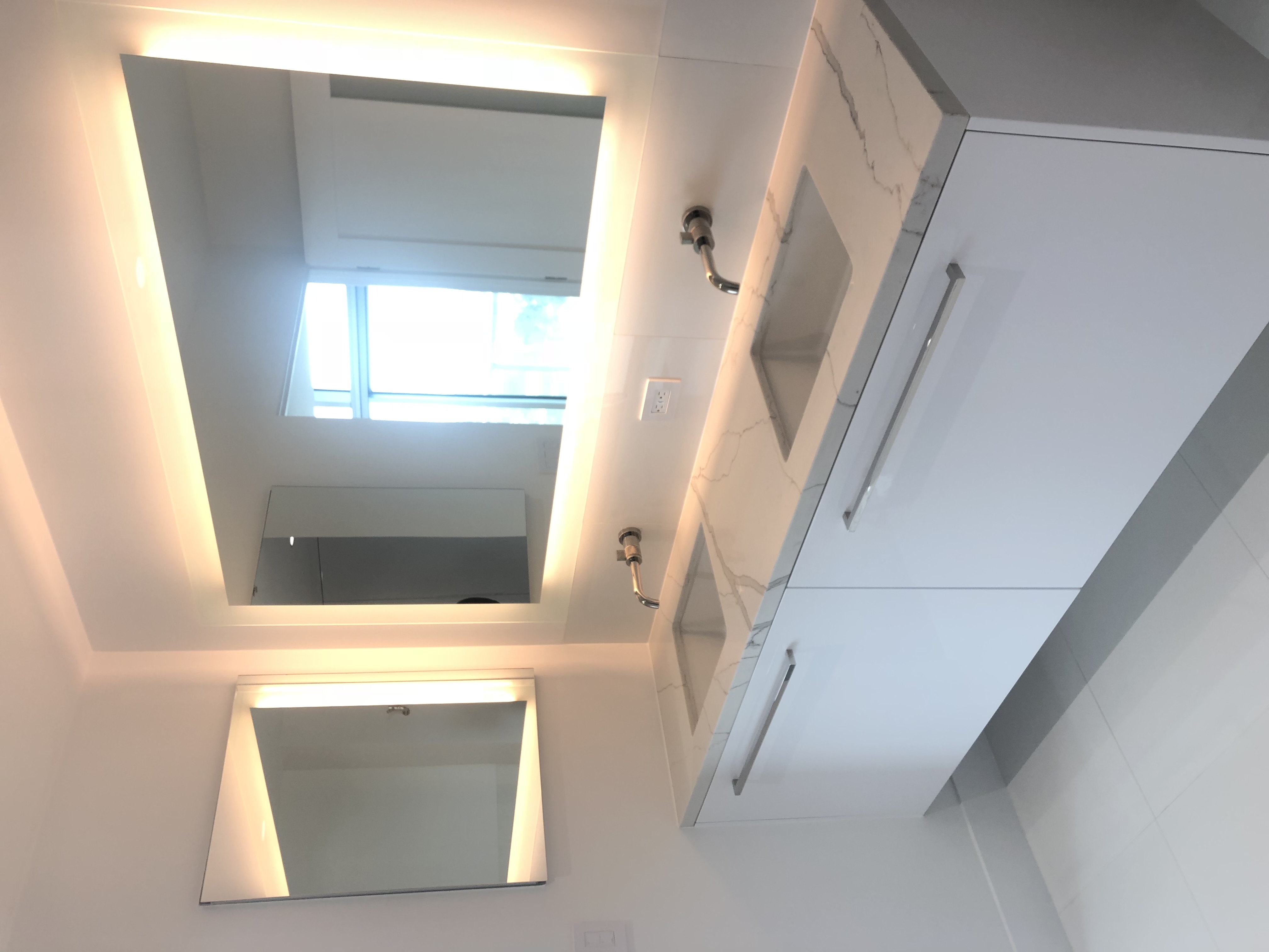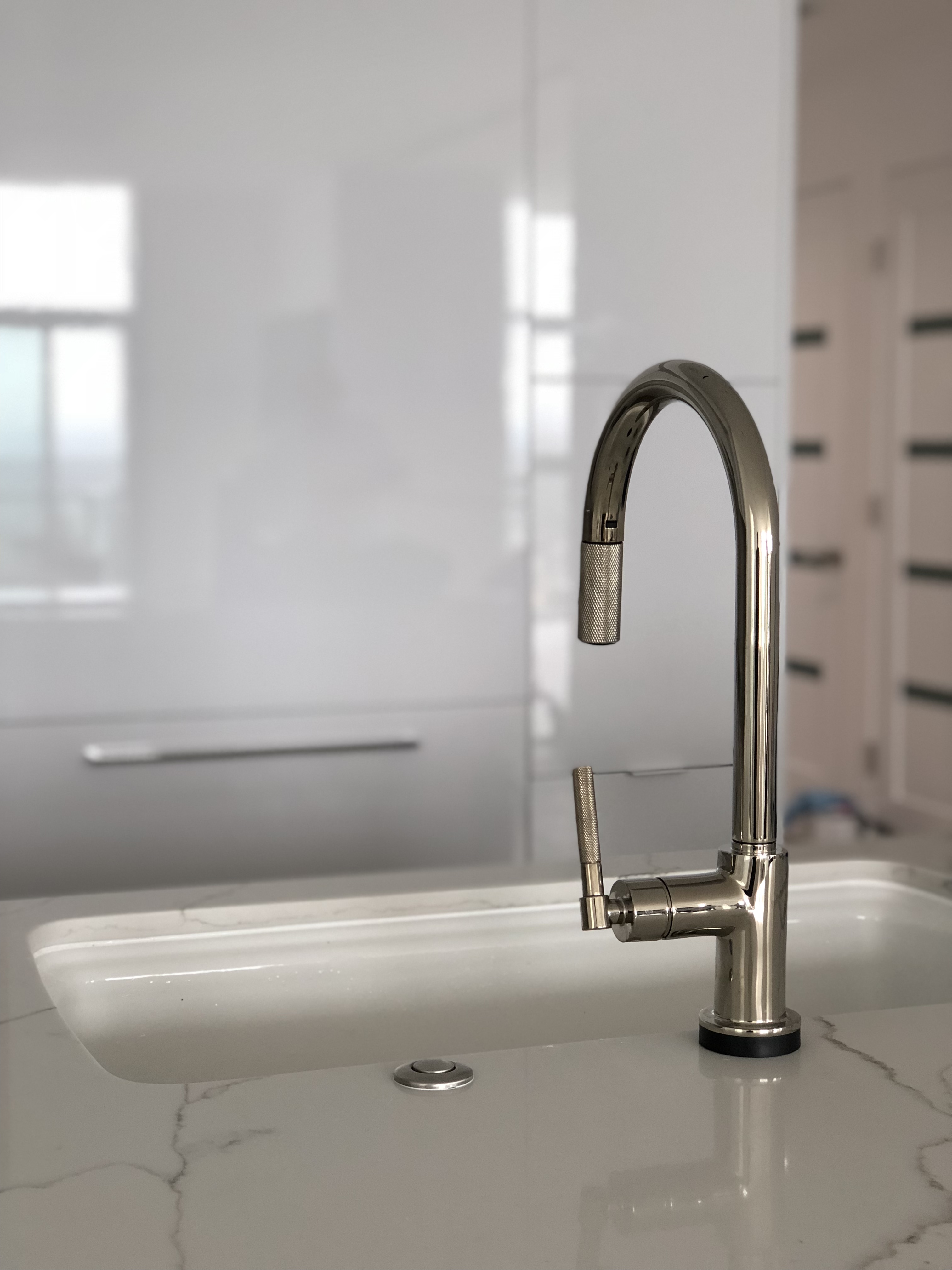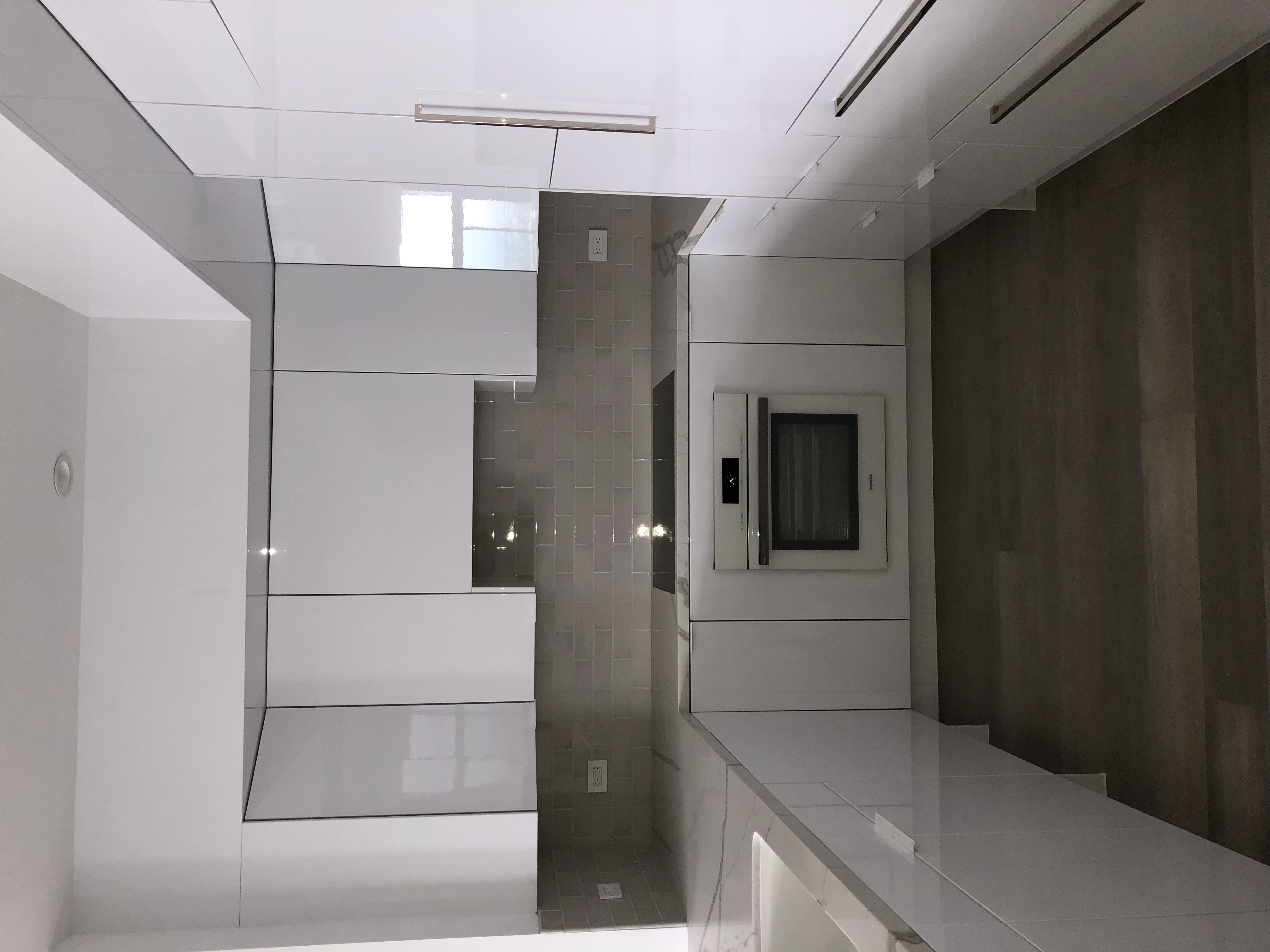 The kitchen was rebuilt with high-gloss white lacquer cabinetry, fabricated for seamless integration and clean geometry. Neutral quartz countertops were selected for their quiet movement and durability, creating a soft contrast against the reflective millwork. Fully integrated Miele appliances maintain the uninterrupted lines of the cabinetry, reinforcing the modern aesthetic without visual clutter.