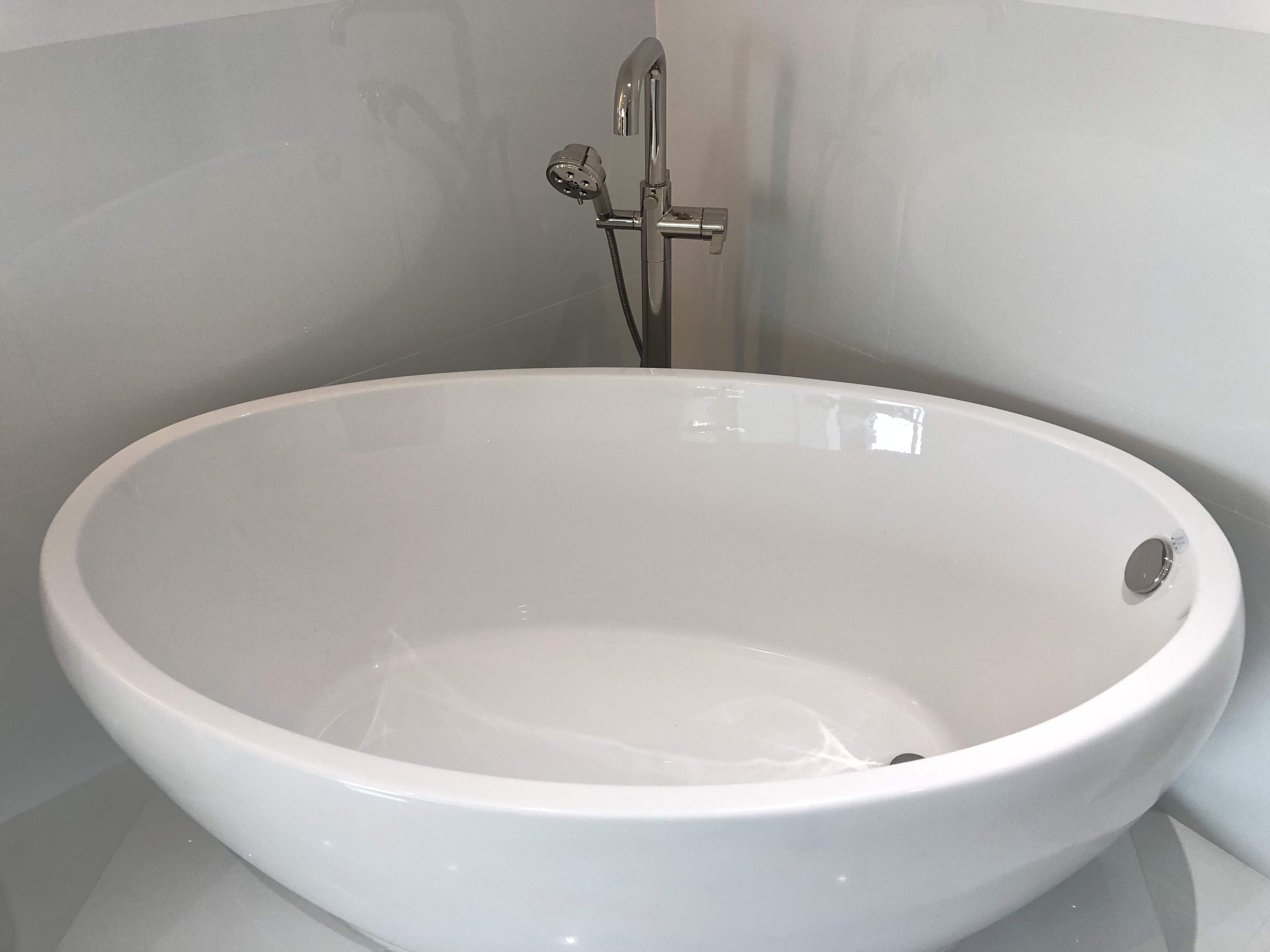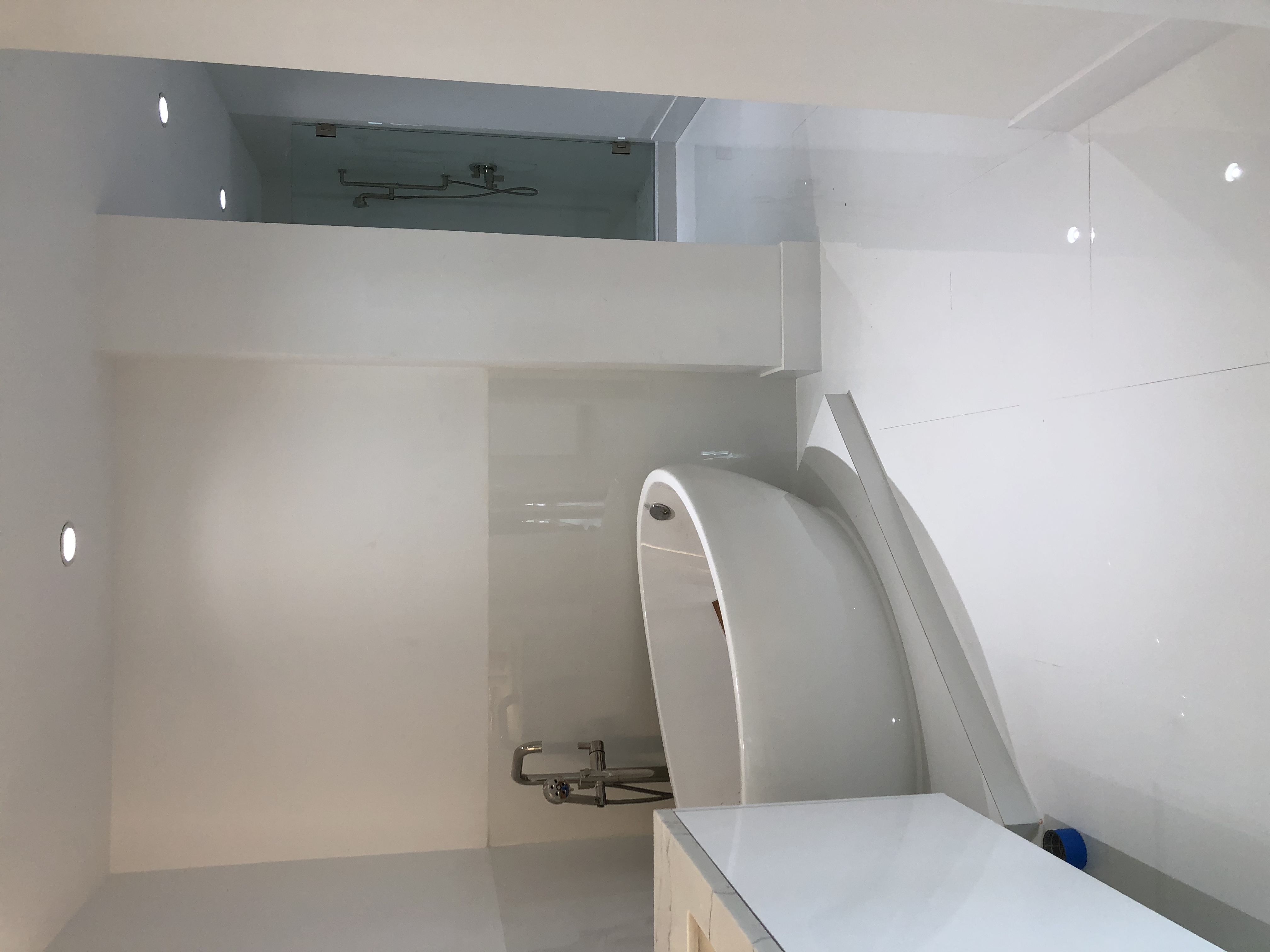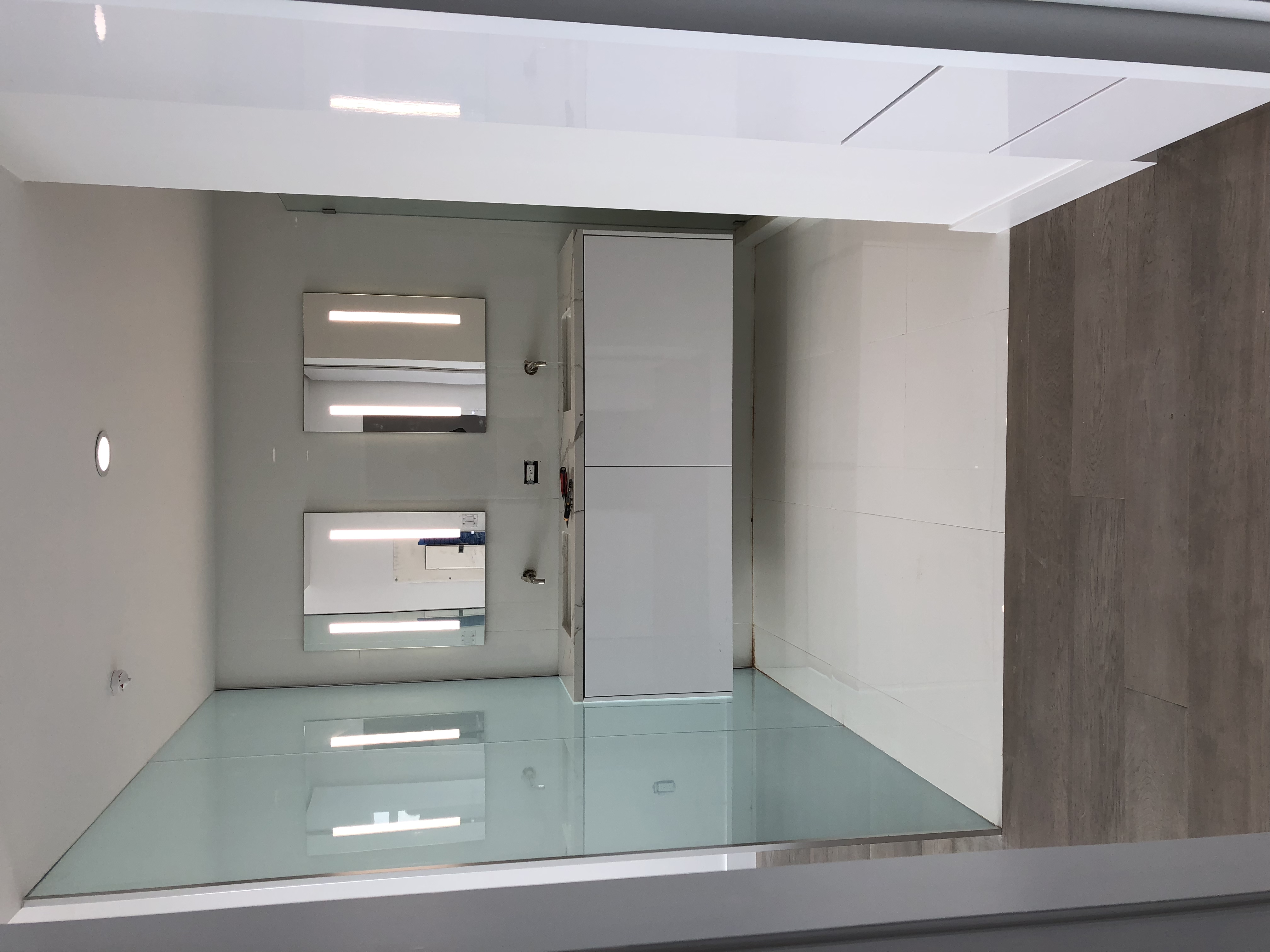 One of the defining architectural moves of the penthouse is the glass divider between the primary bedroom and bathroom — a transparent transition that expands sight lines and introduces a boutique-hotel sensibility. Designer Porcelanosa tiles wrap the bathroom surfaces, delivering texture and depth while preserving the project’s cohesive tone.
