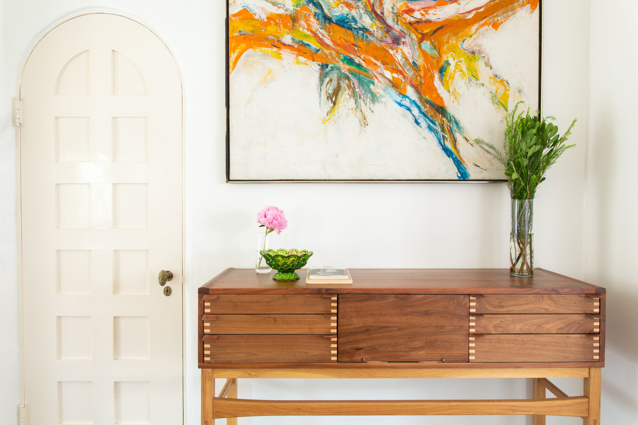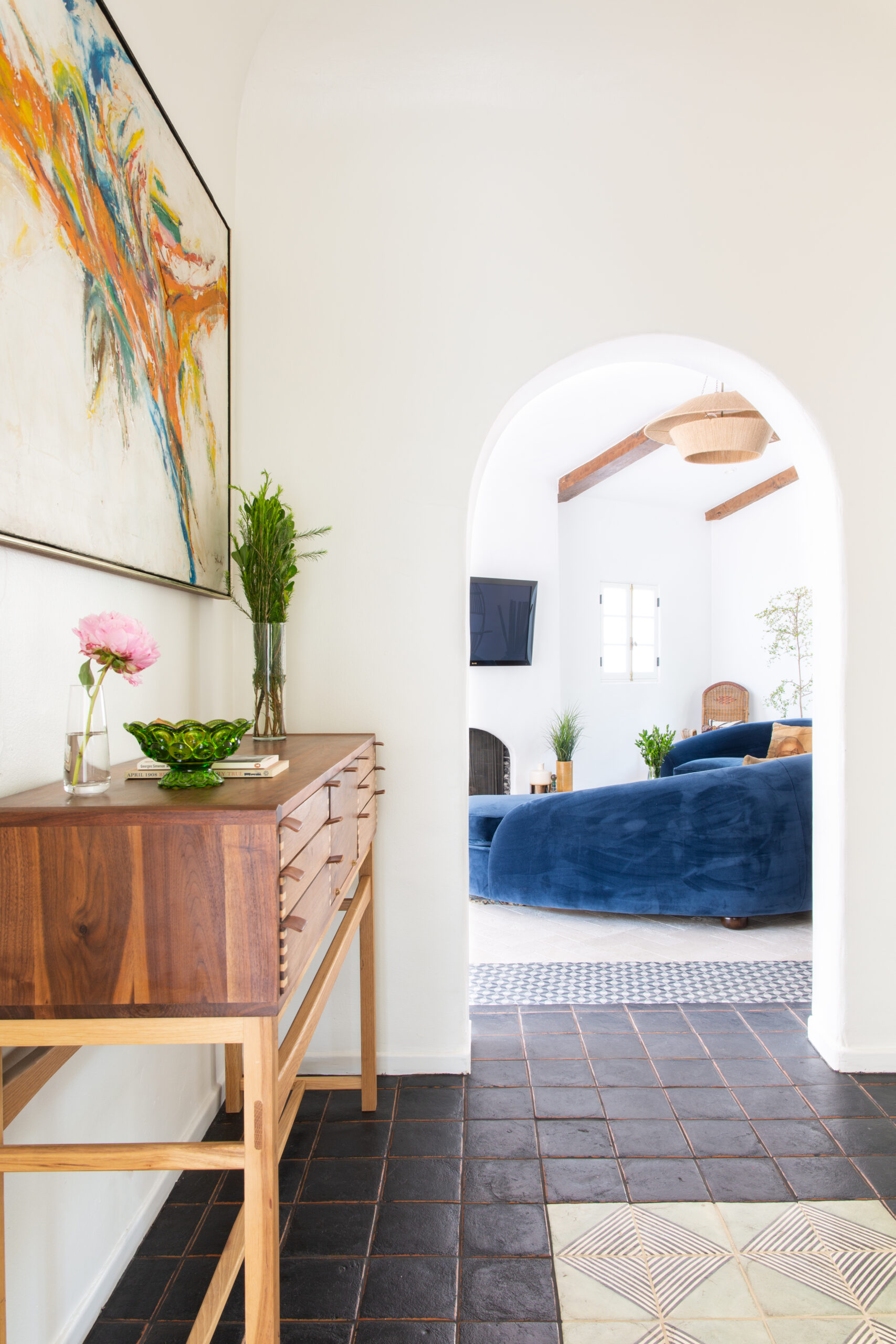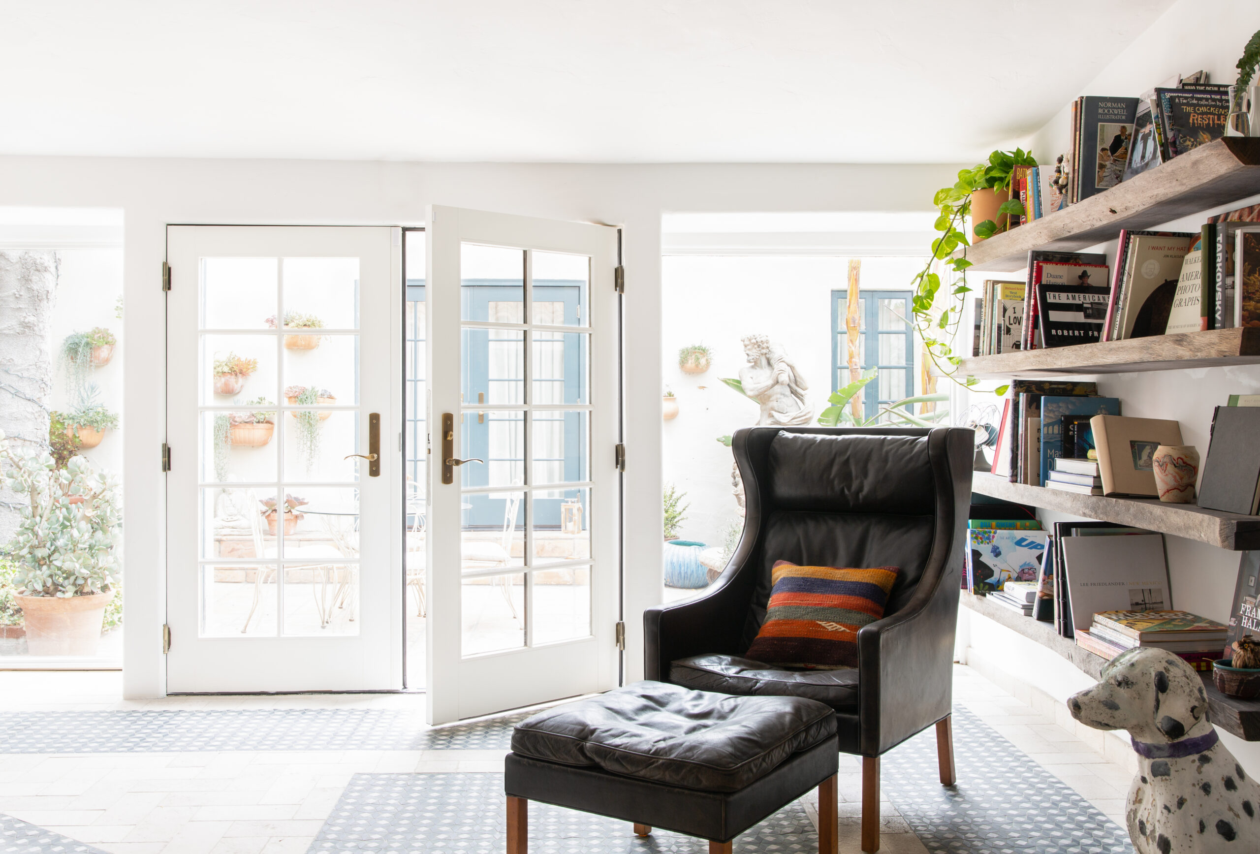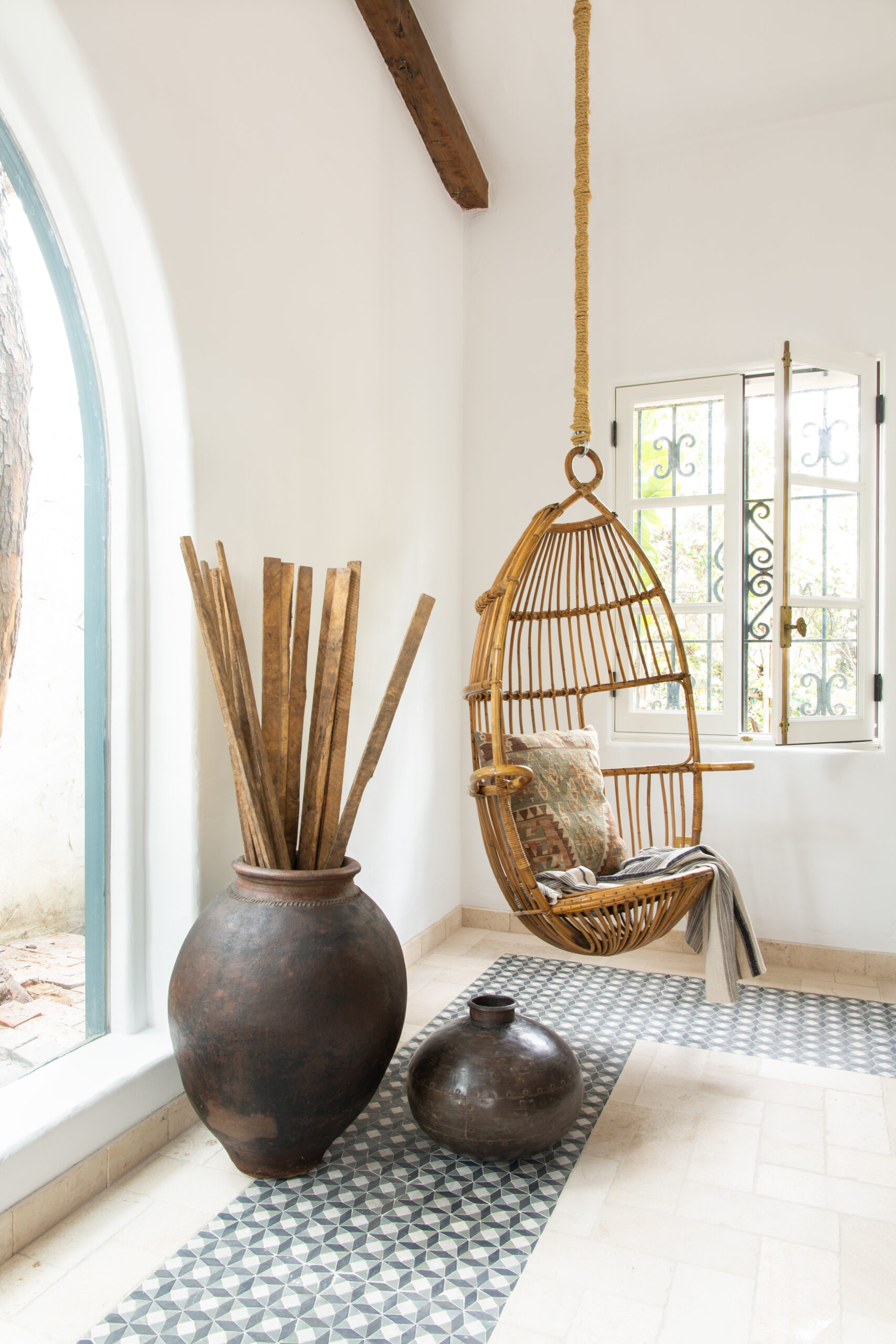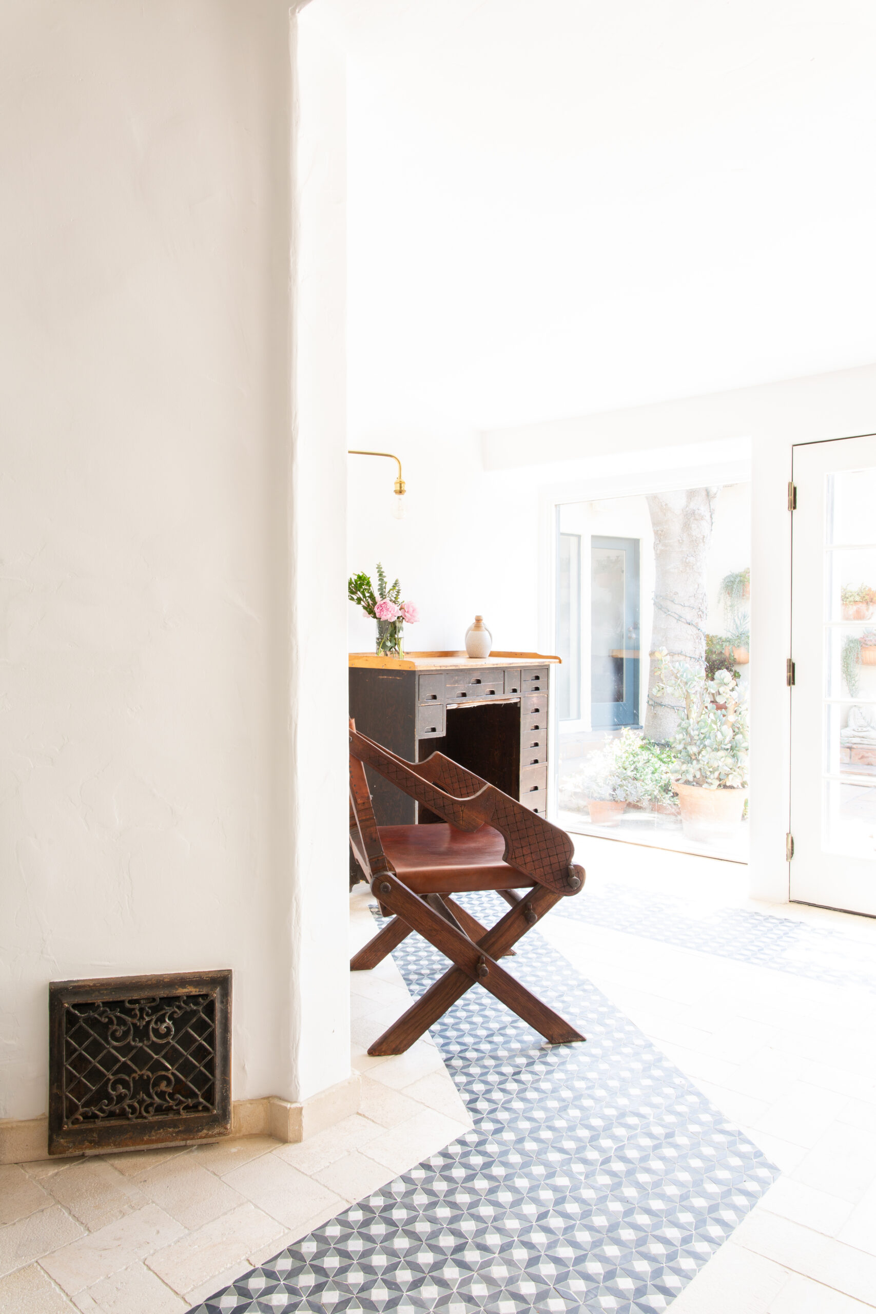 At the highest level of discretion, in the center of Hancock Park, concealed by masterfully curated shrubbery, hedges, and giant birds of paradise, the hidden gem of an acclaimed Hollywood Director is revealed. The creative lead directed by Mandy Cheng Design, in this unveiled oasis with custom white adobe interior walls, antiqued cement tiles masterfully laid by the tiles specialists from LADB, invites the creative minds to unwind and decompress. Bespoke Premium Grade Wood Framed French Doors and Swing Windows and the custom-built Arched windows overlooking the center courtyard provide a fluid movement, moving you from one end of the home to the other, summoning the days of yesteryear and old Hollywood.
