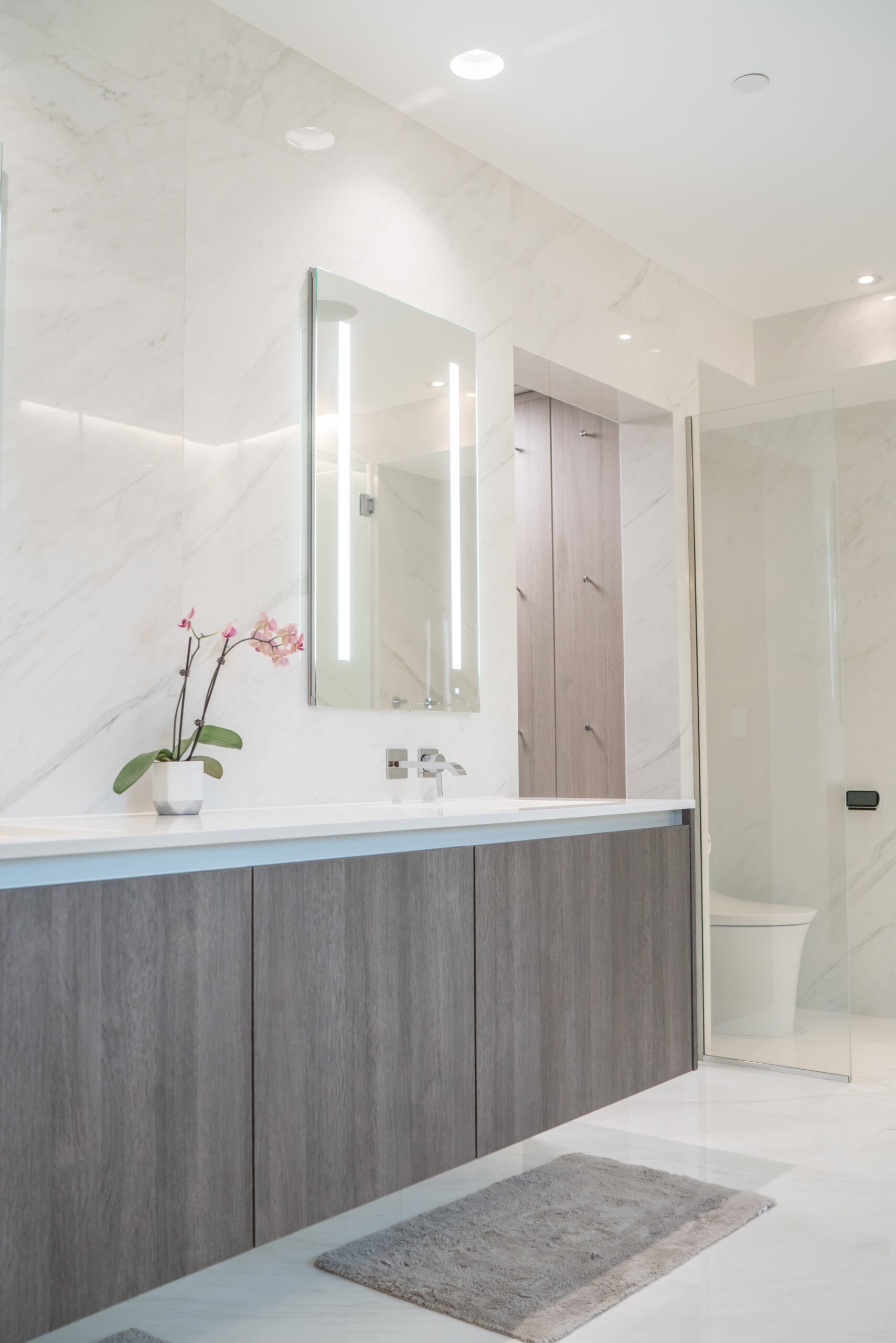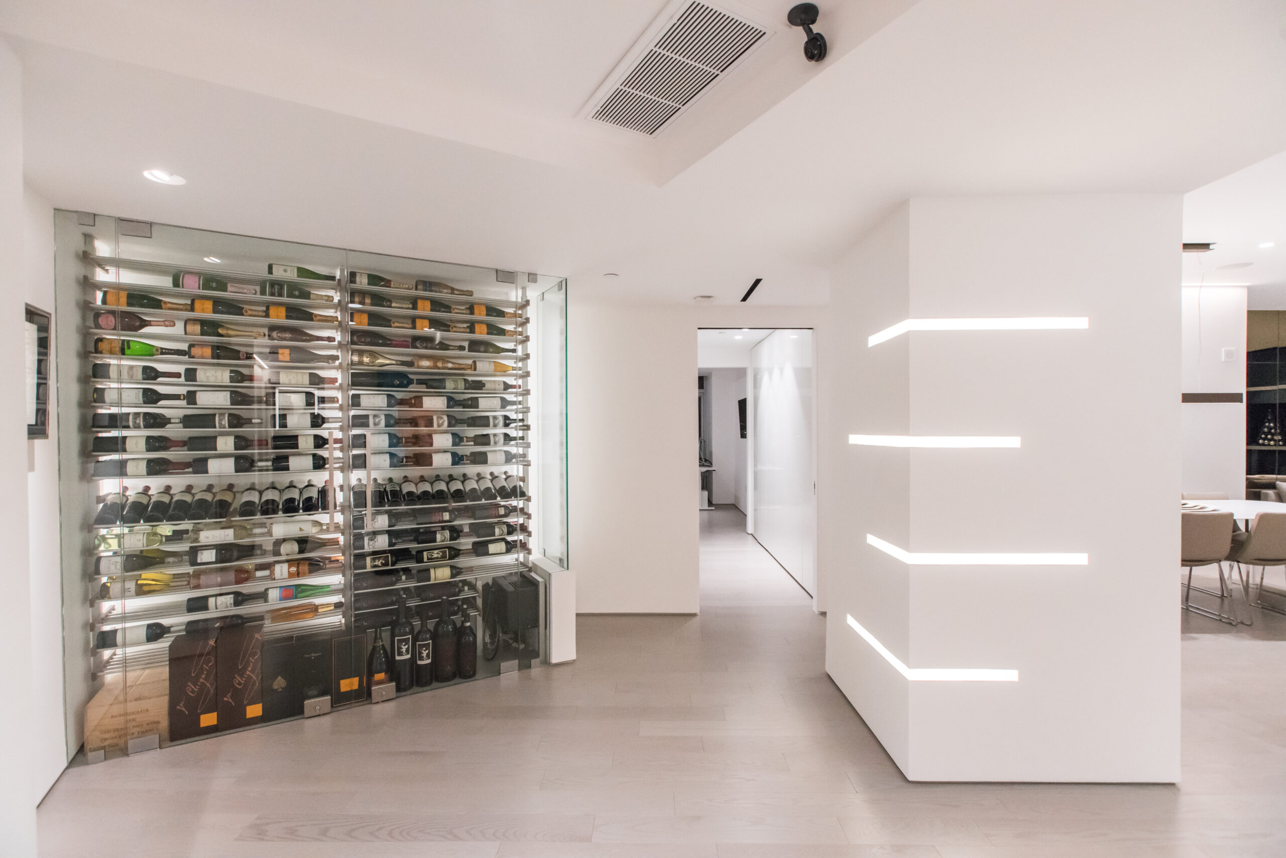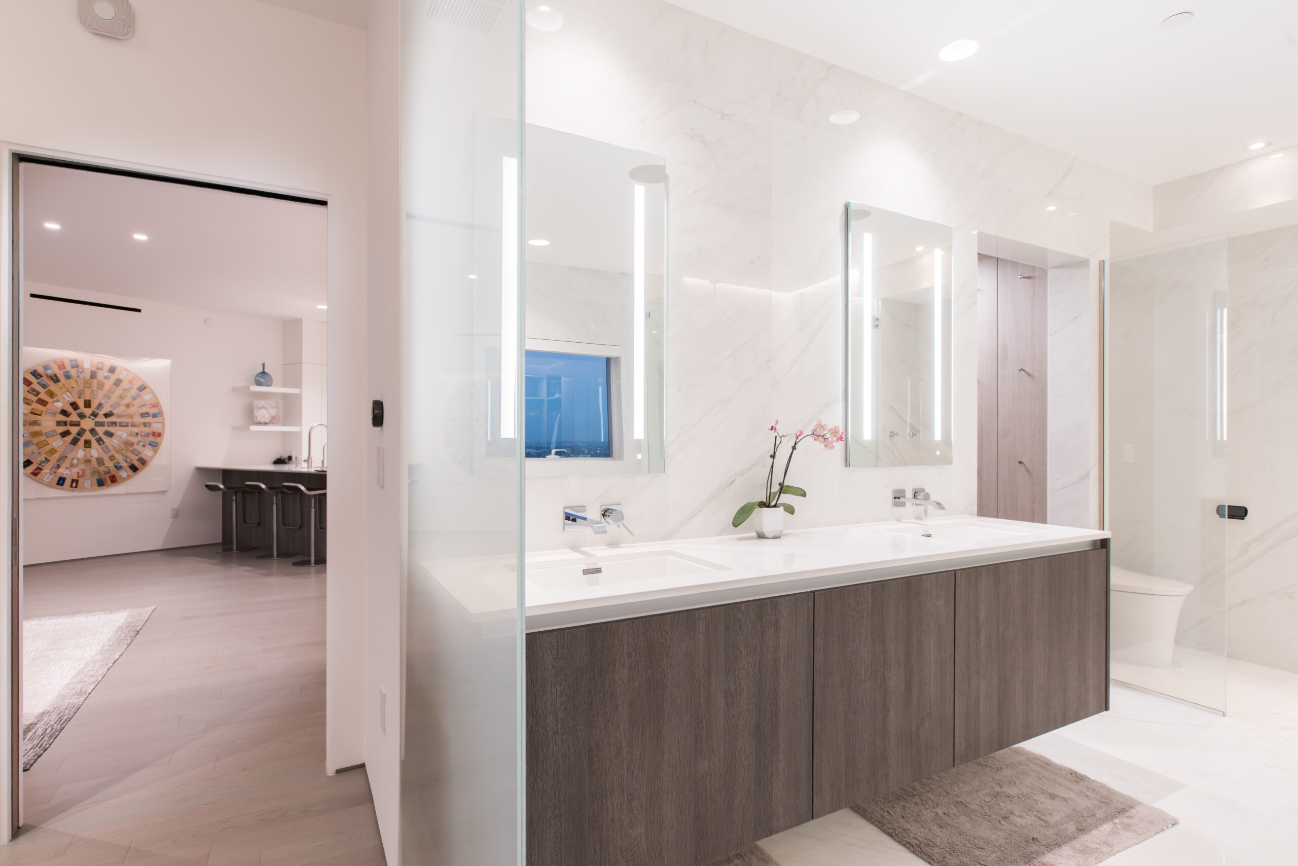 Perched at the top of a premier residential tower, this Azzurra Penthouse exudes exclusivity and modernism, all while offering awe-inspiring views of the marina. The LADB Design Group seamlessly incorporated Avant-guard technology with the opening of walls, replacing them with Privacy Glass, which at the rise of a hand, what was clear – is now opaque. With inventive use of everyday materials, the LADB Design Group could bring in a warmth, expanding the space with mosaic wall murals of bronzed glass. The smooth matte museum-like walls balance out, with warm woods, innovative appliance installations, and cutting edge illuminations effortlessly blending the calling of the sea and high-rise living.