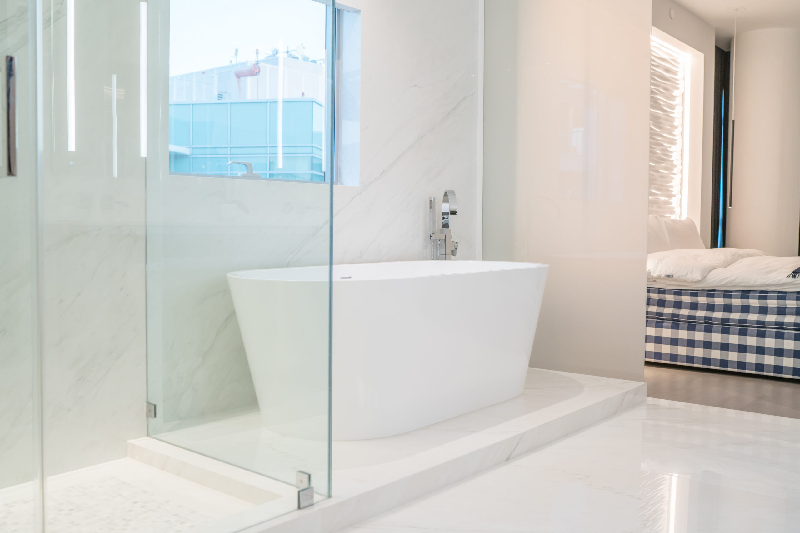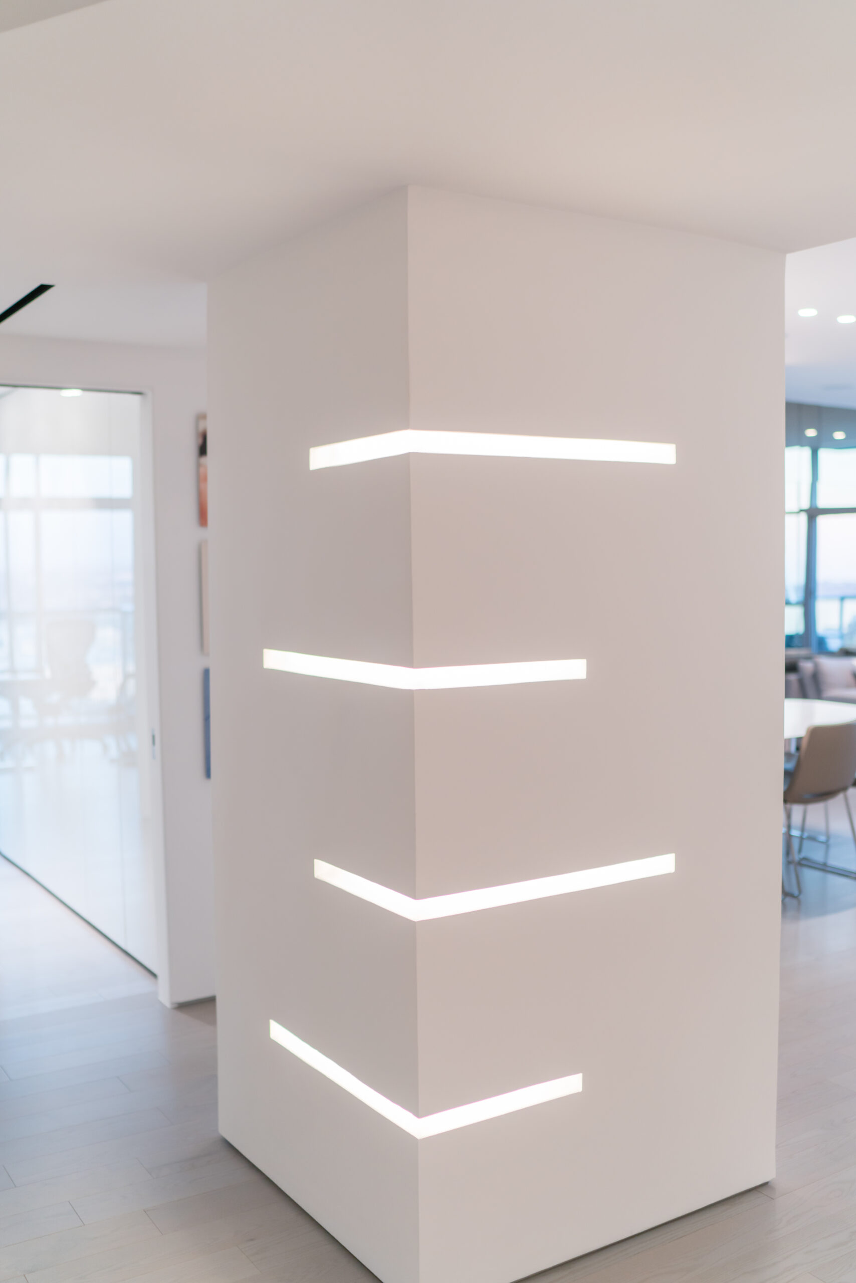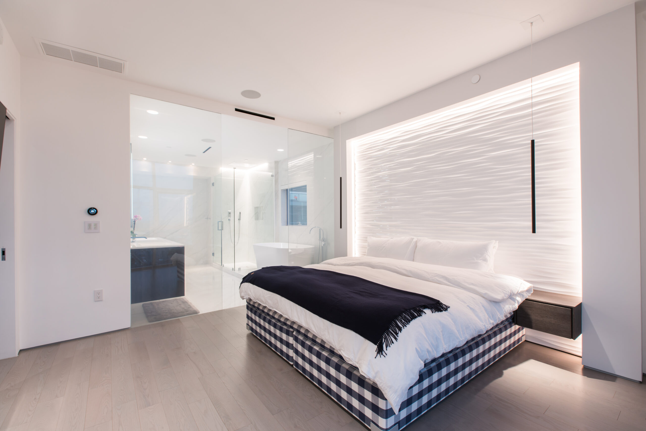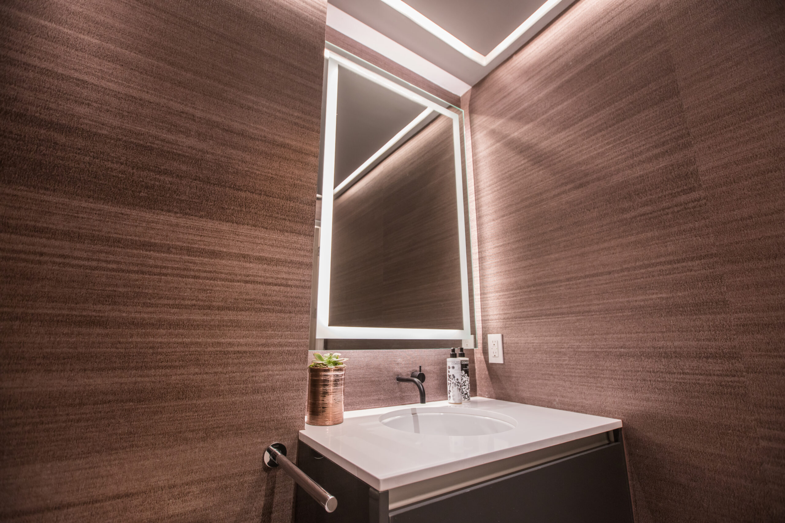 Perched at the top of a premier residential tower, this Azzurra Penthouse exudes exclusivity and modernism, all while offering awe-inspiring views of the marina. The LADB Design Group seamlessly incorporated Avant-guard technology with the opening of walls, replacing them with Privacy Glass, which at the rise of a hand, what was clear – is now opaque. With inventive use of everyday materials, the LADB Design Group could bring in a warmth, expanding the space with mosaic wall murals of bronzed glass. The smooth matte museum-like walls balance out, with warm woods, innovative appliance installations, and cutting edge illuminations effortlessly blending the calling of the sea and high-rise living.