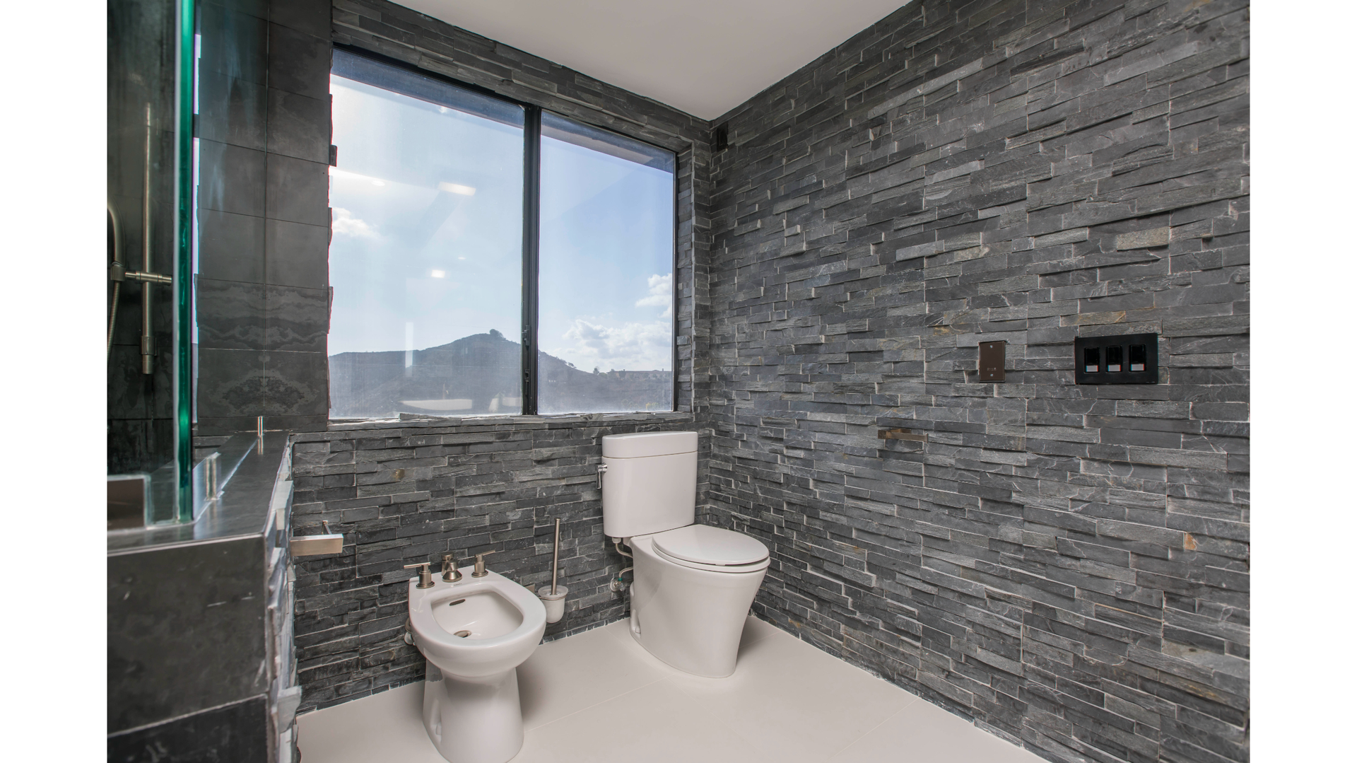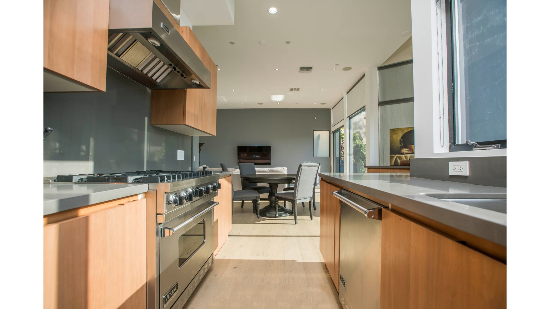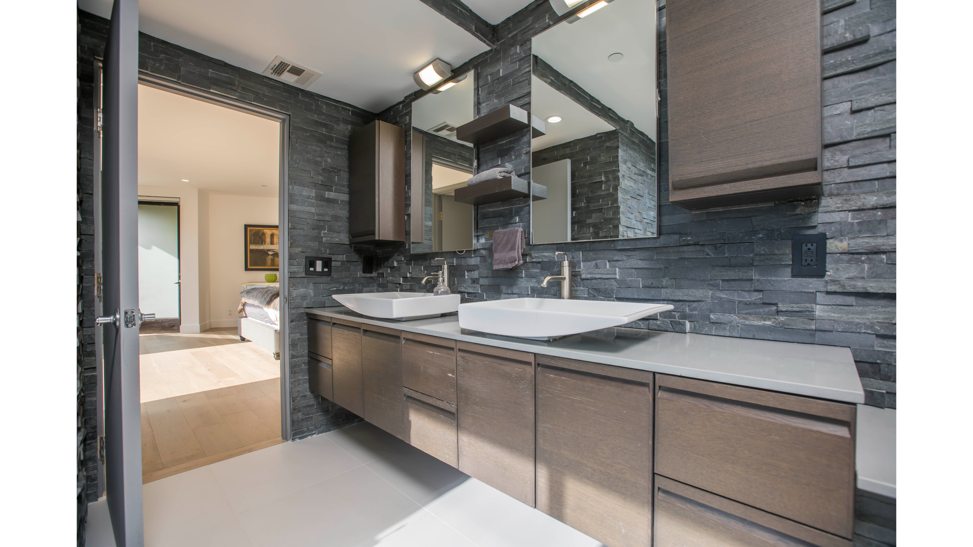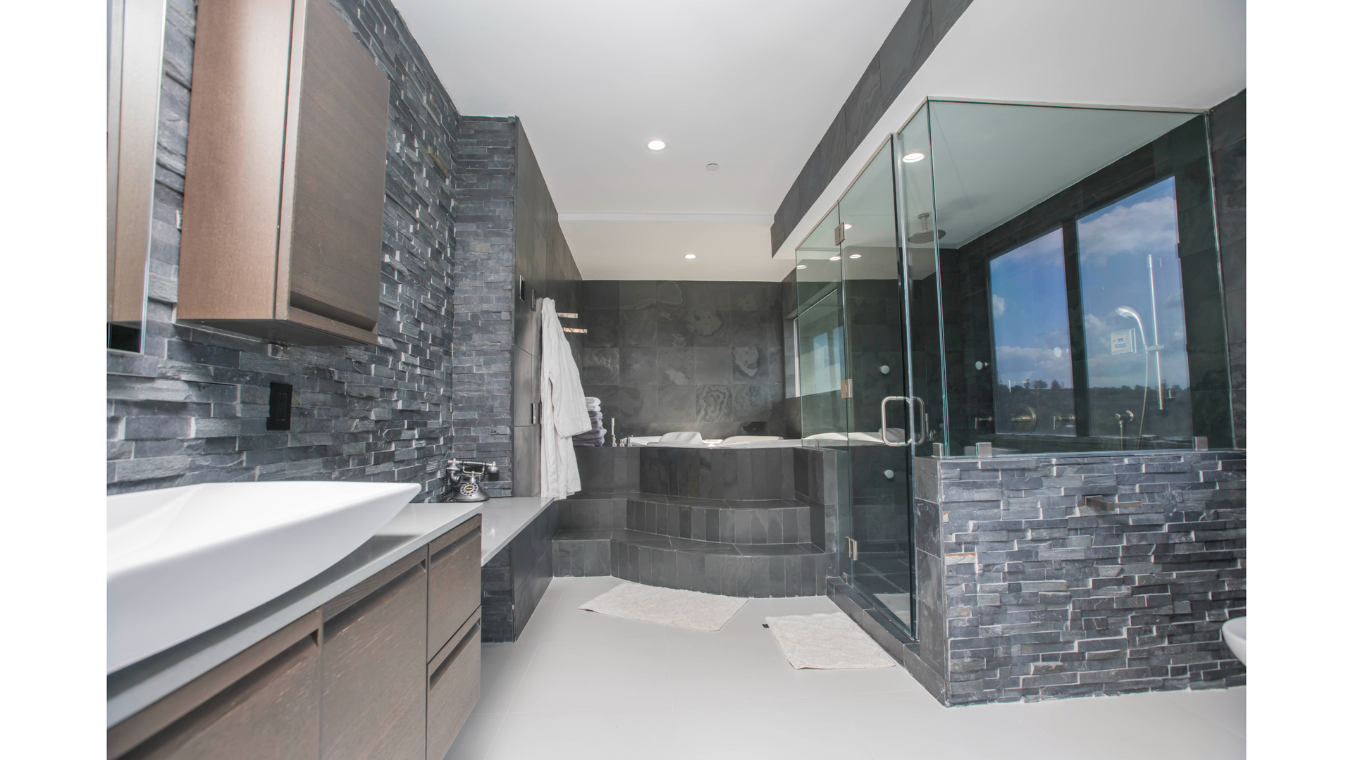 Custom oak cabinetry anchors the kitchen and living spaces with warmth and precision, seamlessly integrated with Viking appliances for a refined yet highly functional layout. Natural flagstone was used as a signature material, carried through the fireplace and the primary bathroom to create texture, continuity, and a quiet sense of luxury.