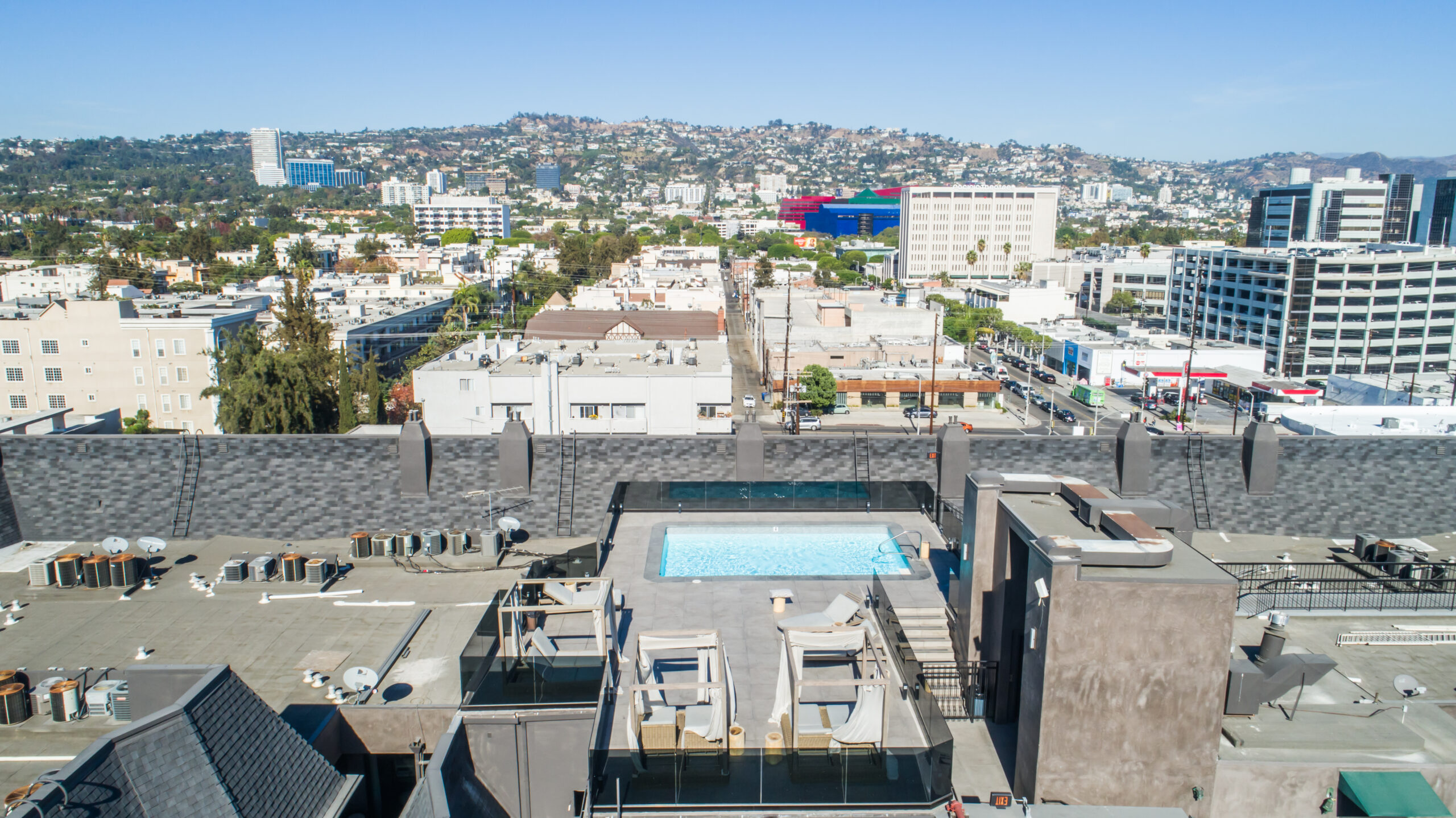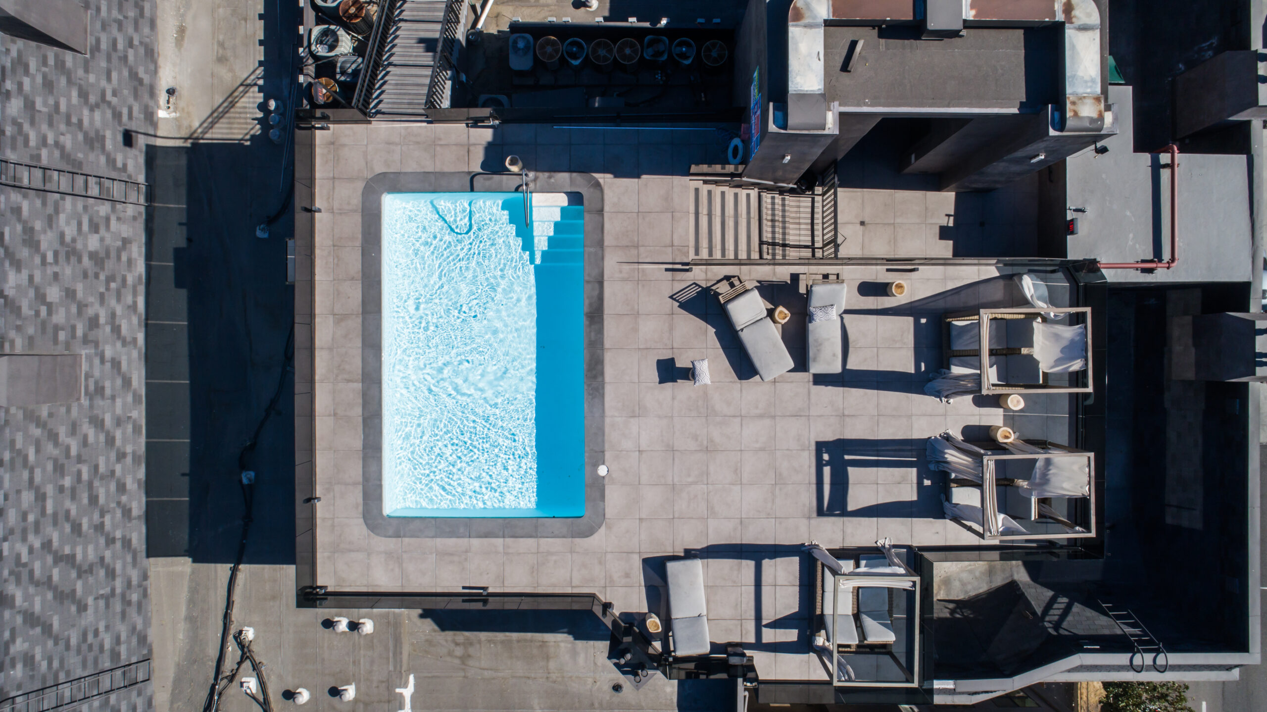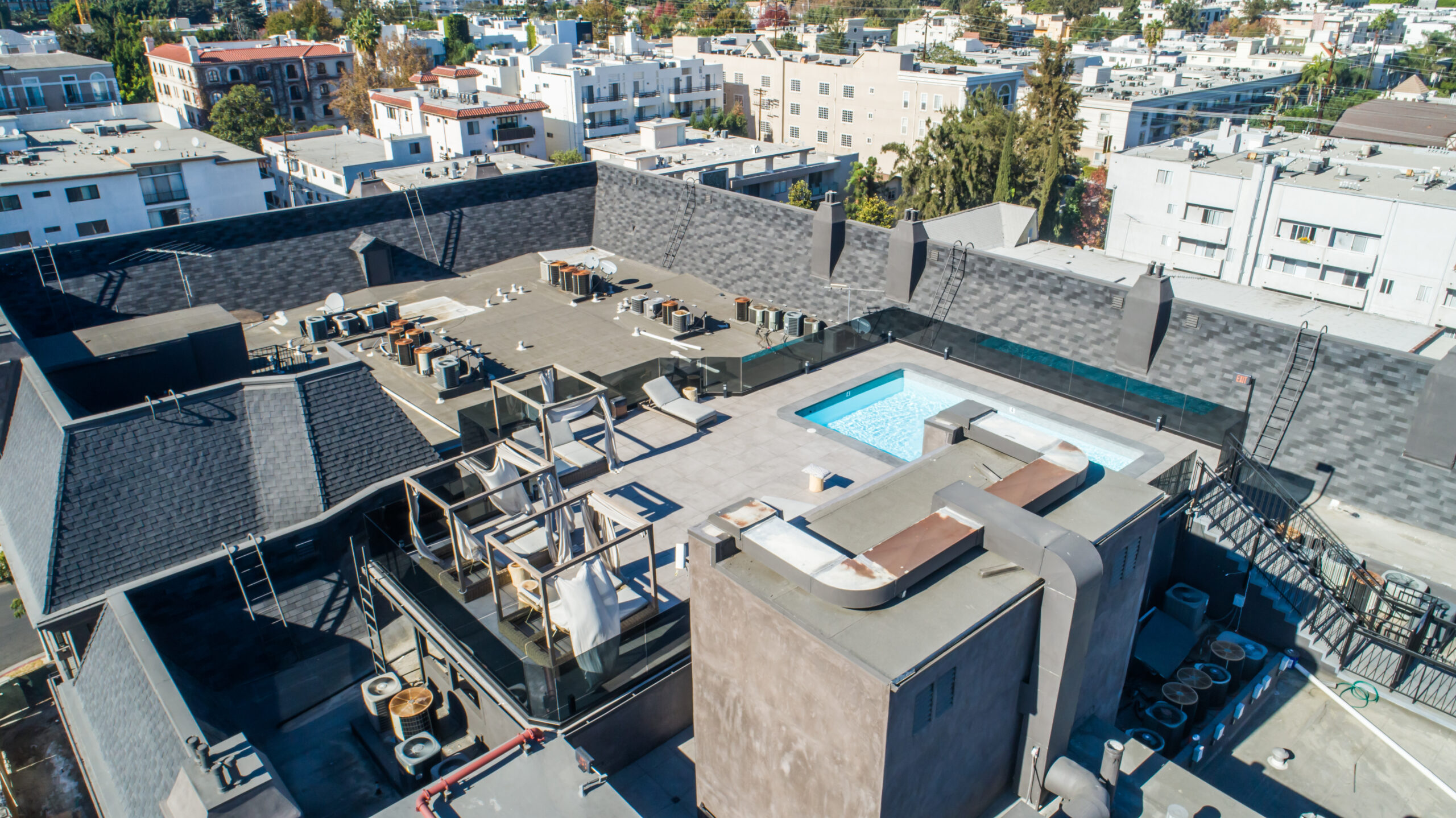 The scope included a full rooftop pool renovation, new rooftop decking, and the installation of a continuous perimeter glass railing system. Every element was engineered and executed to meet strict Beverly Hills commercial standards while maintaining a clean, modern aesthetic suited for a high-end residential environment.