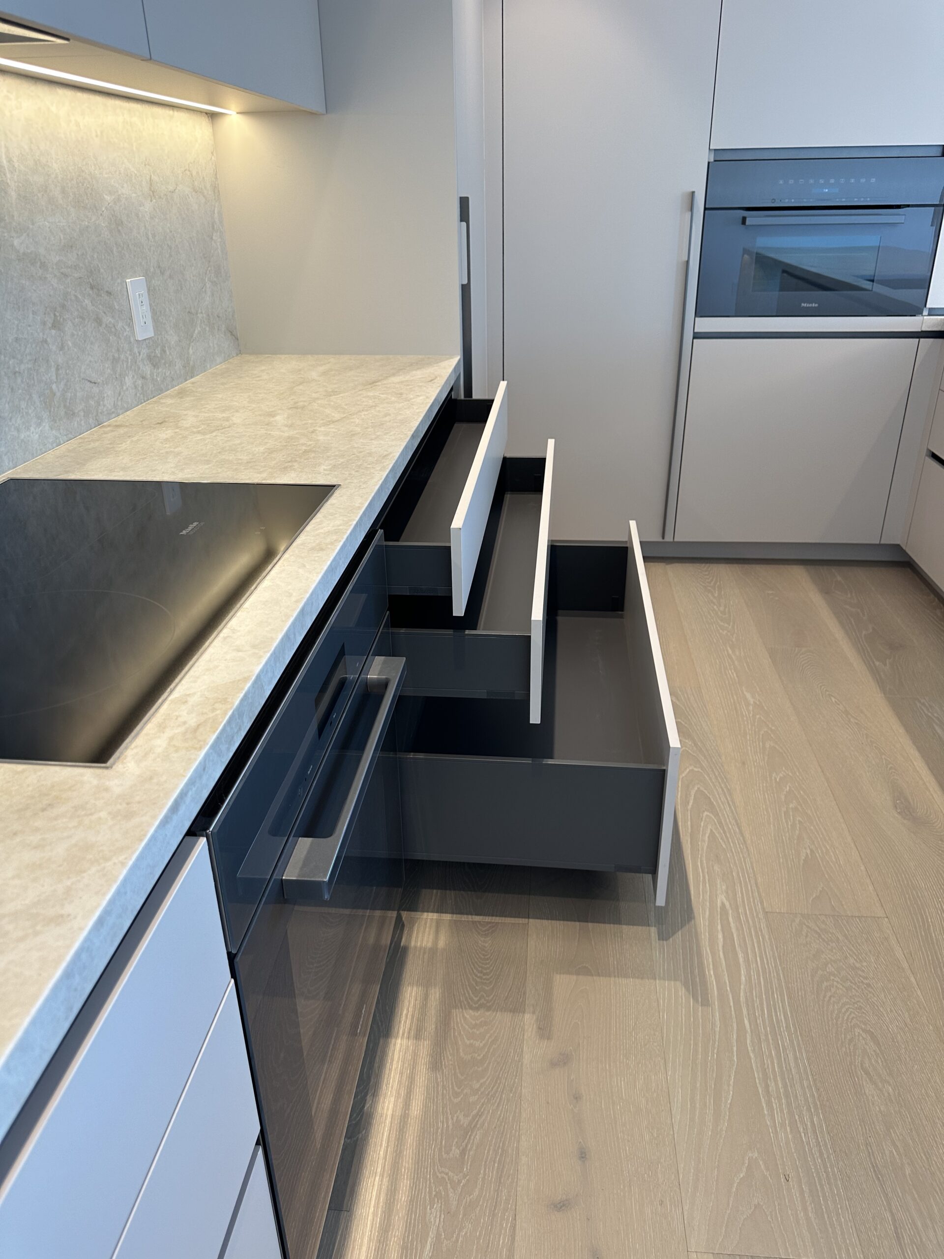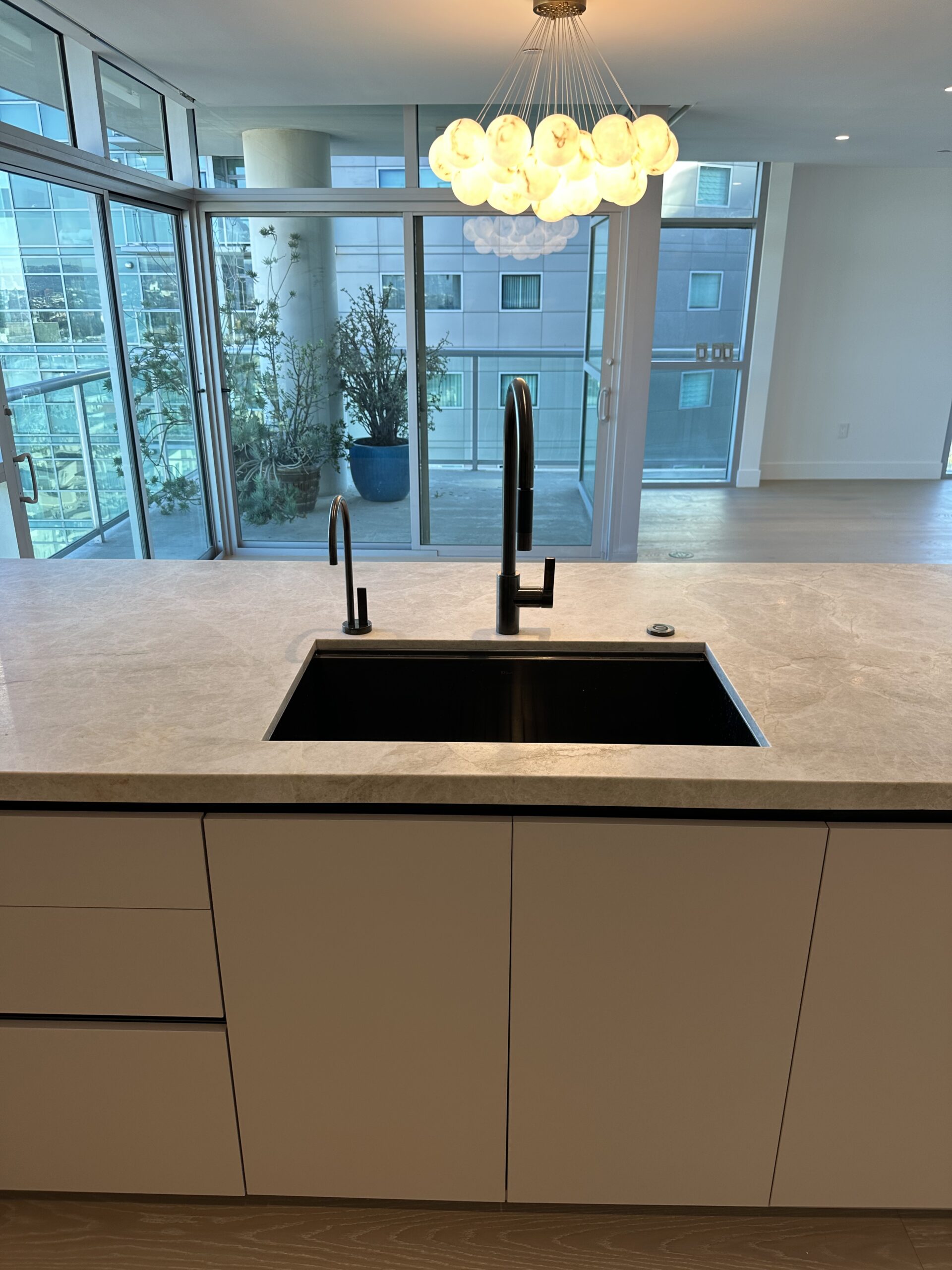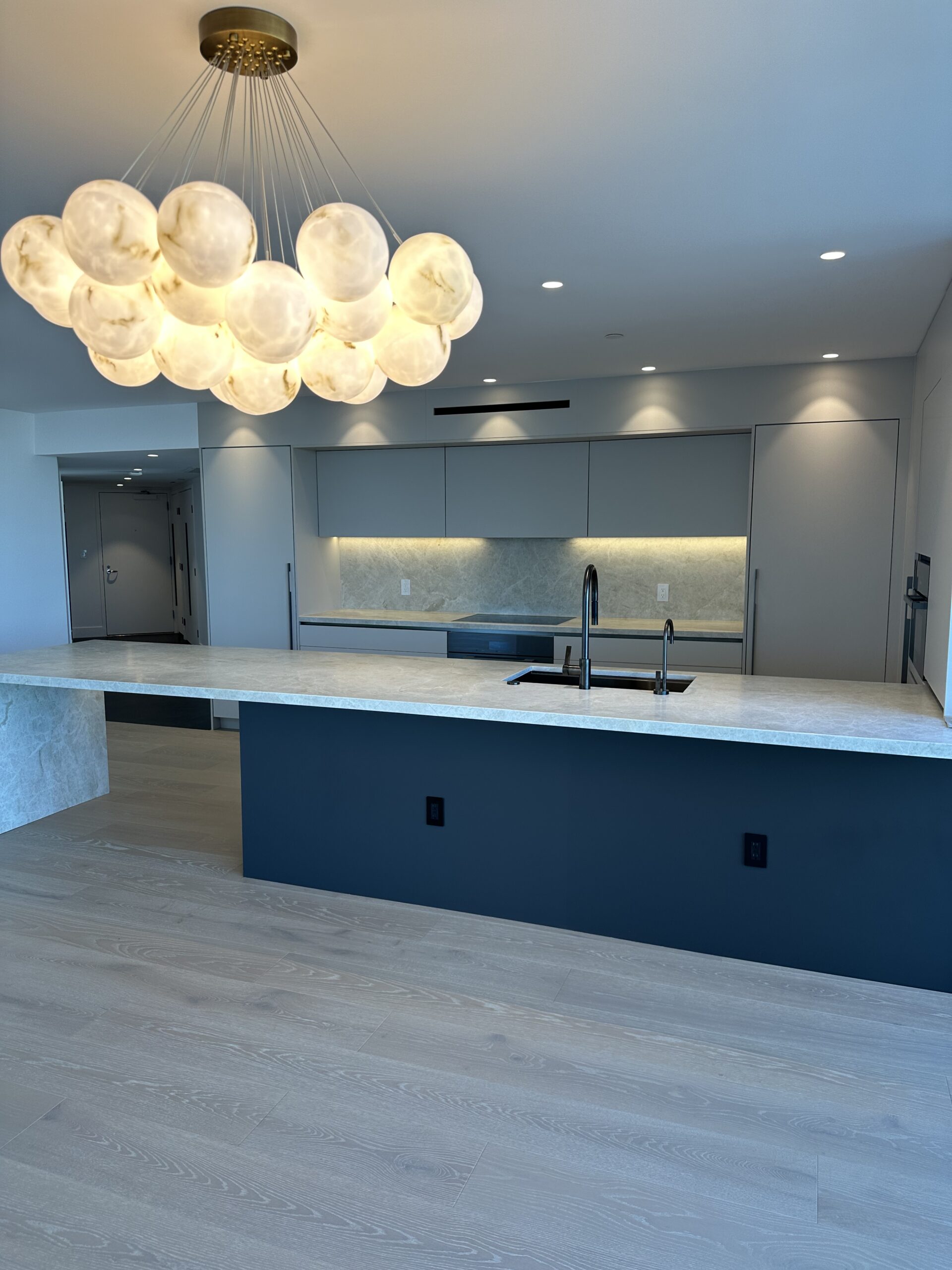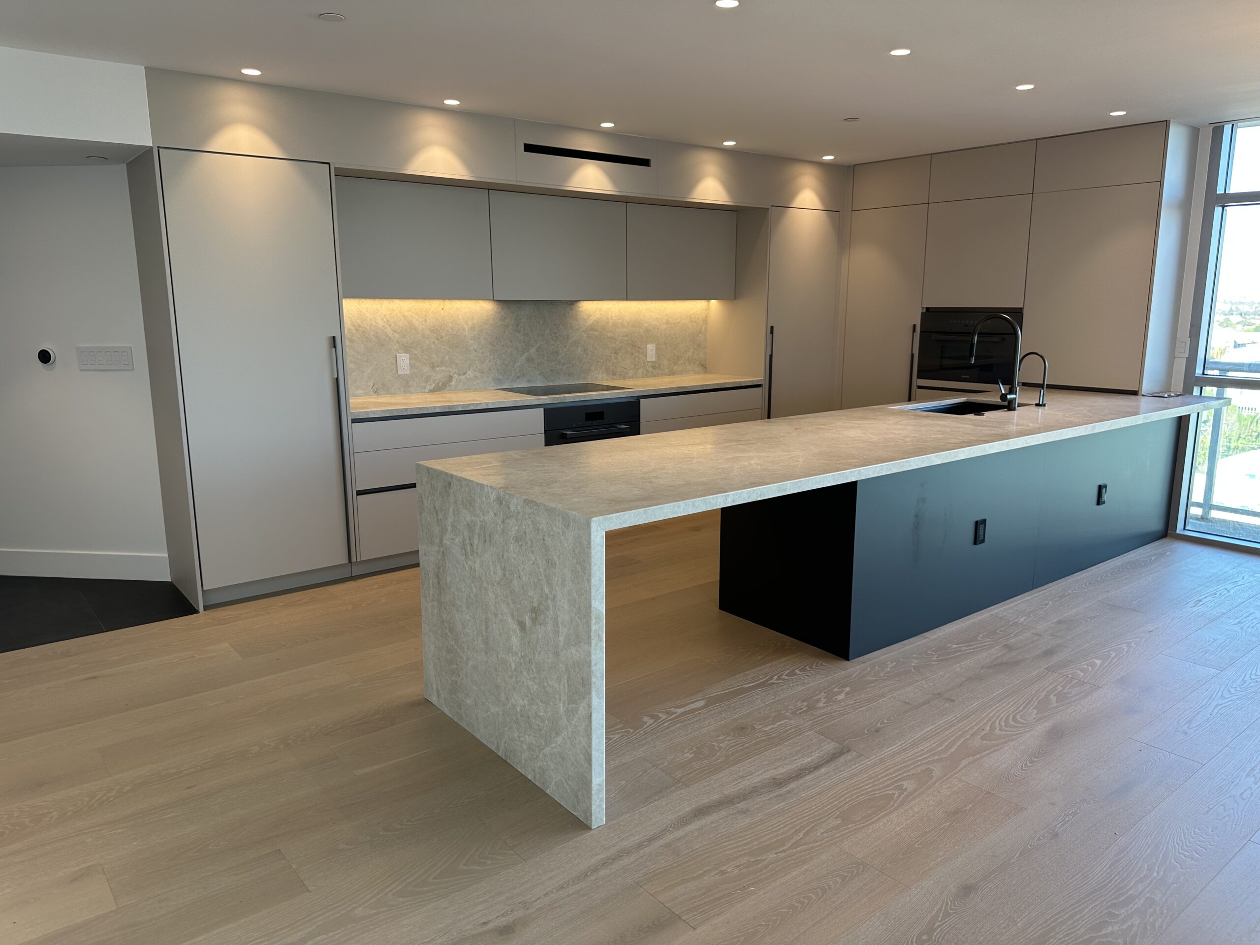 This modern residential project showcases a bespoke design featuring a European kitchen. The renovation involved removing all soffits and creating an open layout that seamlessly connects the kitchen, living room, and dining area. The space boasts new ceilings with recessed lighting throughout and an expansive Taj Mahal quartzite countertop paired with European lacquer cabinetry. Equipped with premium German Miele appliances, the kitchen exemplifies elegance and functionality.