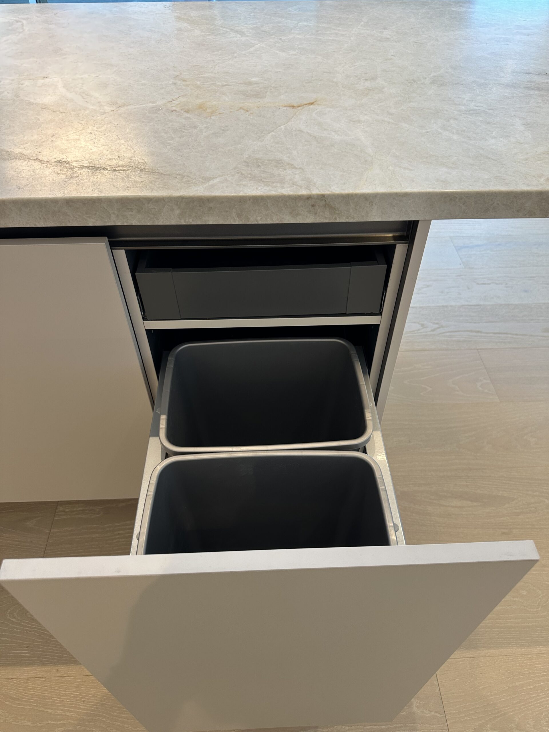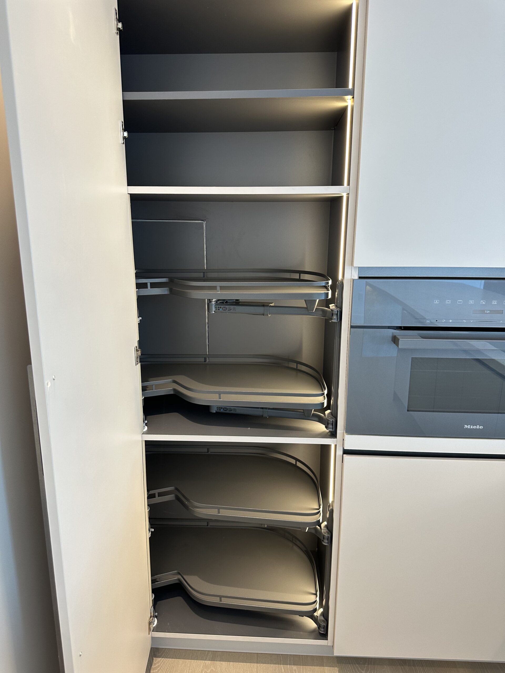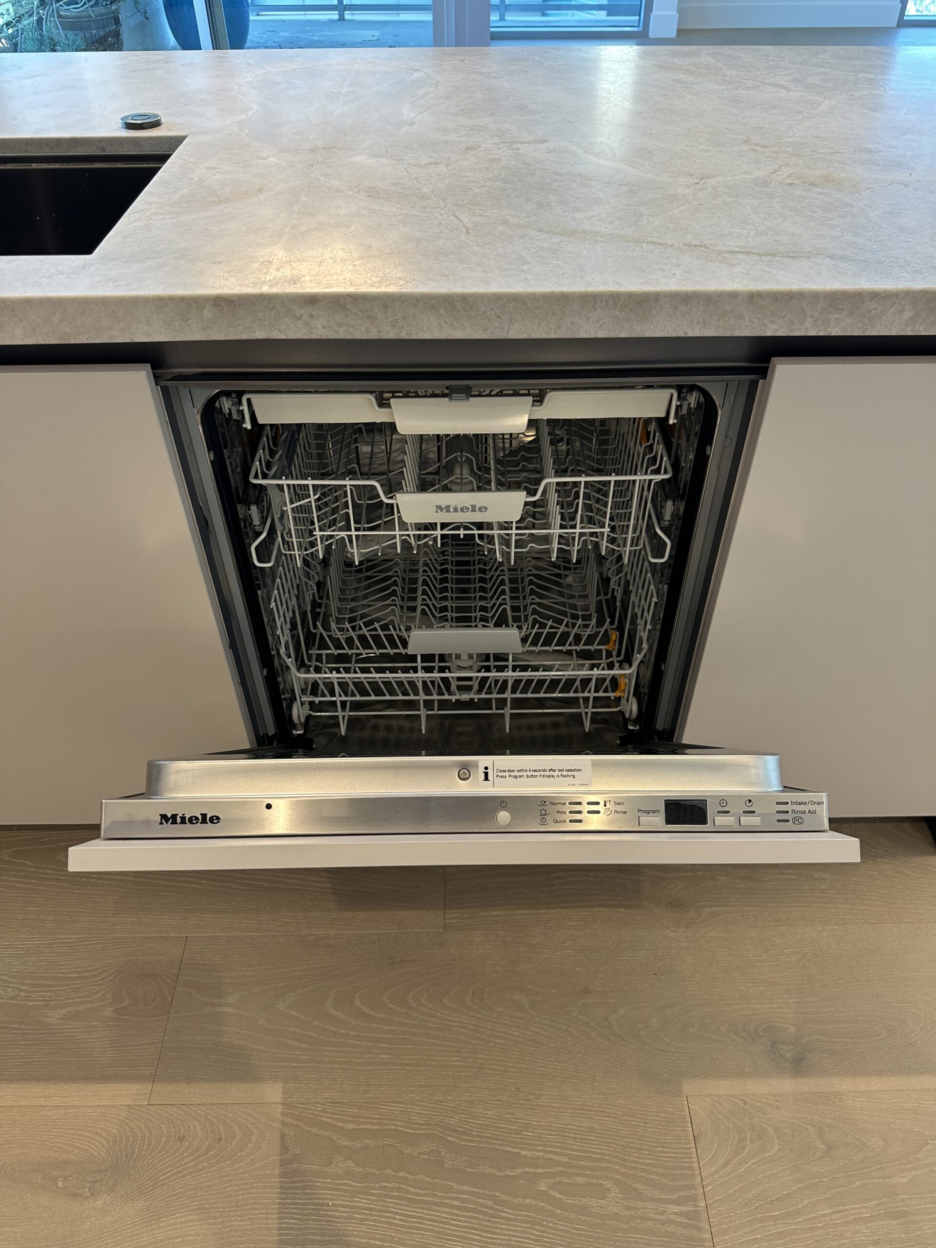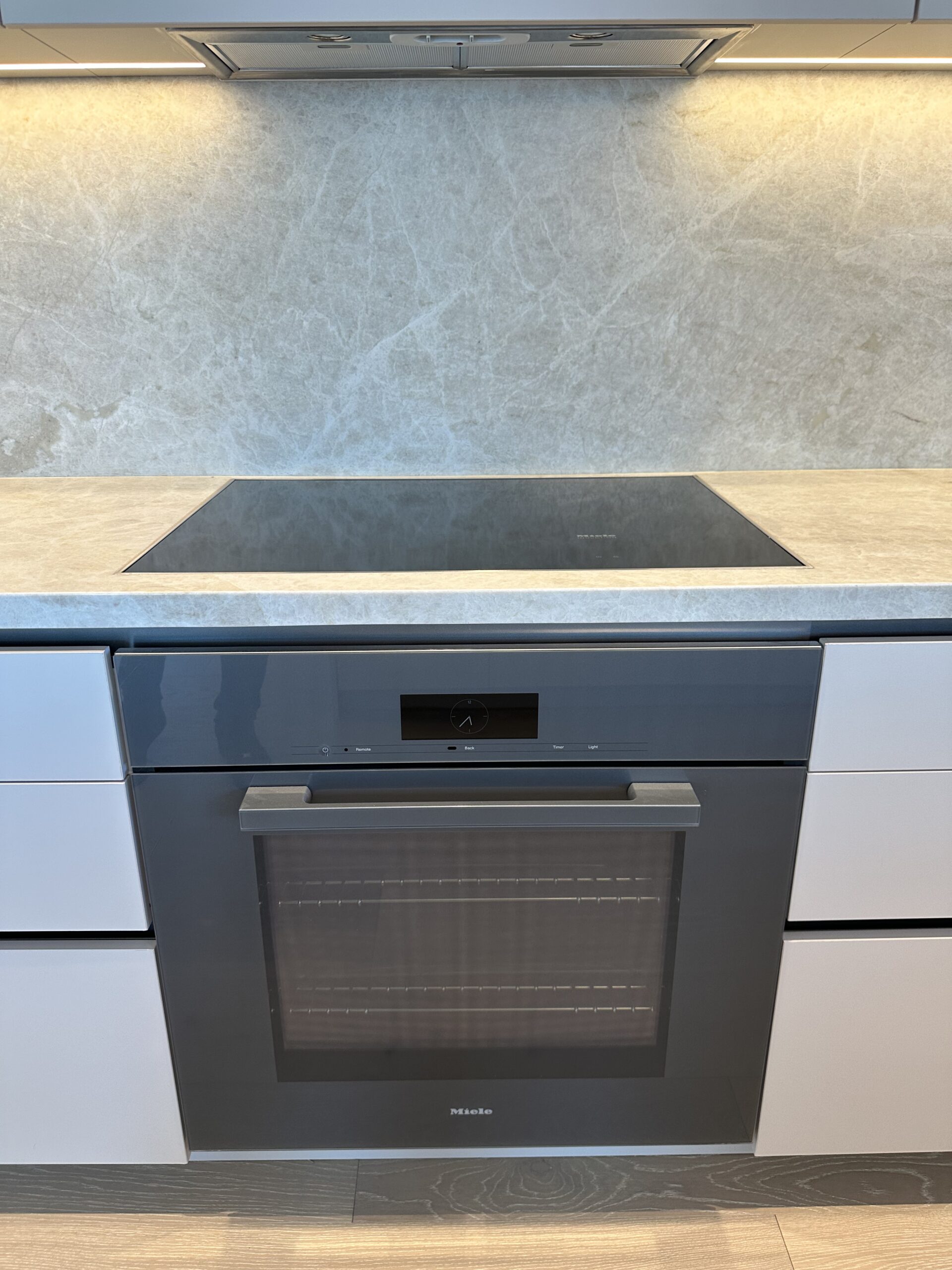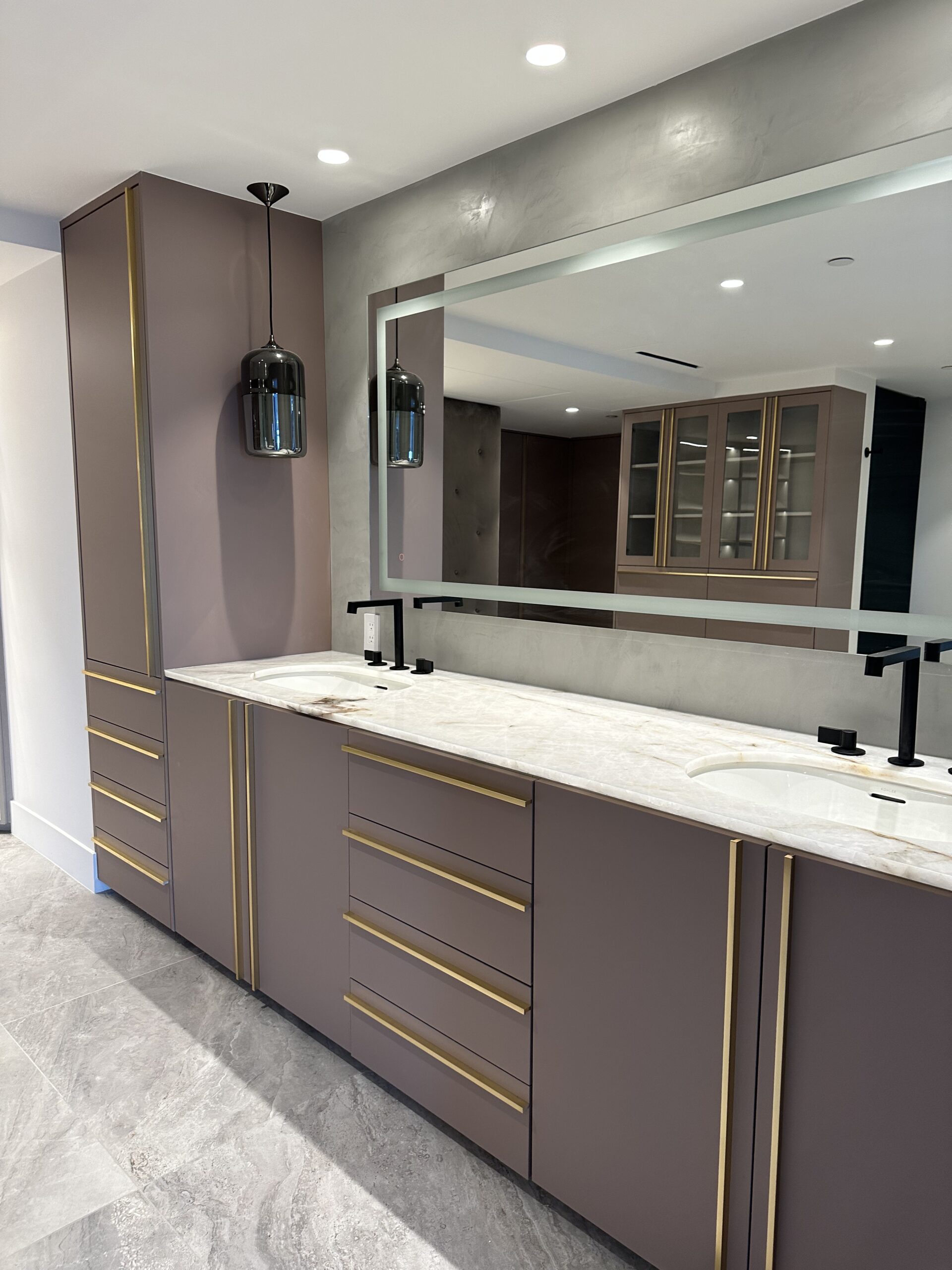This modern residential project showcases a bespoke design featuring a European kitchen. The renovation involved removing all soffits and creating an open layout that seamlessly connects the kitchen, living room, and dining area. The space boasts new ceilings with recessed lighting throughout and an expansive Taj Mahal quartzite countertop paired with European lacquer cabinetry. Equipped with premium German Miele appliances, the kitchen exemplifies elegance and functionality.