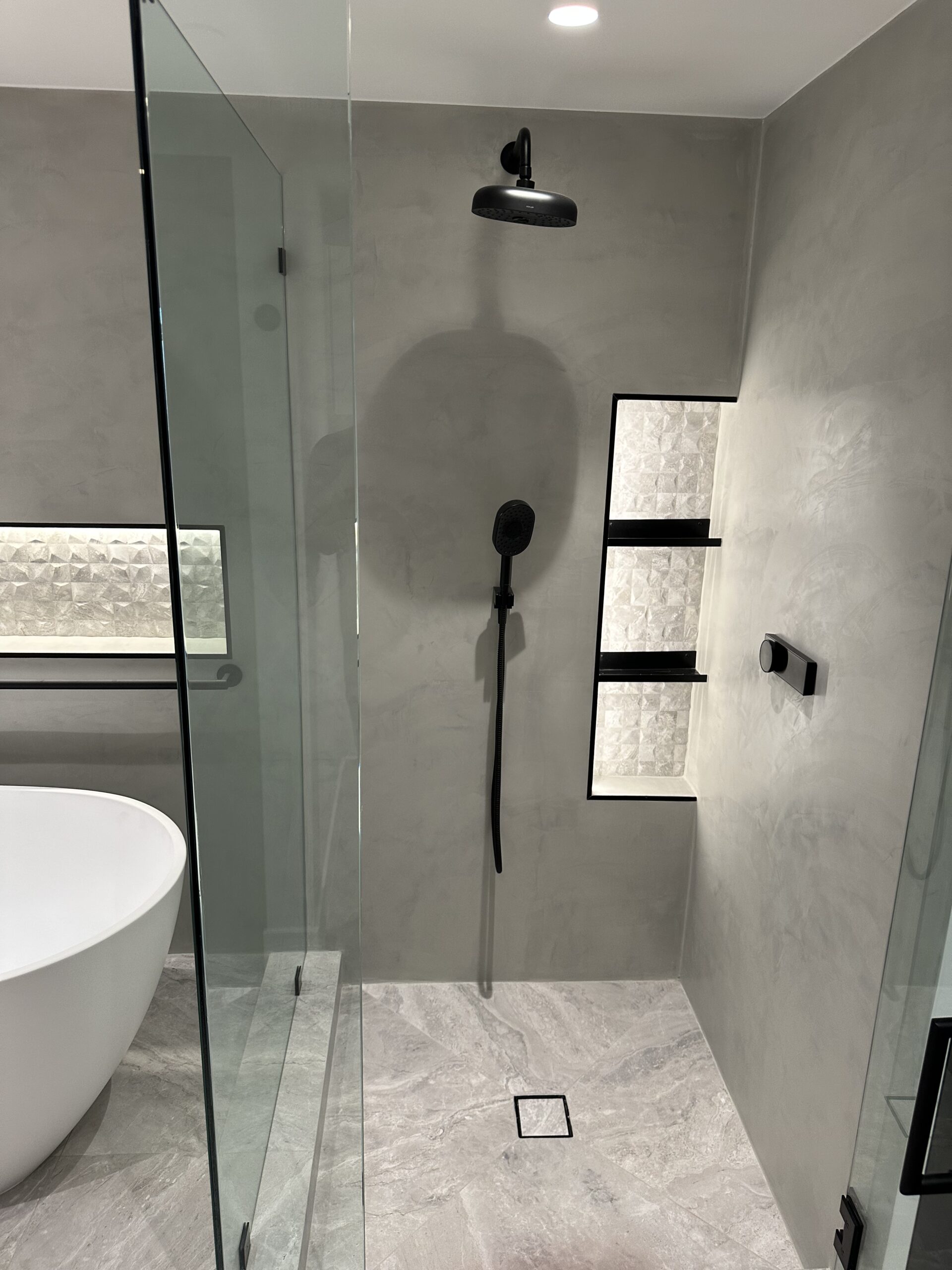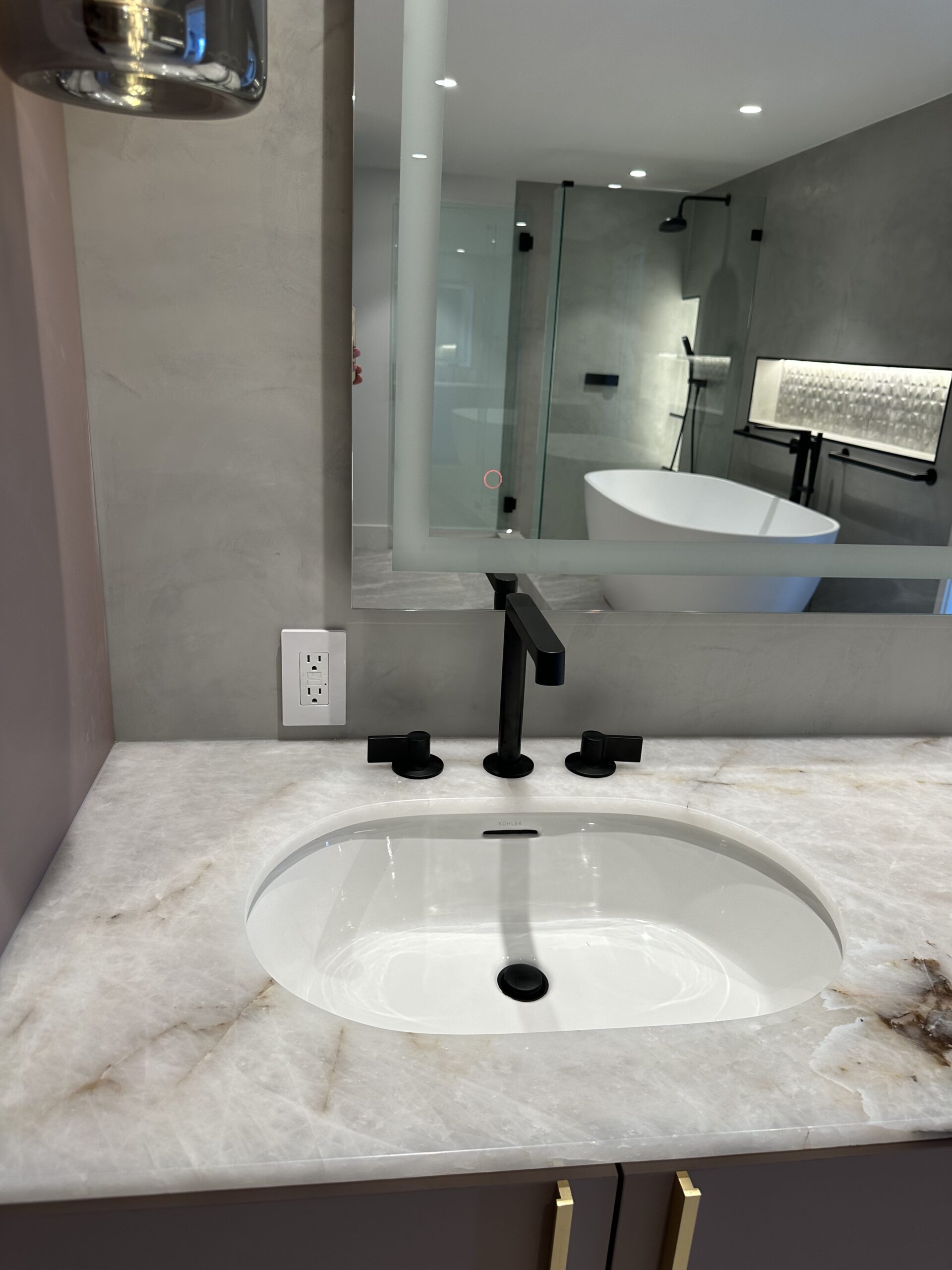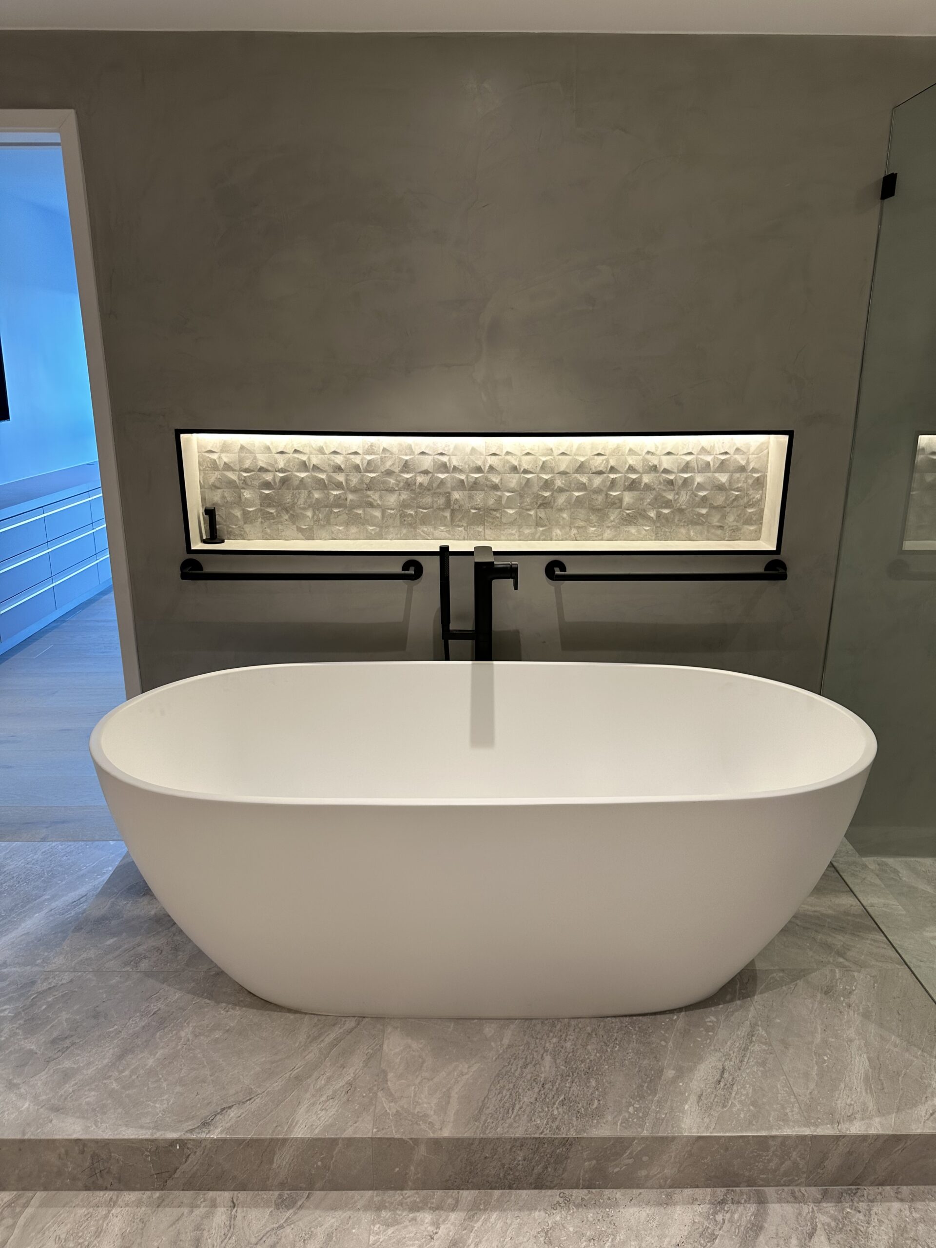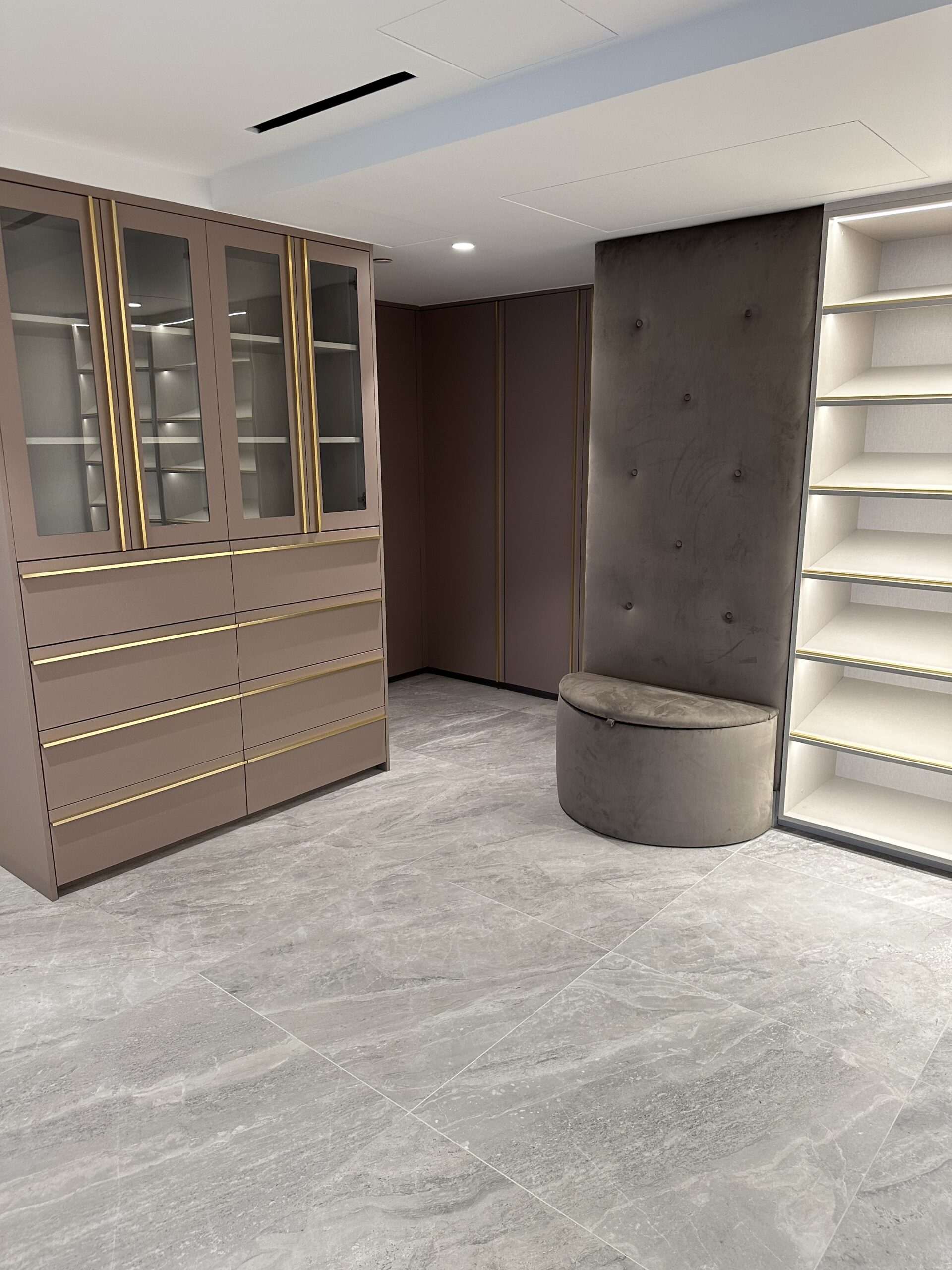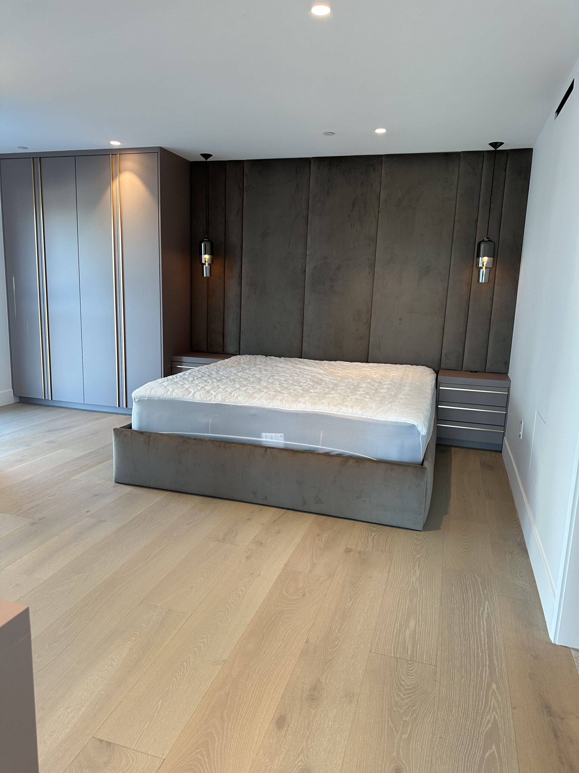 The bathrooms are adorned with hand-selected porcelain tiles from Porcelanosa in Spain, bringing a sophisticated touch to every detail. The entire unit is unified with engineered wood flooring, adding warmth and modernity to the design.