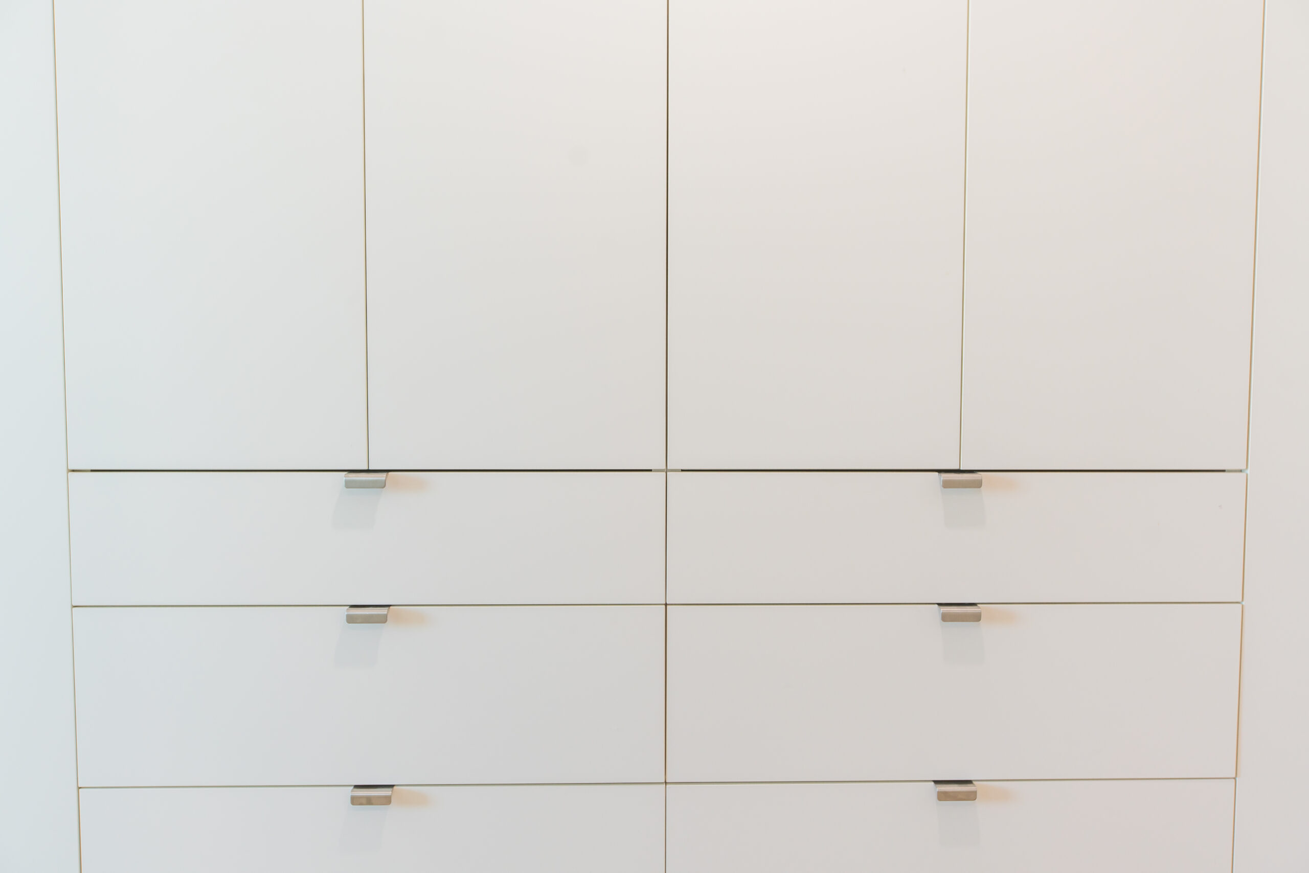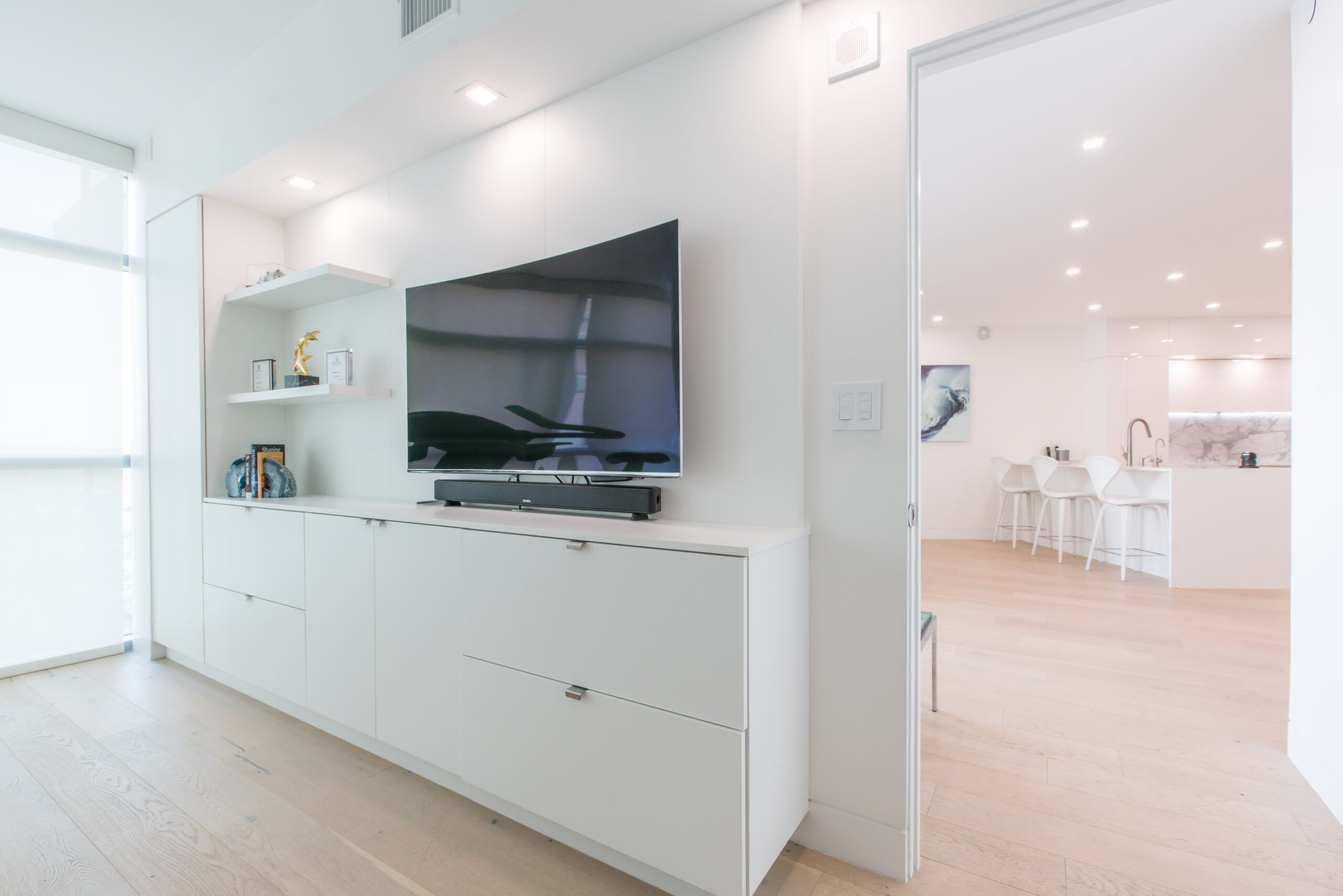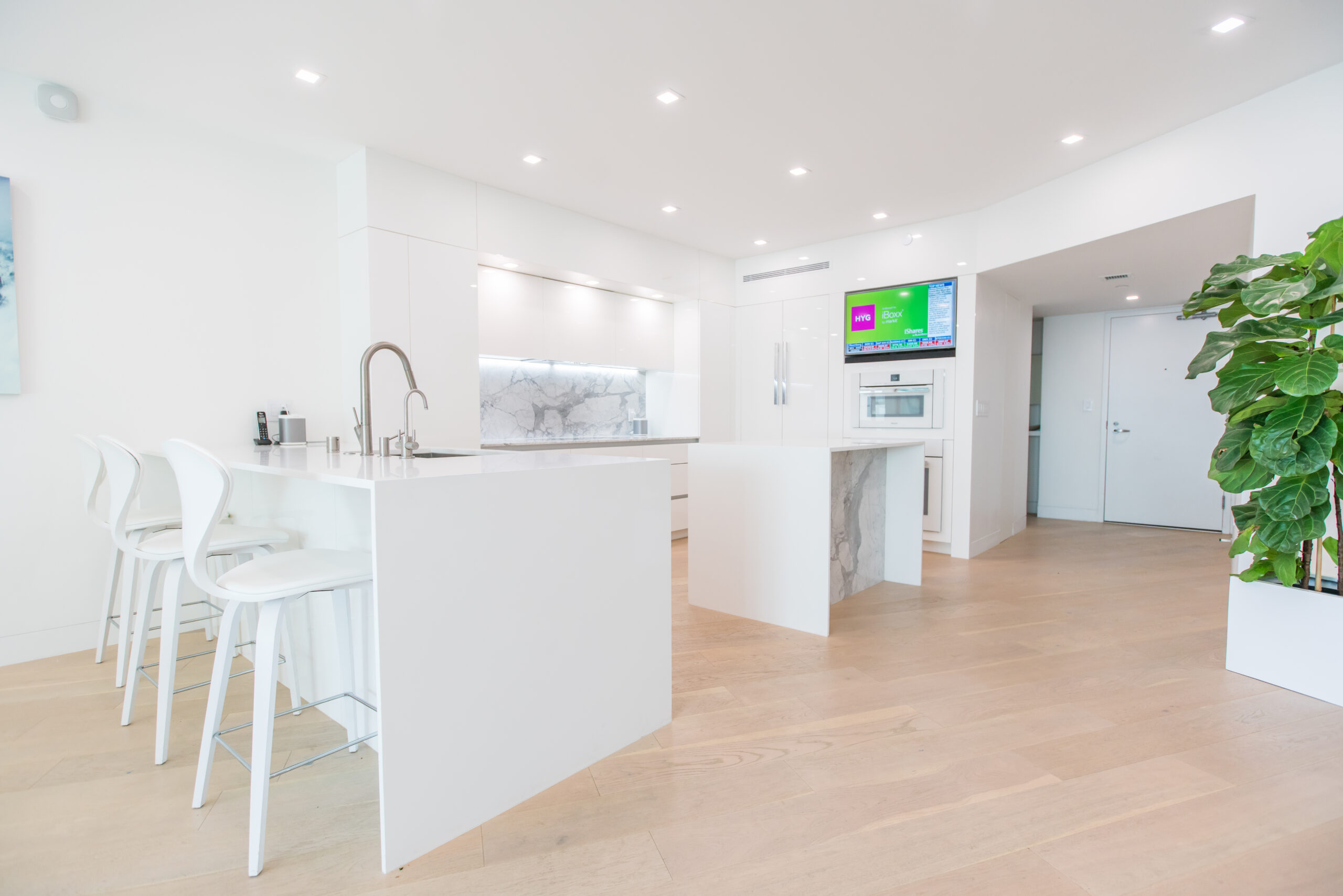 High-gloss white lacquer cabinetry defines the kitchen and storage elements, delivering a clean, reflective surface that enhances brightness and precision. Integrated Miele appliances were selected for their minimal aesthetic and performance, maintaining a seamless, uninterrupted visual flow.