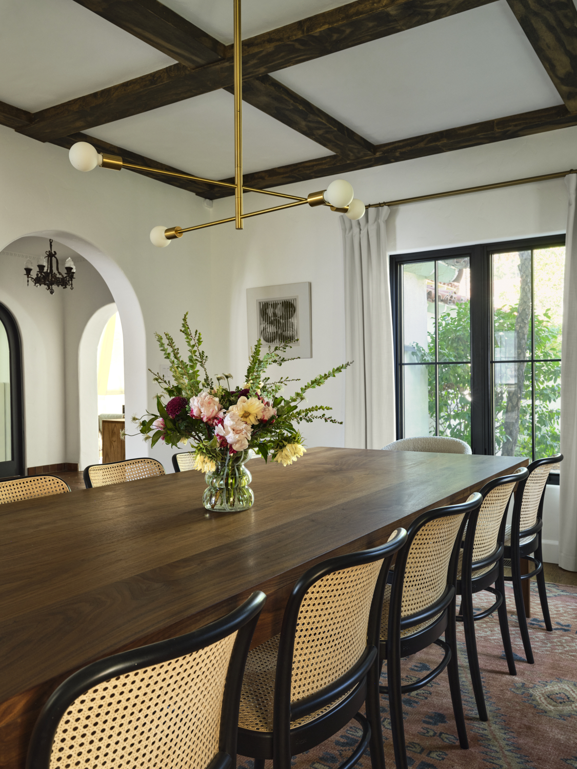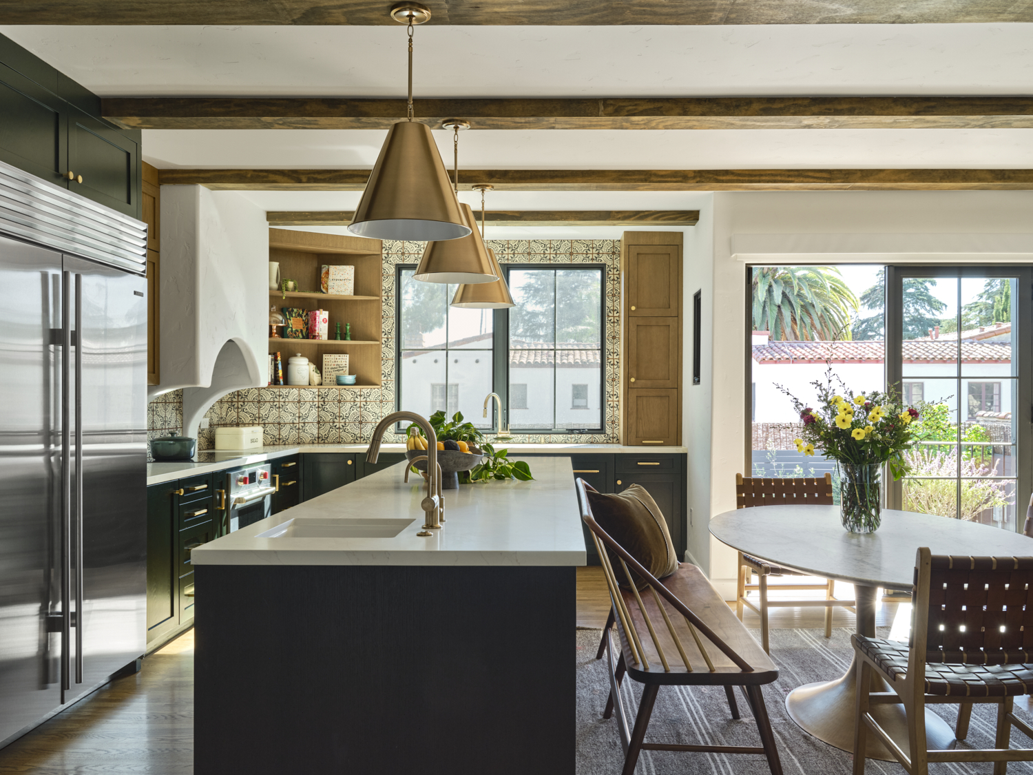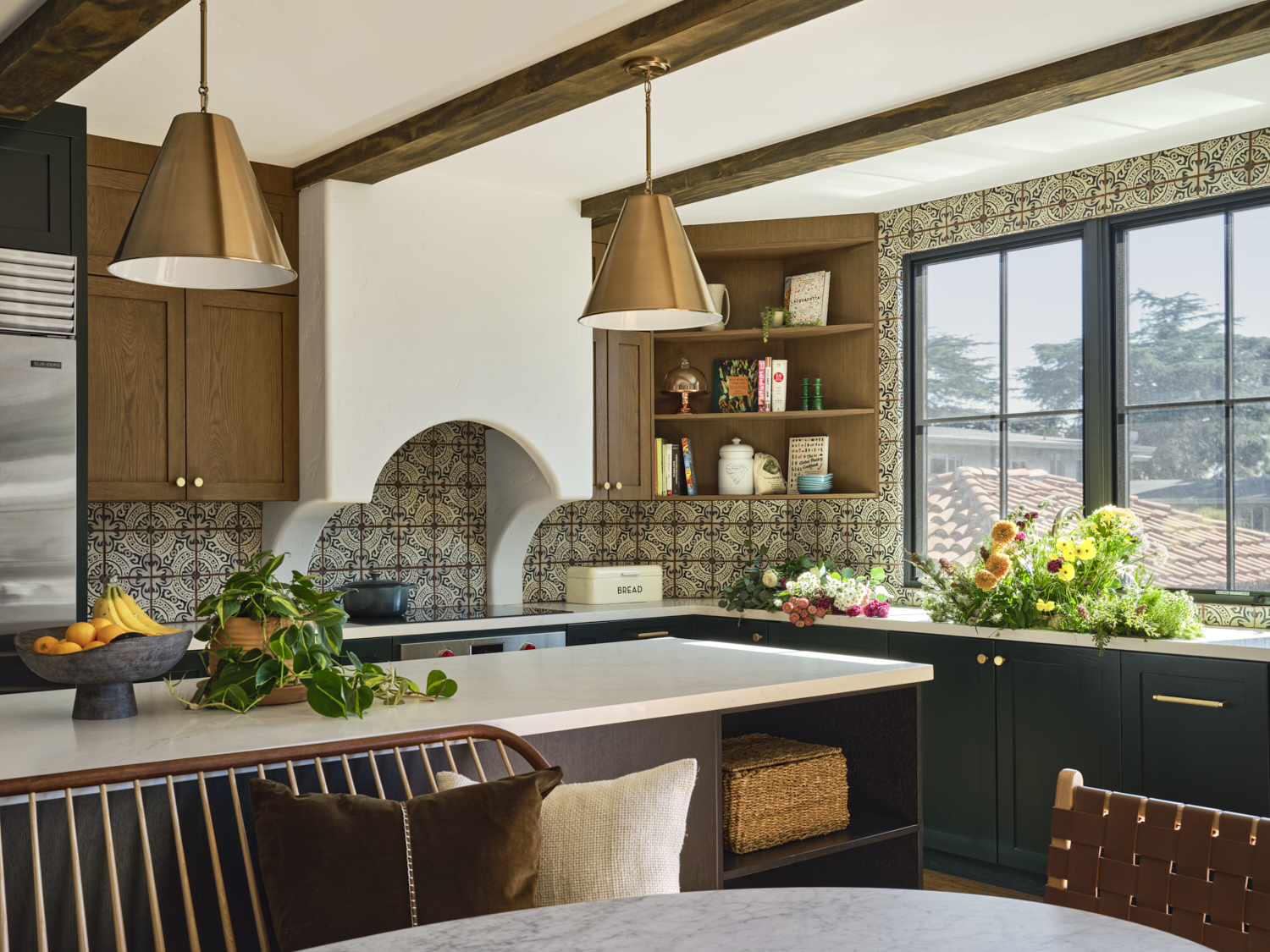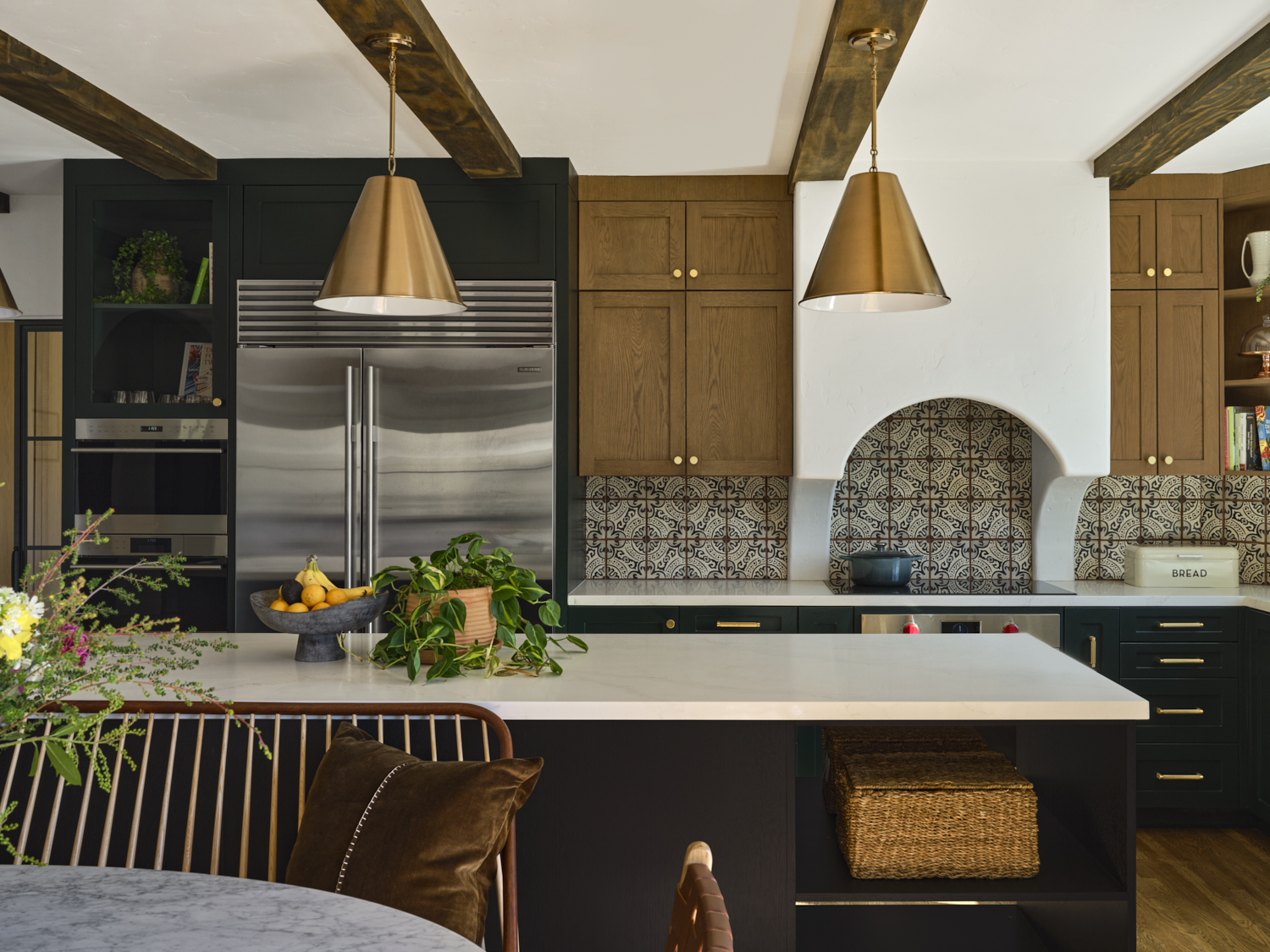The kitchen is a masterful blend of bold design and warmth. Dark cabinetry contrasts beautifully with natural wood finishes, while brass accents on the pendant lights and hardware add a sophisticated touch. The handcrafted tile backsplash provides an intricate yet inviting focal point, framing the custom plaster hood. A clean, spacious quartz countertop anchors the room, offering a perfect balance between functionality and style. Exposed wood beams further enhance the space, giving it a rustic charm that feels both contemporary and grounded.