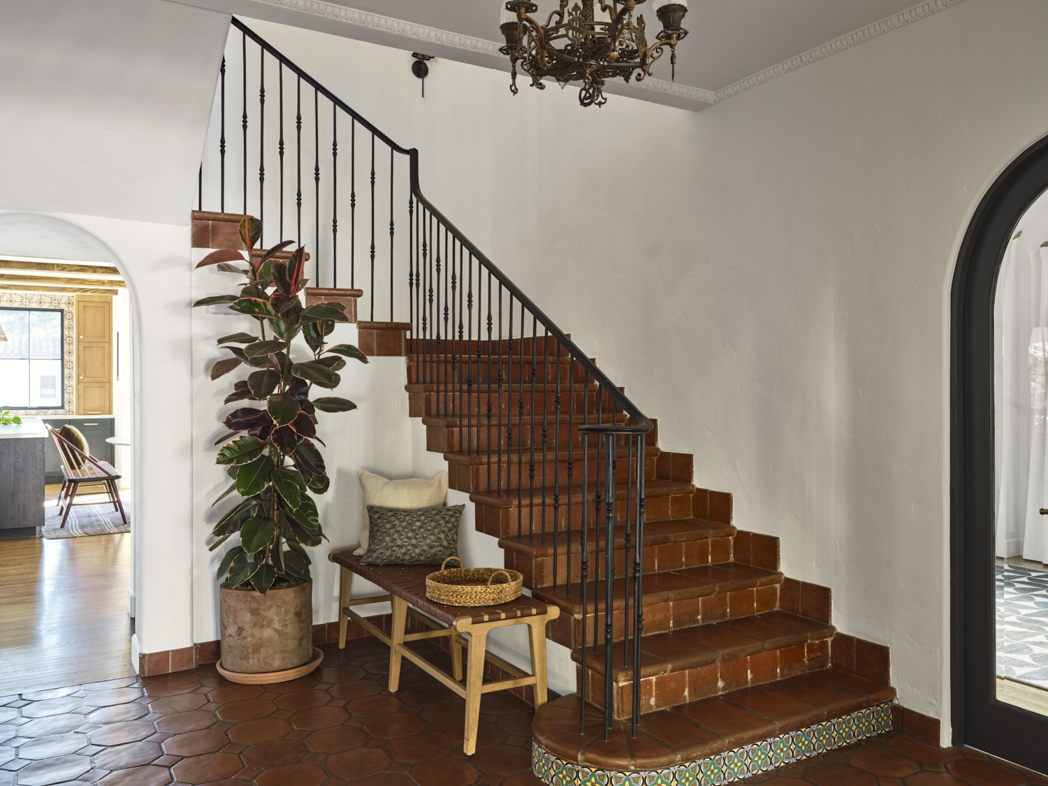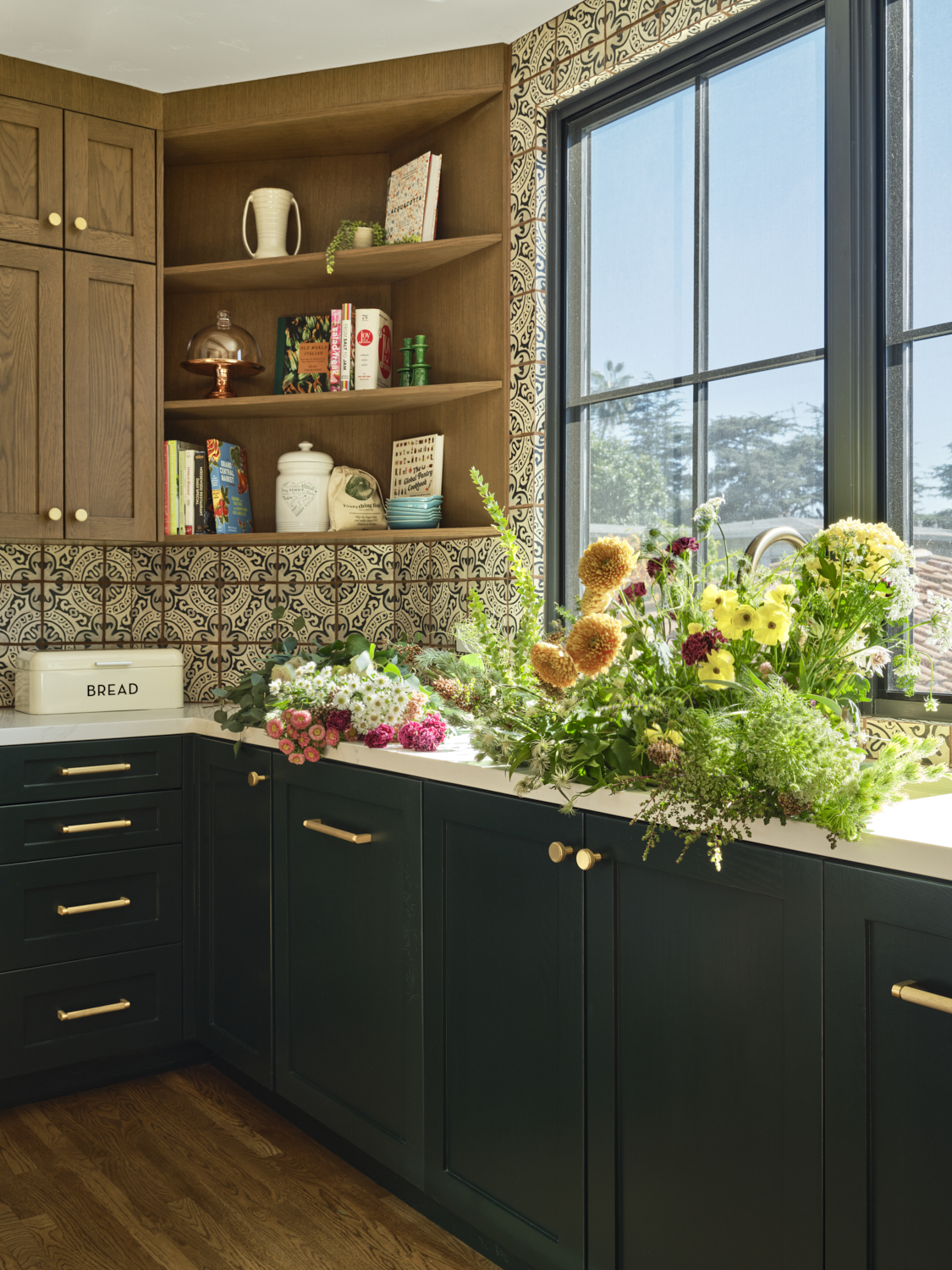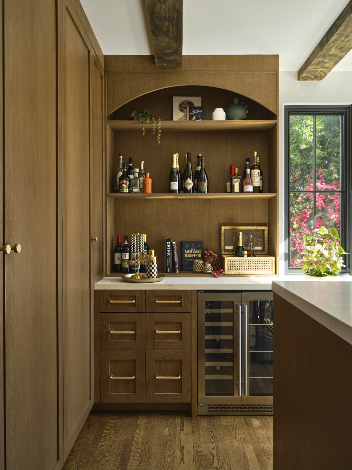 The kitchen is a masterful blend of bold design and warmth. Dark cabinetry contrasts beautifully with natural wood finishes, while brass accents on the pendant lights and hardware add a sophisticated touch. The handcrafted tile backsplash provides an intricate yet inviting focal point, framing the custom plaster hood. A clean, spacious quartz countertop anchors the room, offering a perfect balance between functionality and style. Exposed wood beams further enhance the space, giving it a rustic charm that feels both contemporary and grounded.