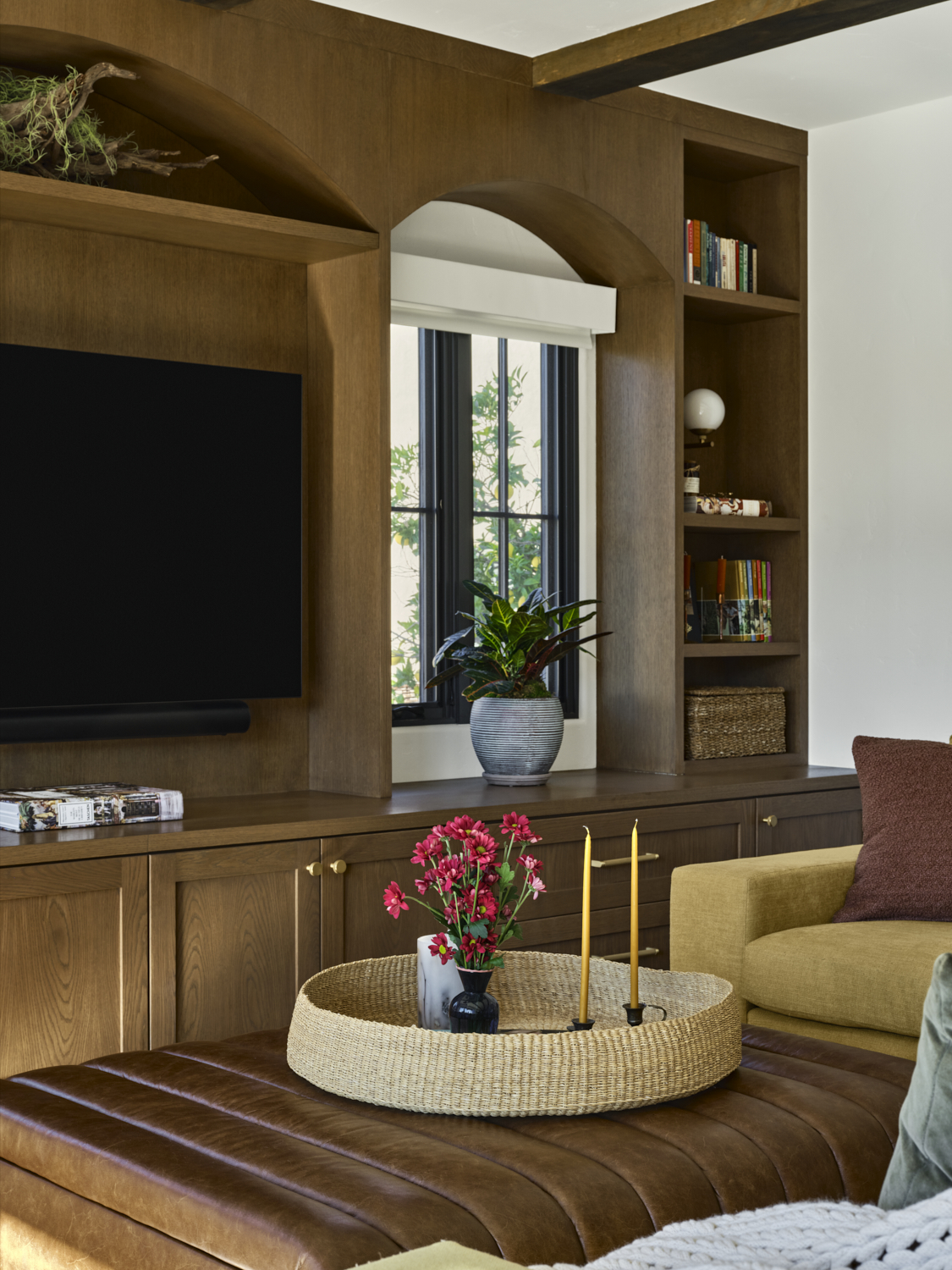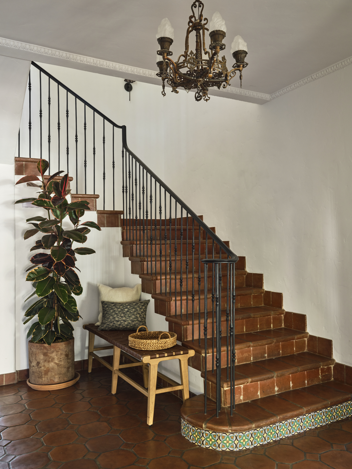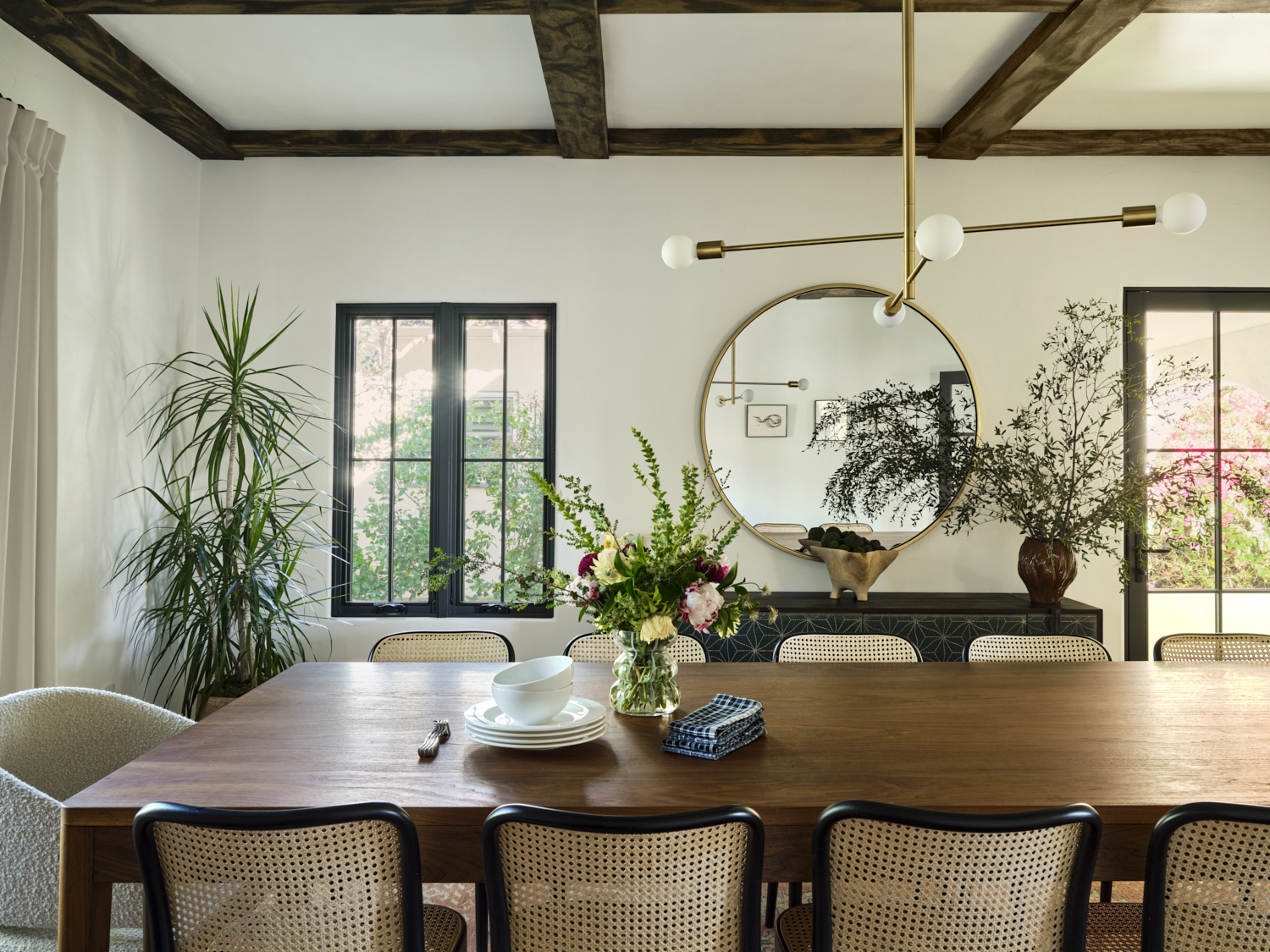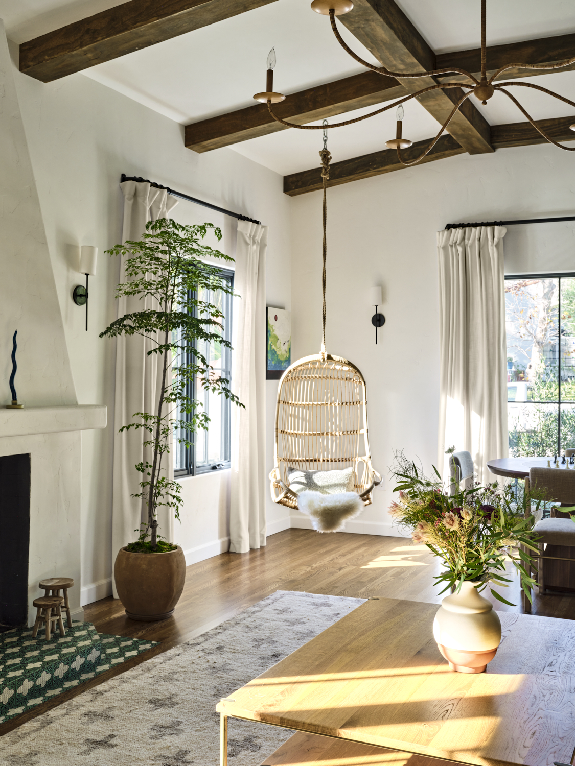 The kitchen is a masterful blend of bold design and warmth. Dark cabinetry contrasts beautifully with natural wood finishes, while brass accents on the pendant lights and hardware add a sophisticated touch. The handcrafted tile backsplash provides an intricate yet inviting focal point, framing the custom plaster hood. A clean, spacious quartz countertop anchors the room, offering a perfect balance between functionality and style. Exposed wood beams further enhance the space, giving it a rustic charm that feels both contemporary and grounded.