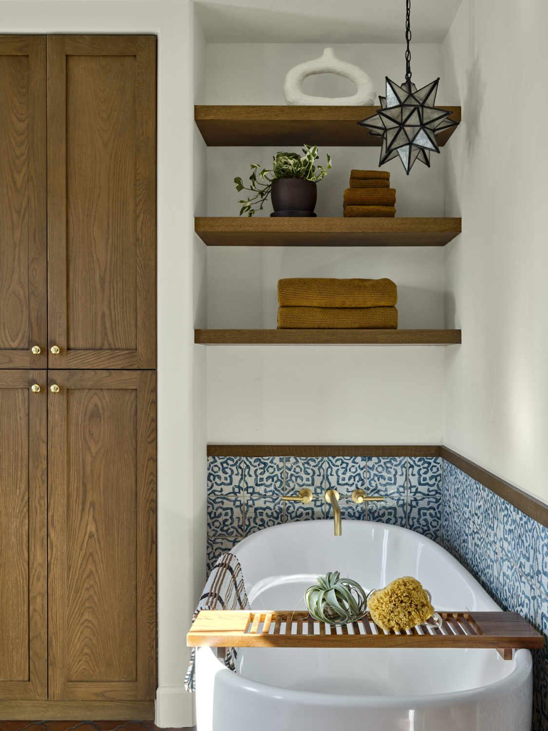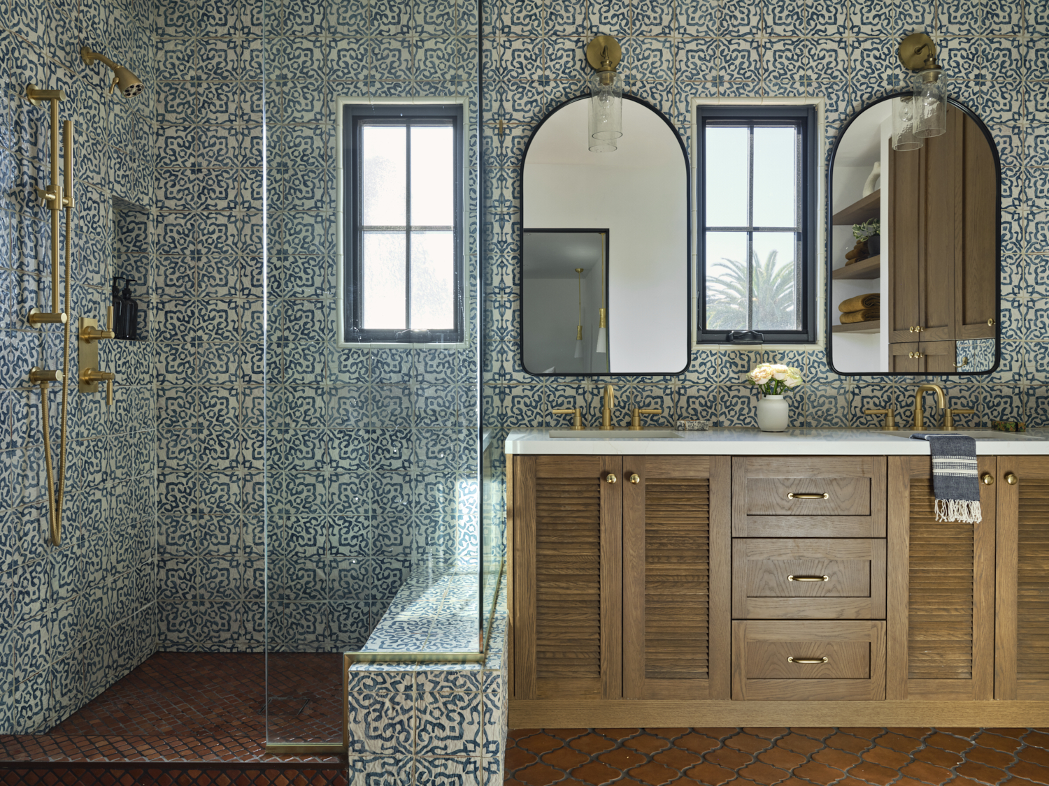 The primary bathroom is a stunning retreat inspired by Mediterranean elegance. A bold, intricate tile pattern envelopes the shower and walls, complemented by rich terracotta flooring. The custom oak vanity, complete with louvered cabinet doors, evokes a natural warmth while exuding luxury. Gold fixtures add a refined glow, paired with arched mirrors that perfectly frame the space. This bathroom is more than functional—it’s a serene sanctuary that blends artistry and sophistication.