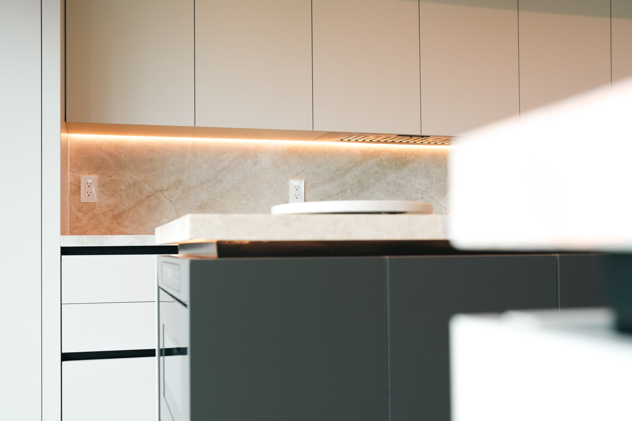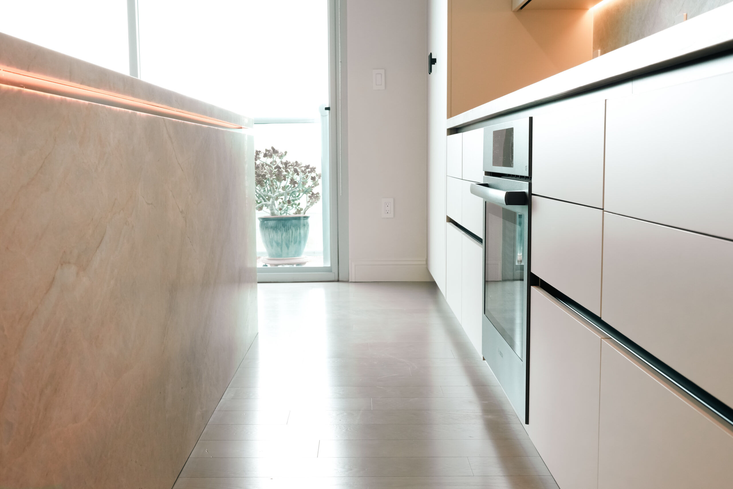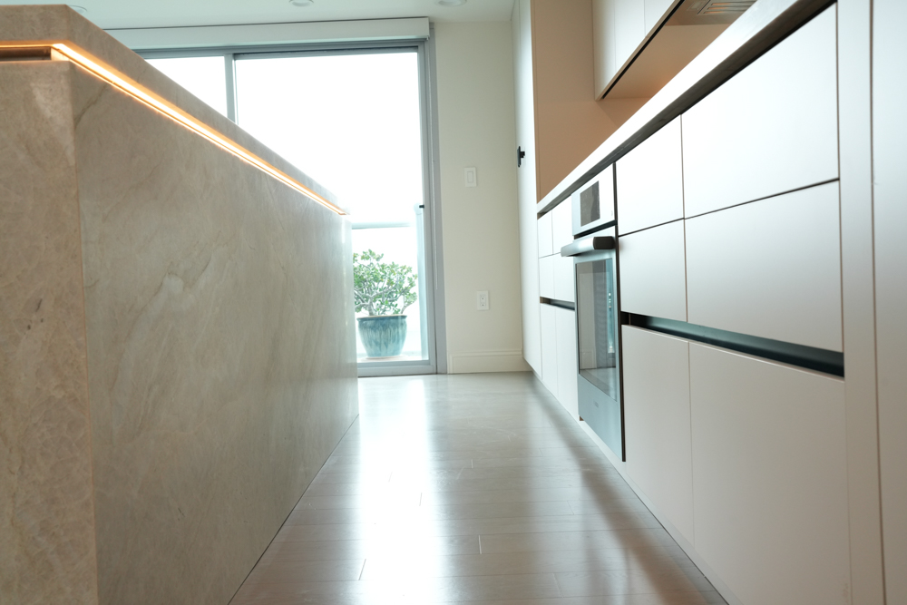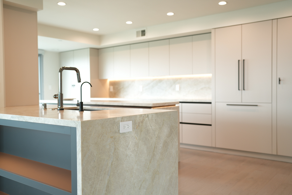 The kitchen serves as the architectural anchor of the home, featuring custom high-gloss lacquer cabinetry, Taj Mahal quartzite countertops, and a fully integrated modern lighting system that extends across the island and throughout the residence. Every detail—from cabinetry reveals to lighting temperature—was carefully considered to enhance both function and visual continuity. Engineered wide-plank flooring in subtle, natural tones runs throughout the main living spaces, reinforcing the penthouse’s clean, uninterrupted flow.