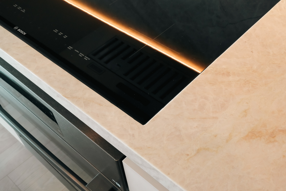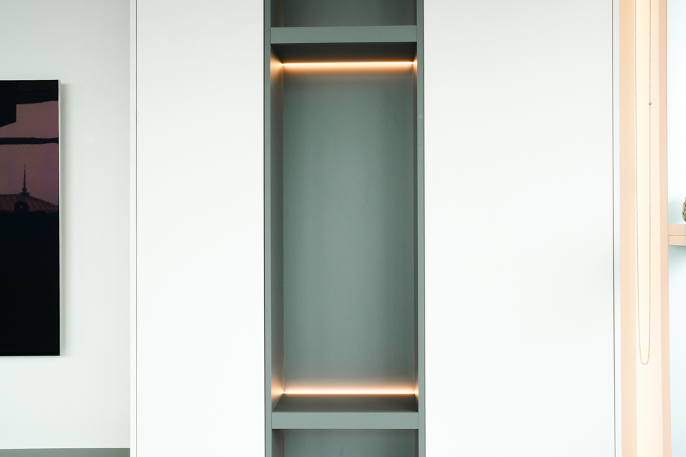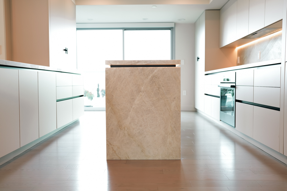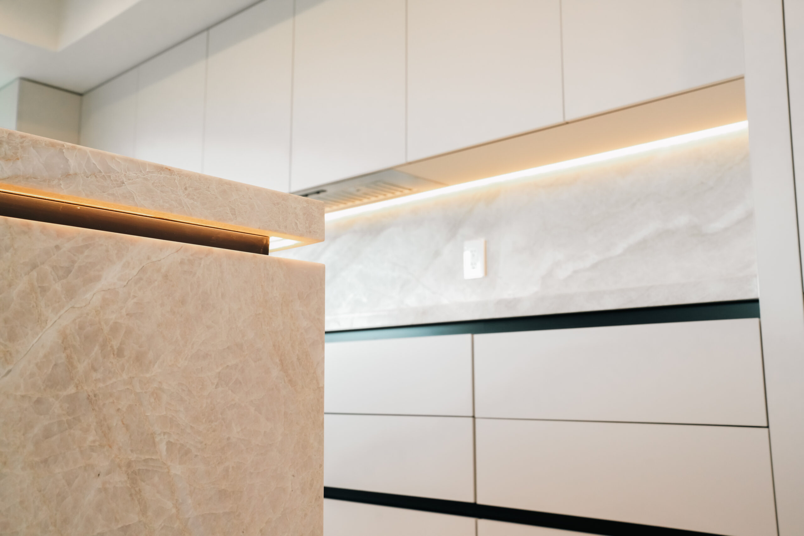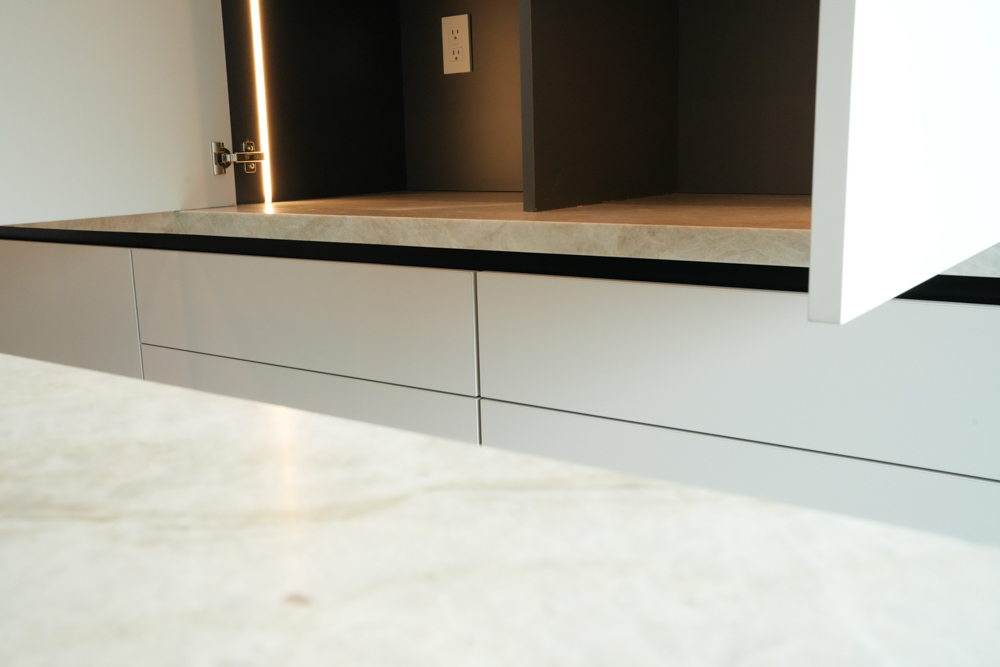 The kitchen serves as the architectural anchor of the home, featuring custom high-gloss lacquer cabinetry, Taj Mahal quartzite countertops, and a fully integrated modern lighting system that extends across the island and throughout the residence. Every detail—from cabinetry reveals to lighting temperature—was carefully considered to enhance both function and visual continuity. Engineered wide-plank flooring in subtle, natural tones runs throughout the main living spaces, reinforcing the penthouse’s clean, uninterrupted flow.