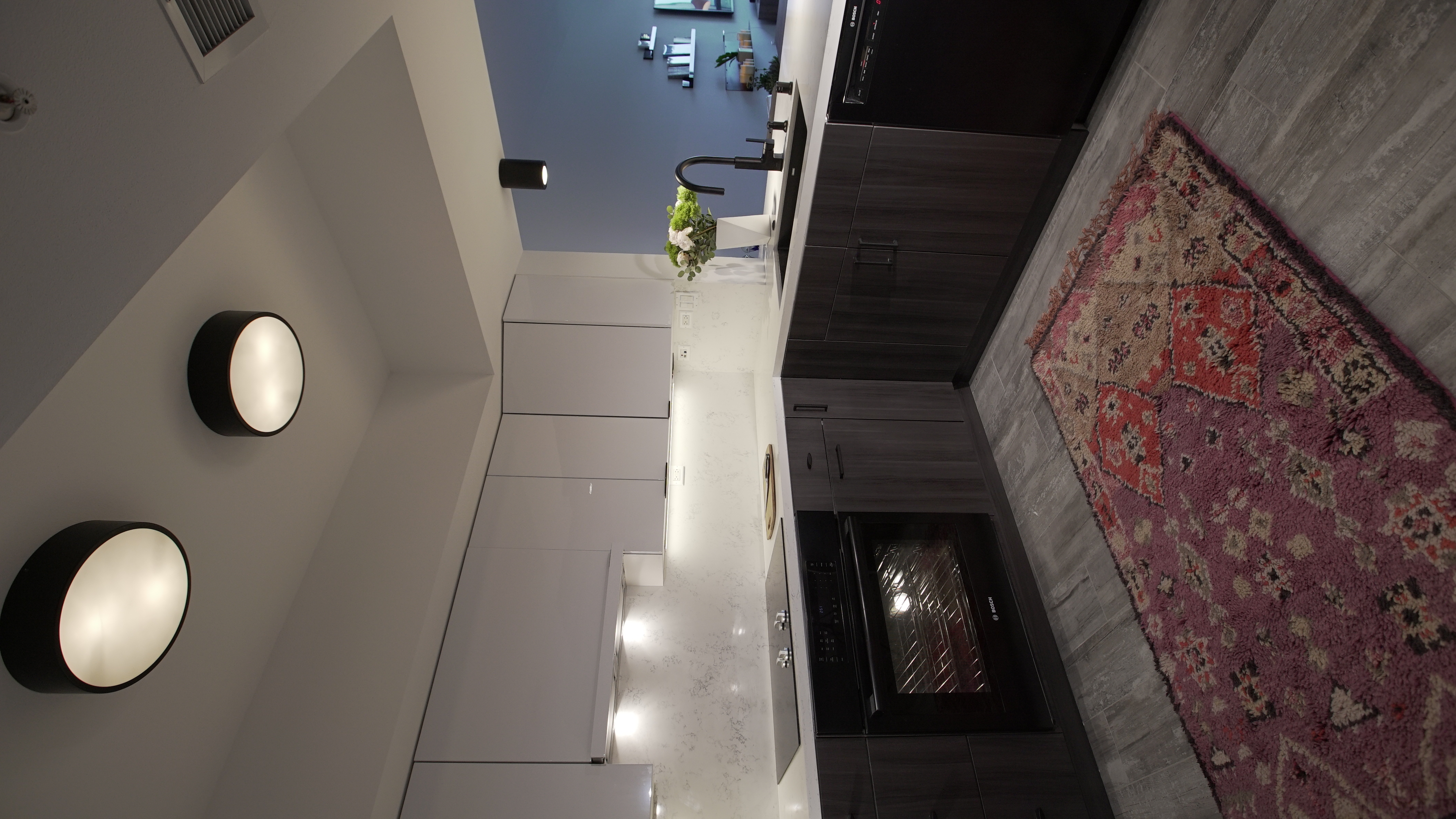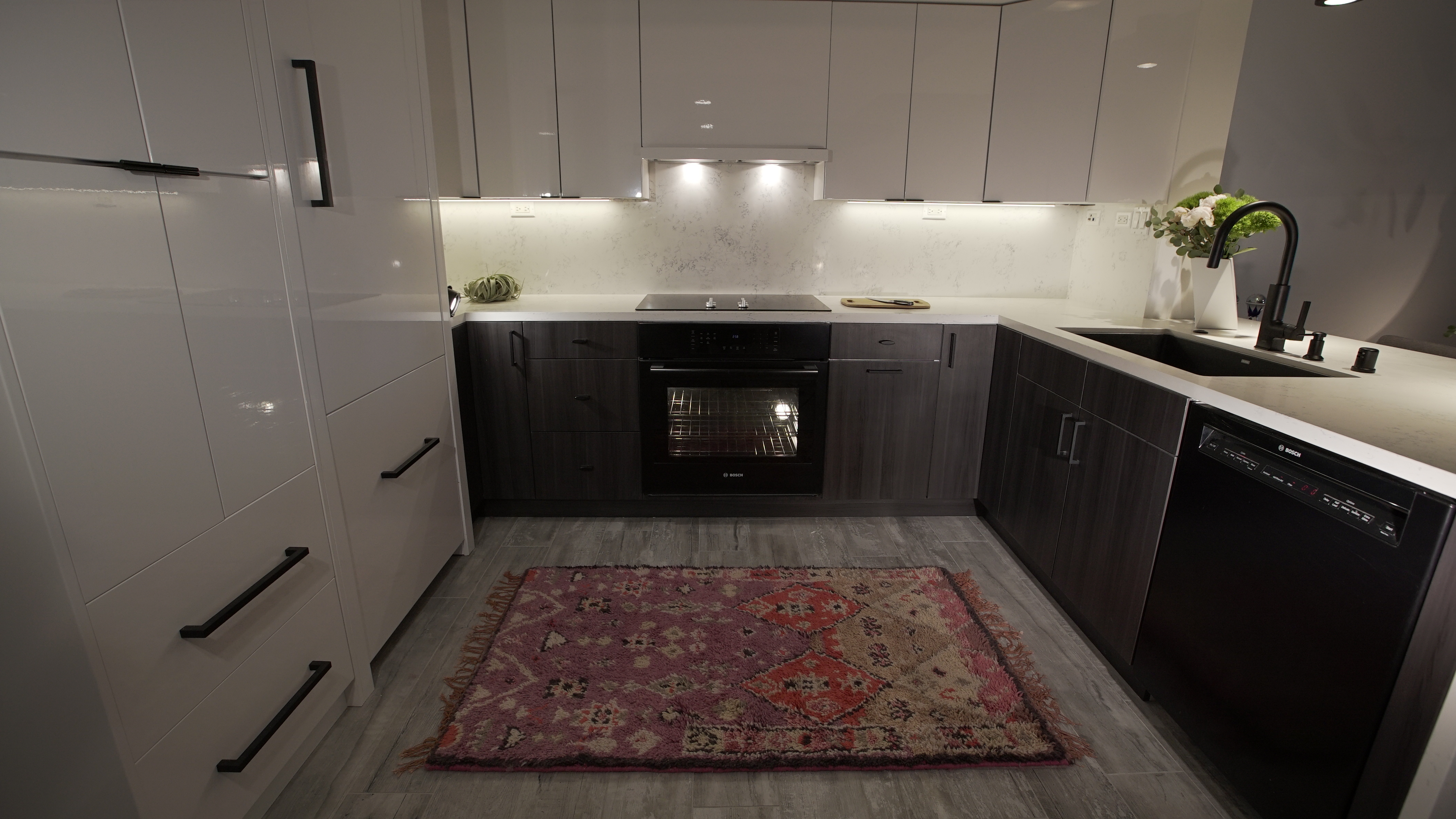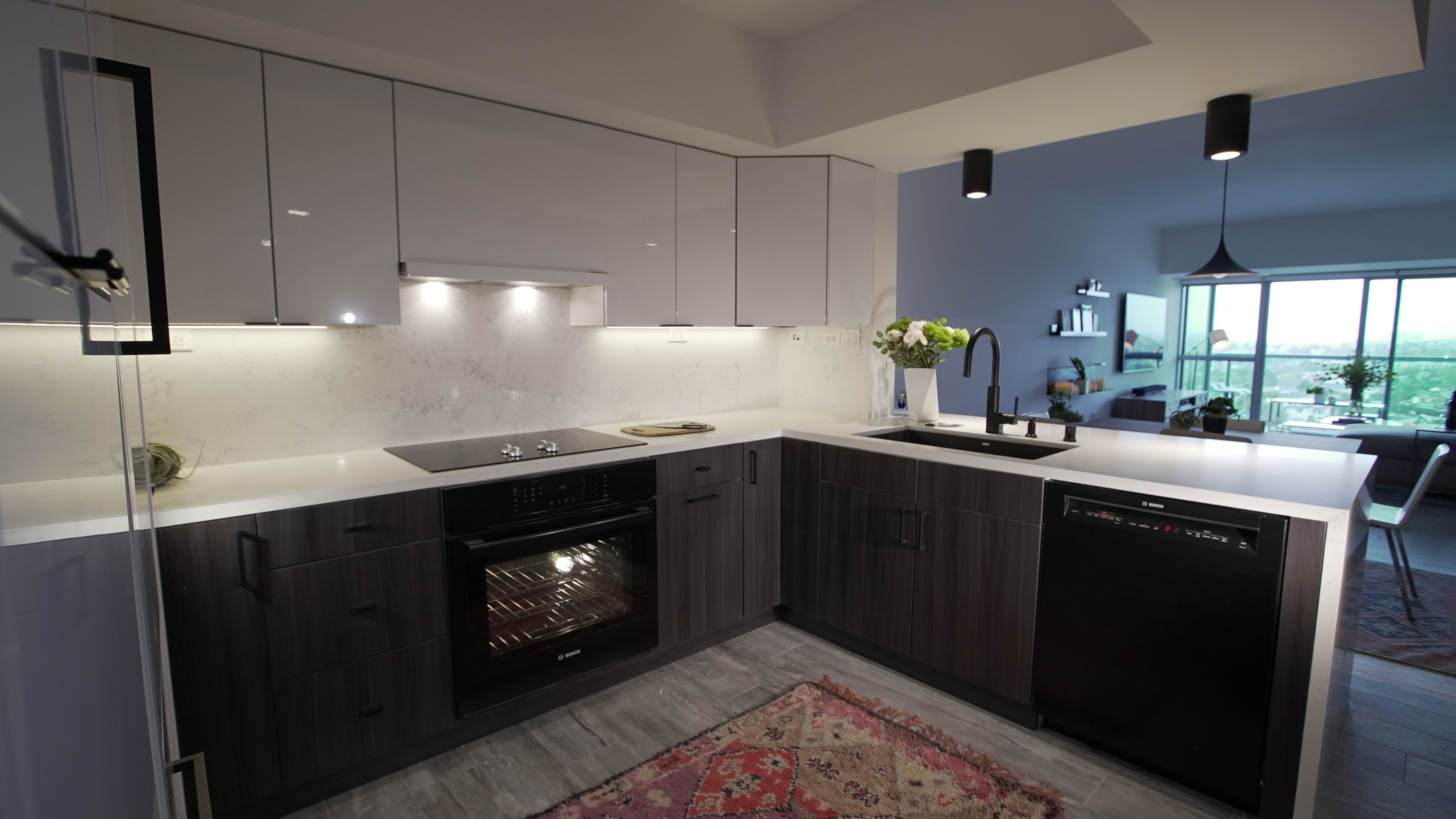 The kitchen anchors the space with high-gloss custom cabinetry in a crisp two-tone palette. White quartz countertops wrap seamlessly into a waterfall edge, creating a sculptural focal point that feels both bold and effortless. Every line is sharp. Every transition is deliberate.