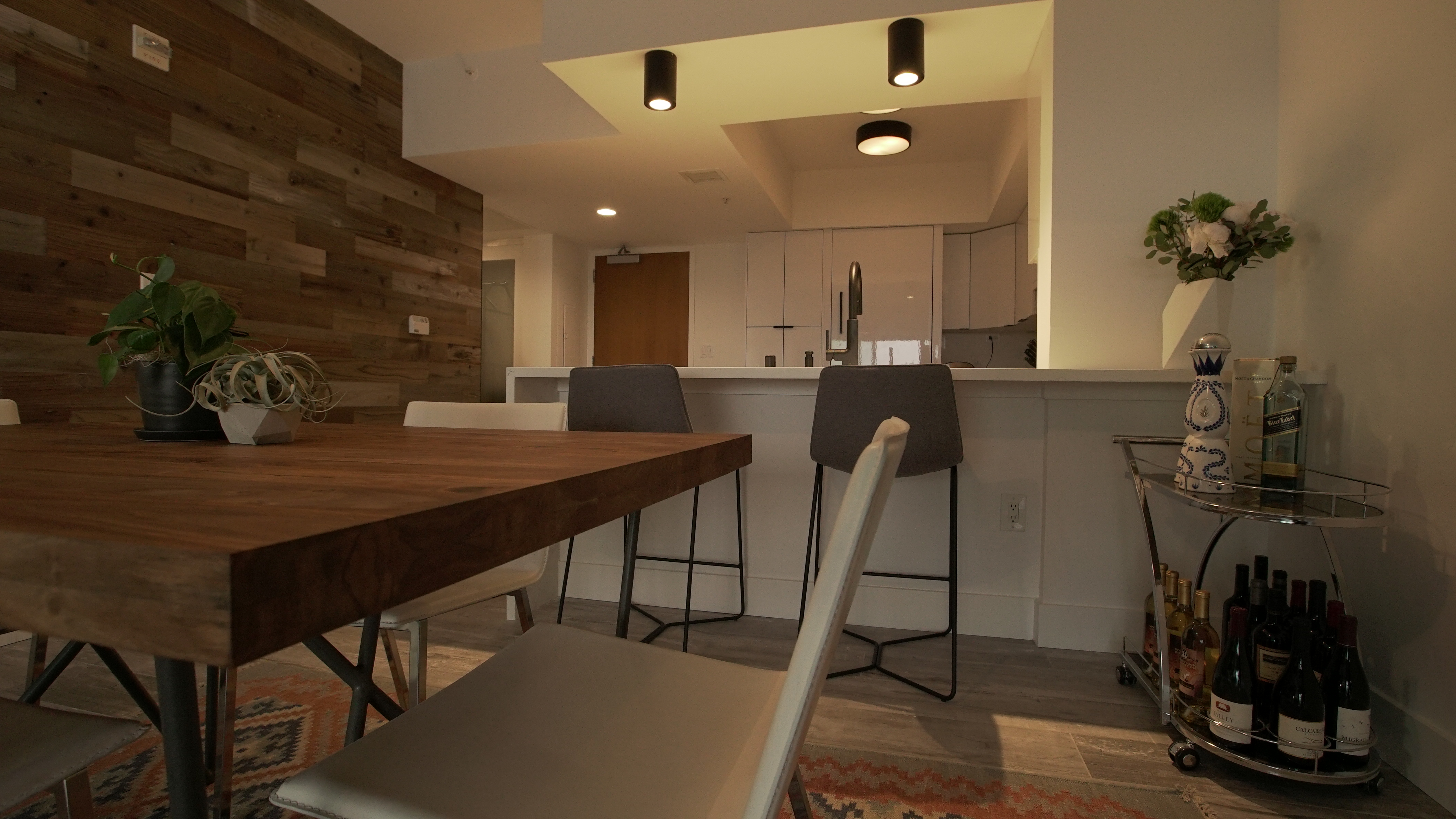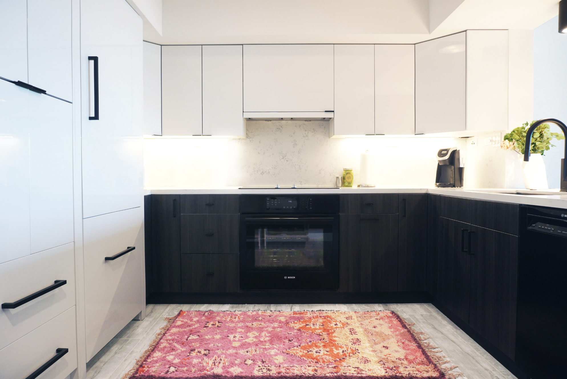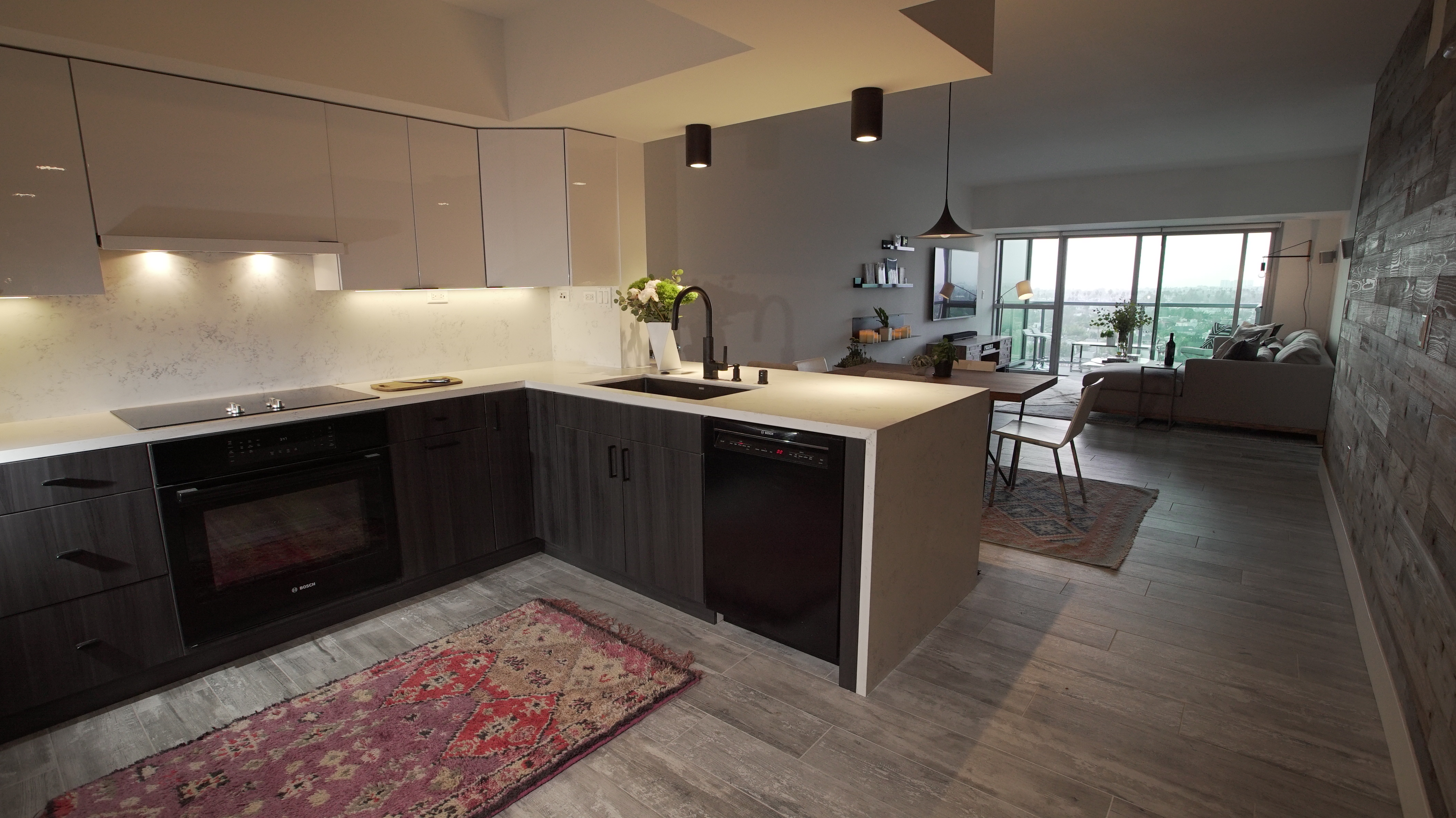 The kitchen anchors the space with high-gloss custom cabinetry in a crisp two-tone palette. White quartz countertops wrap seamlessly into a waterfall edge, creating a sculptural focal point that feels both bold and effortless. Every line is sharp. Every transition is deliberate.