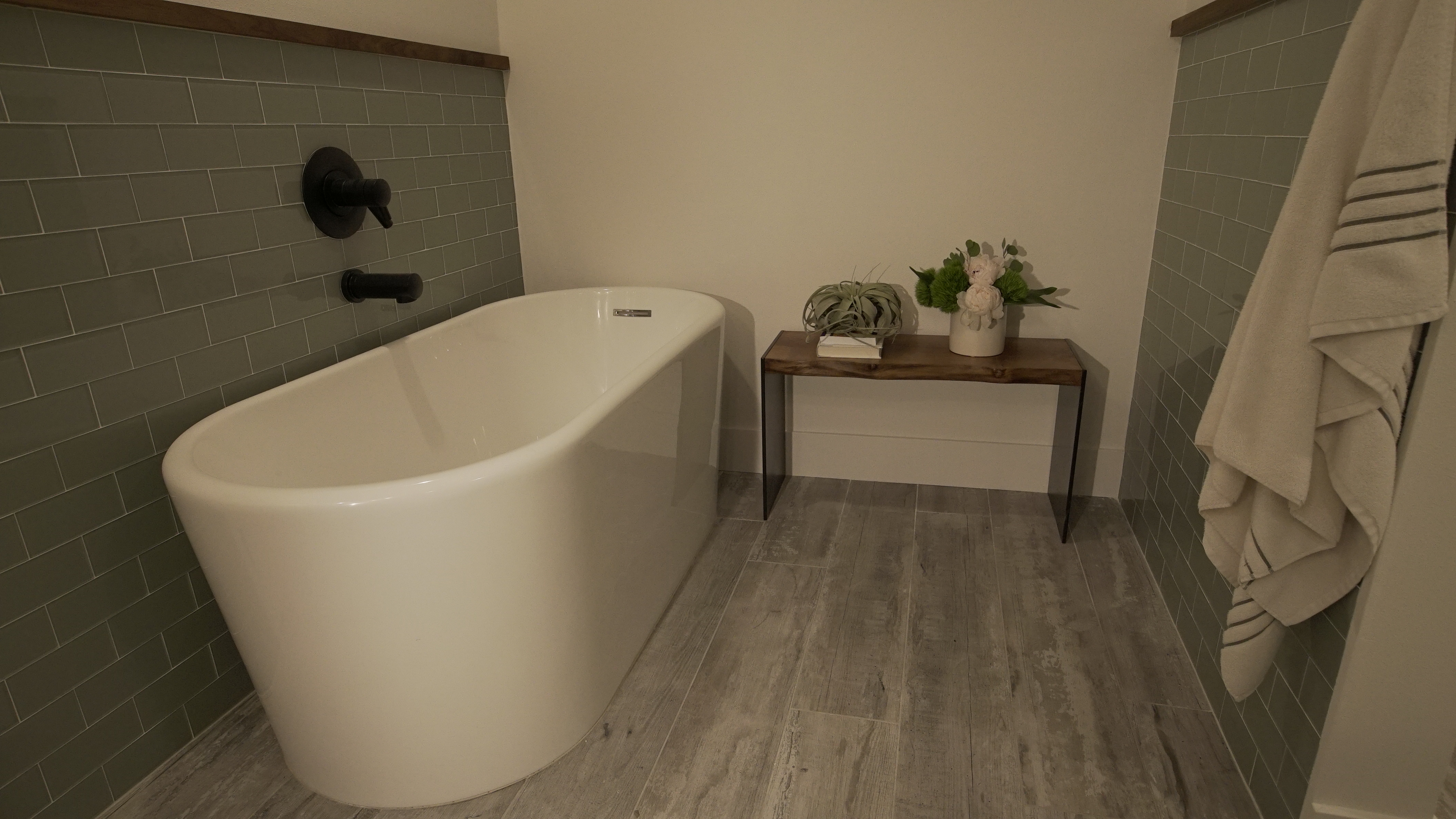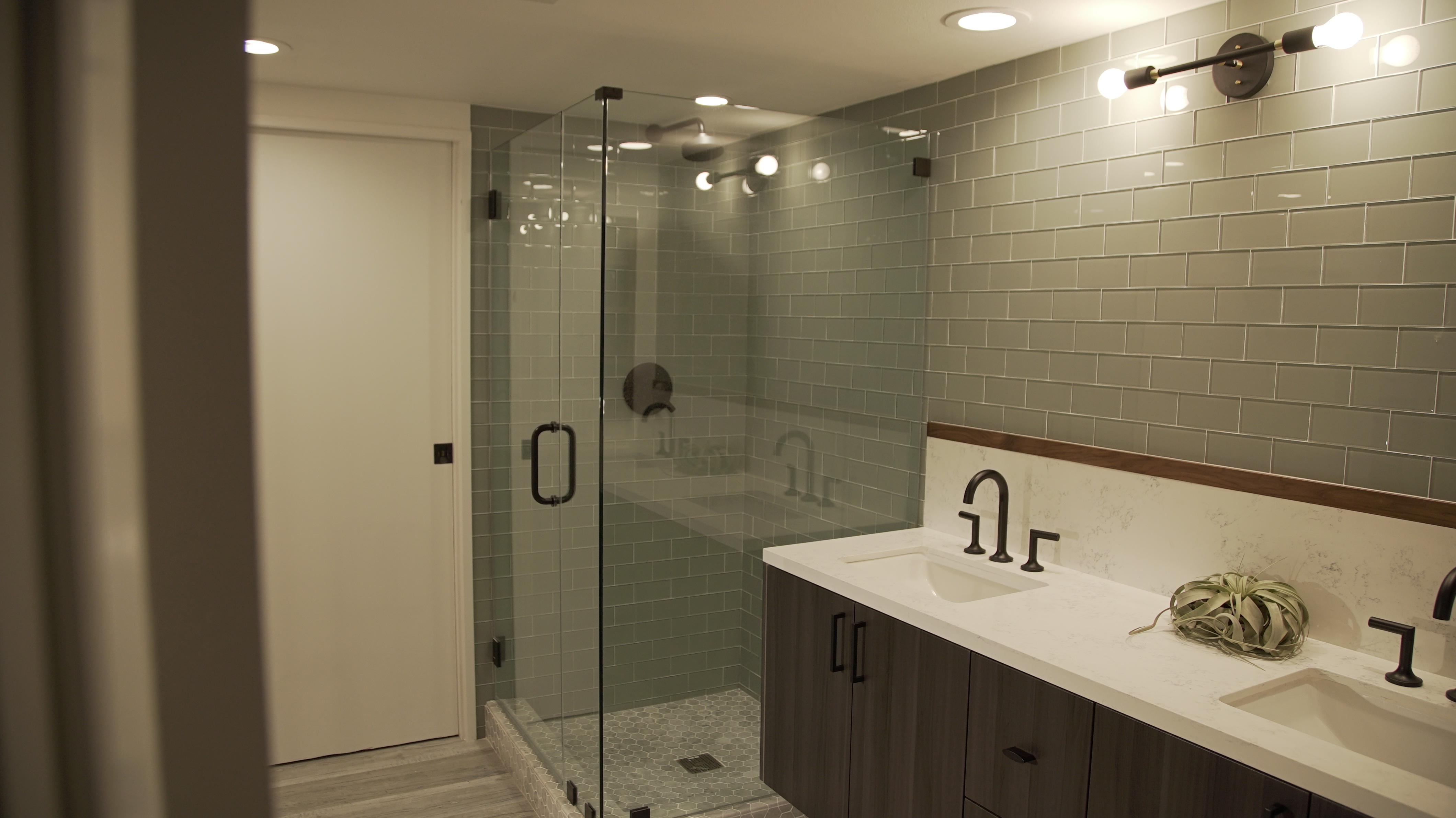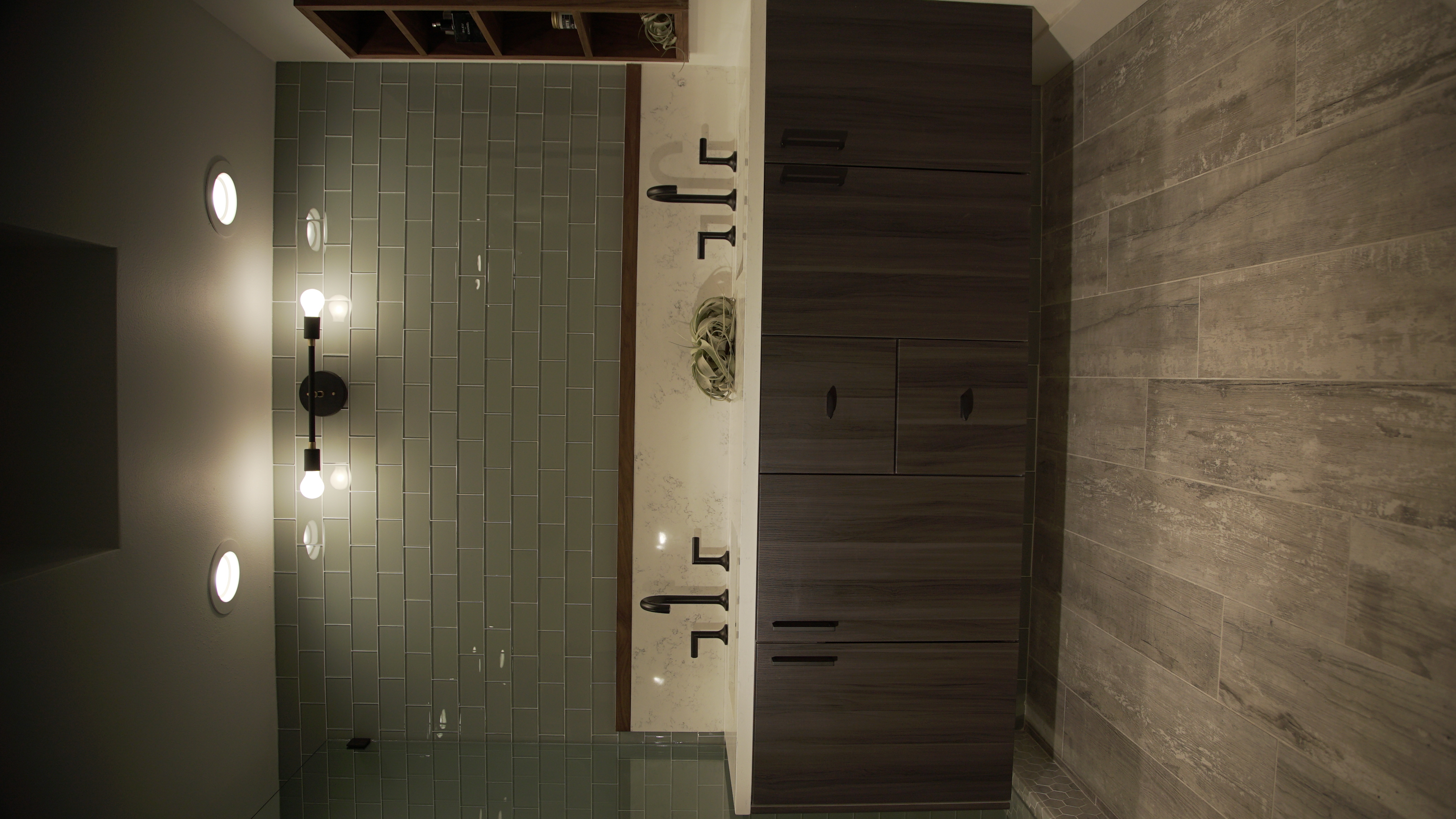 Throughout the home, materials were selected for contrast and warmth. In the bathrooms, mosaic glass subway tiles introduce texture and movement, reflecting light in subtle, sophisticated ways. Quartz surfaces maintain continuity, while walnut accents soften the composition and bring balance to the modern aesthetic.