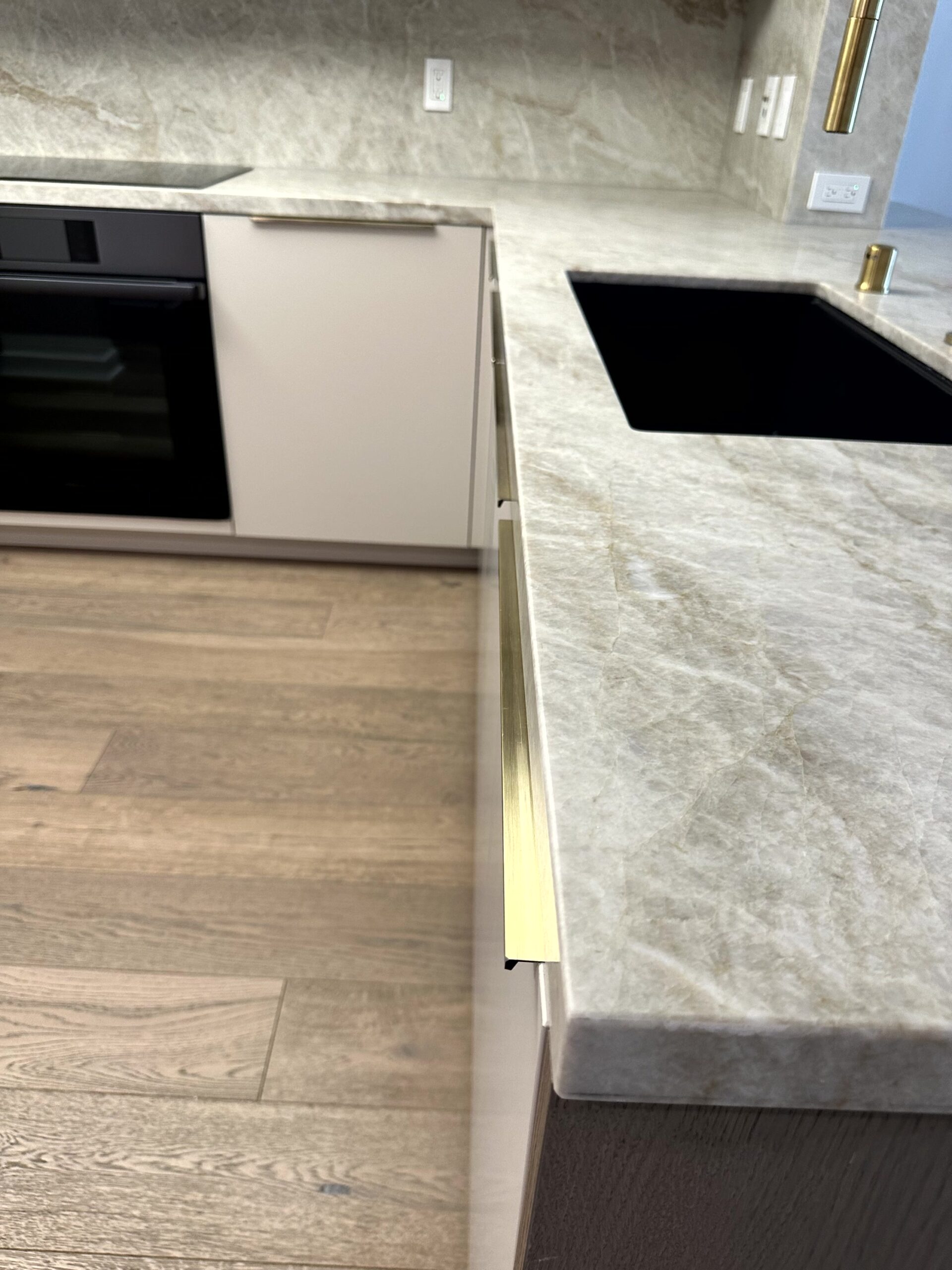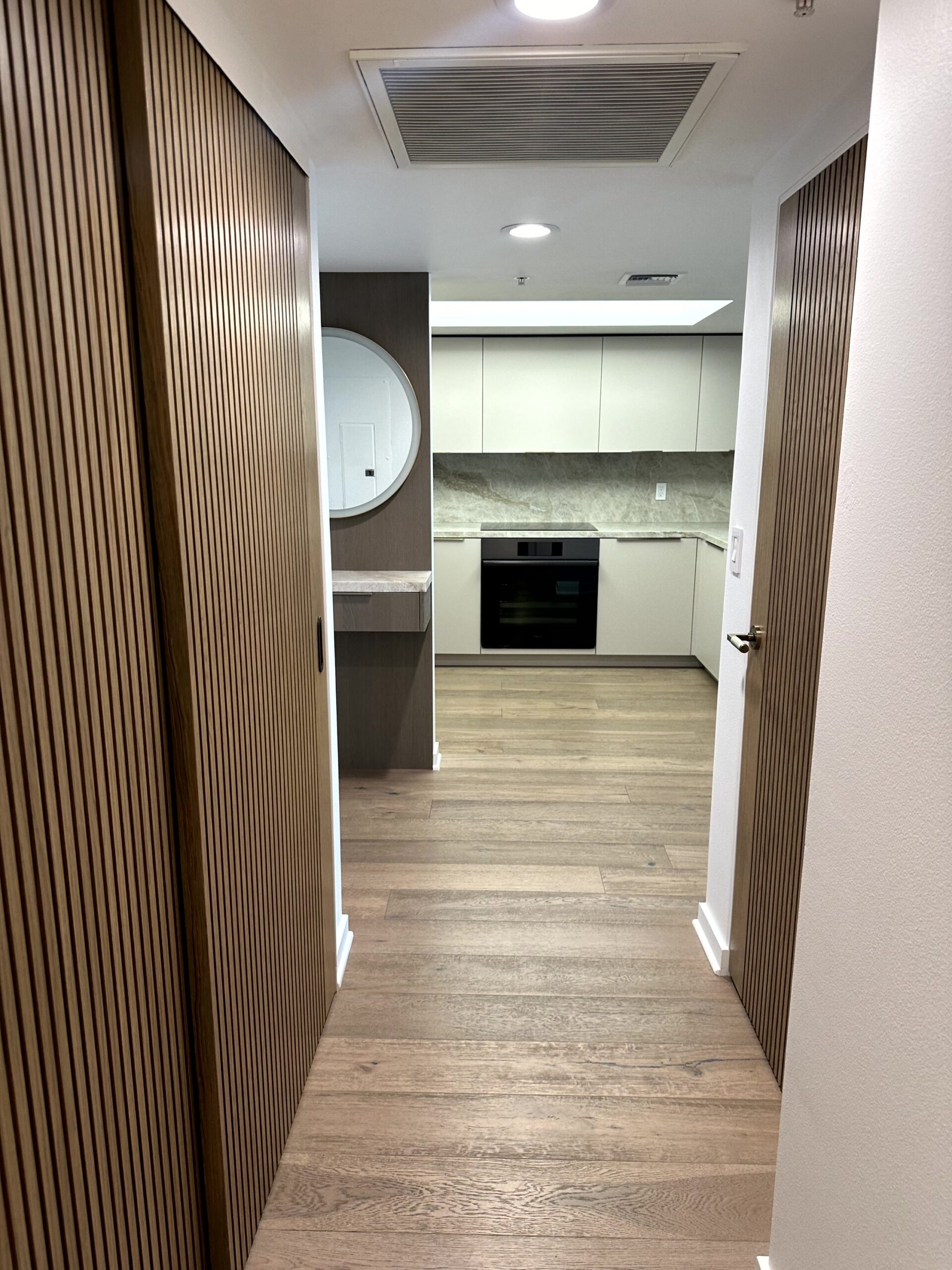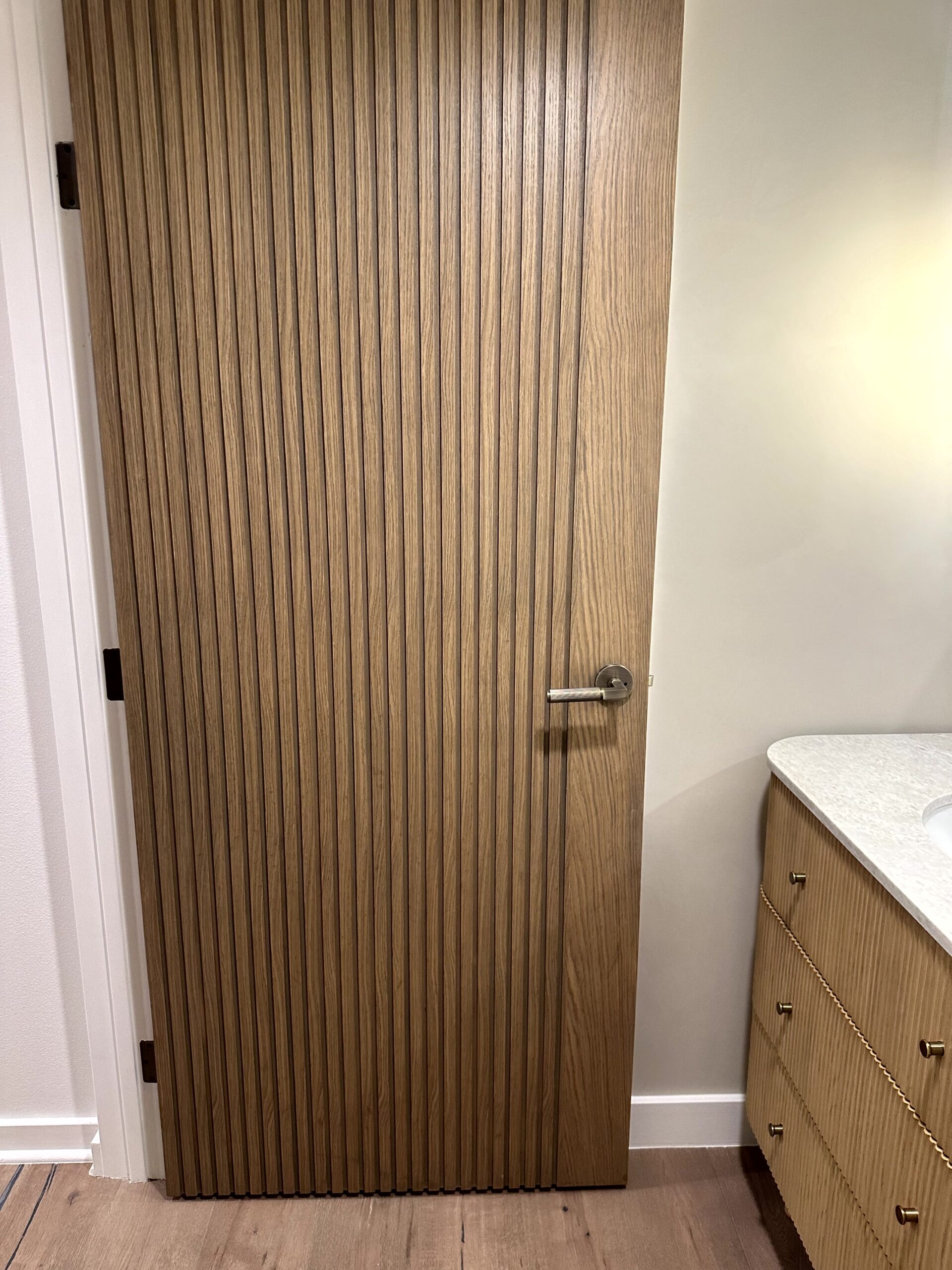 To maintain a cohesive design, we crafted custom doors featuring a white oak fluted design and installed engineered hardwood flooring throughout the apartment, enhancing the natural aesthetic. Brass accents were thoughtfully used for fixtures, faucets, and detailing, providing subtle yet striking highlights.