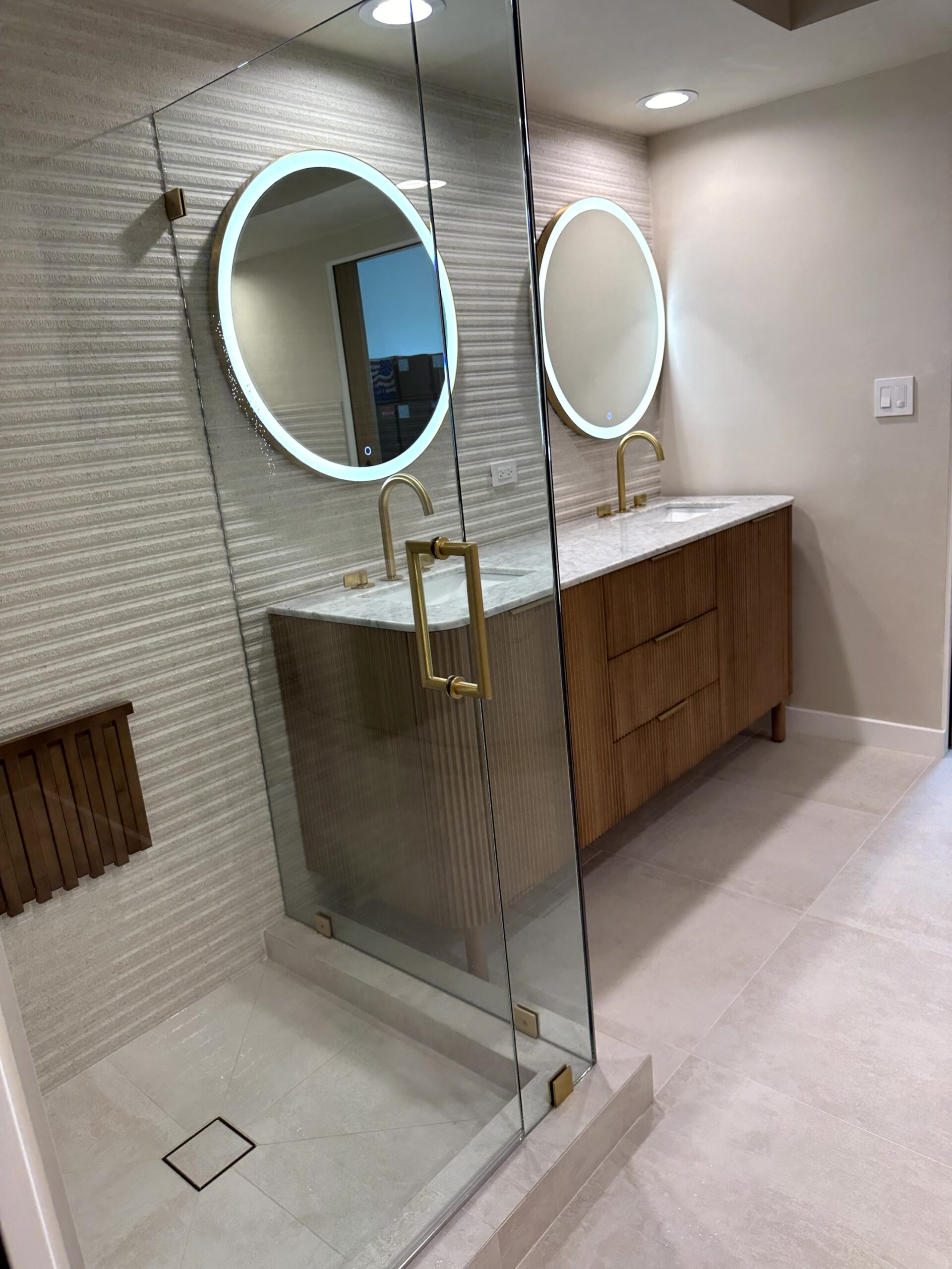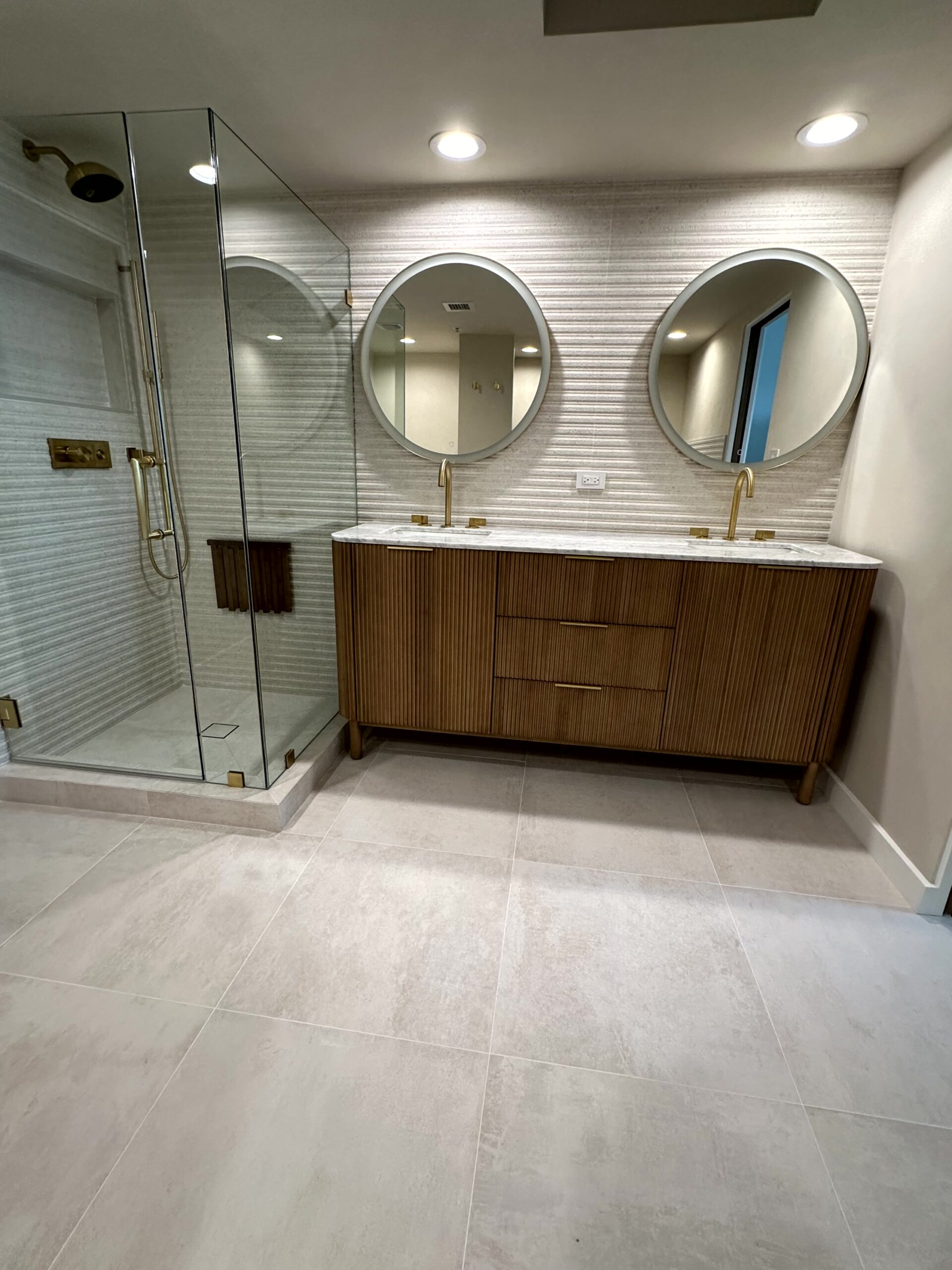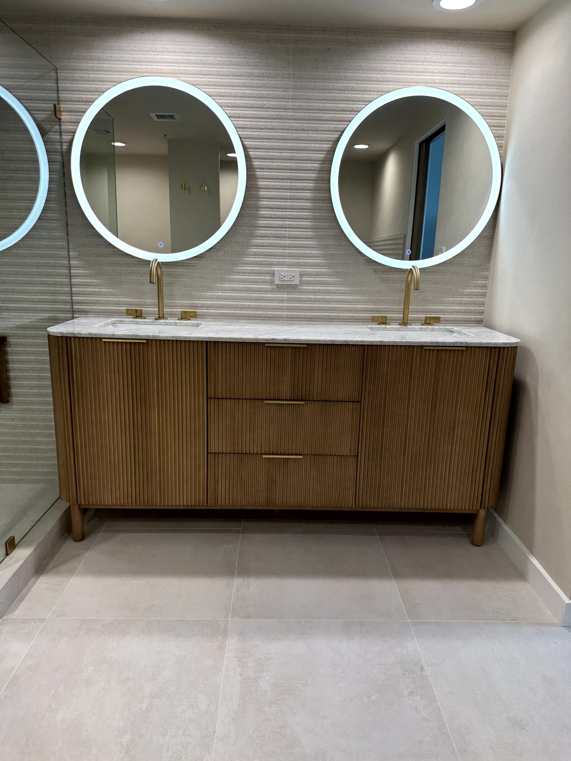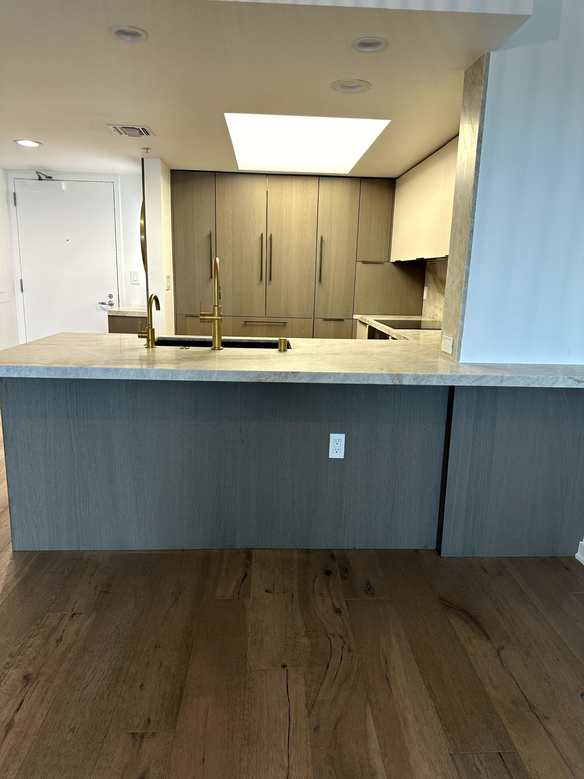 To maintain a cohesive design, we crafted custom doors featuring a white oak fluted design and installed engineered hardwood flooring throughout the apartment, enhancing the natural aesthetic. Brass accents were thoughtfully used for fixtures, faucets, and detailing, providing subtle yet striking highlights.