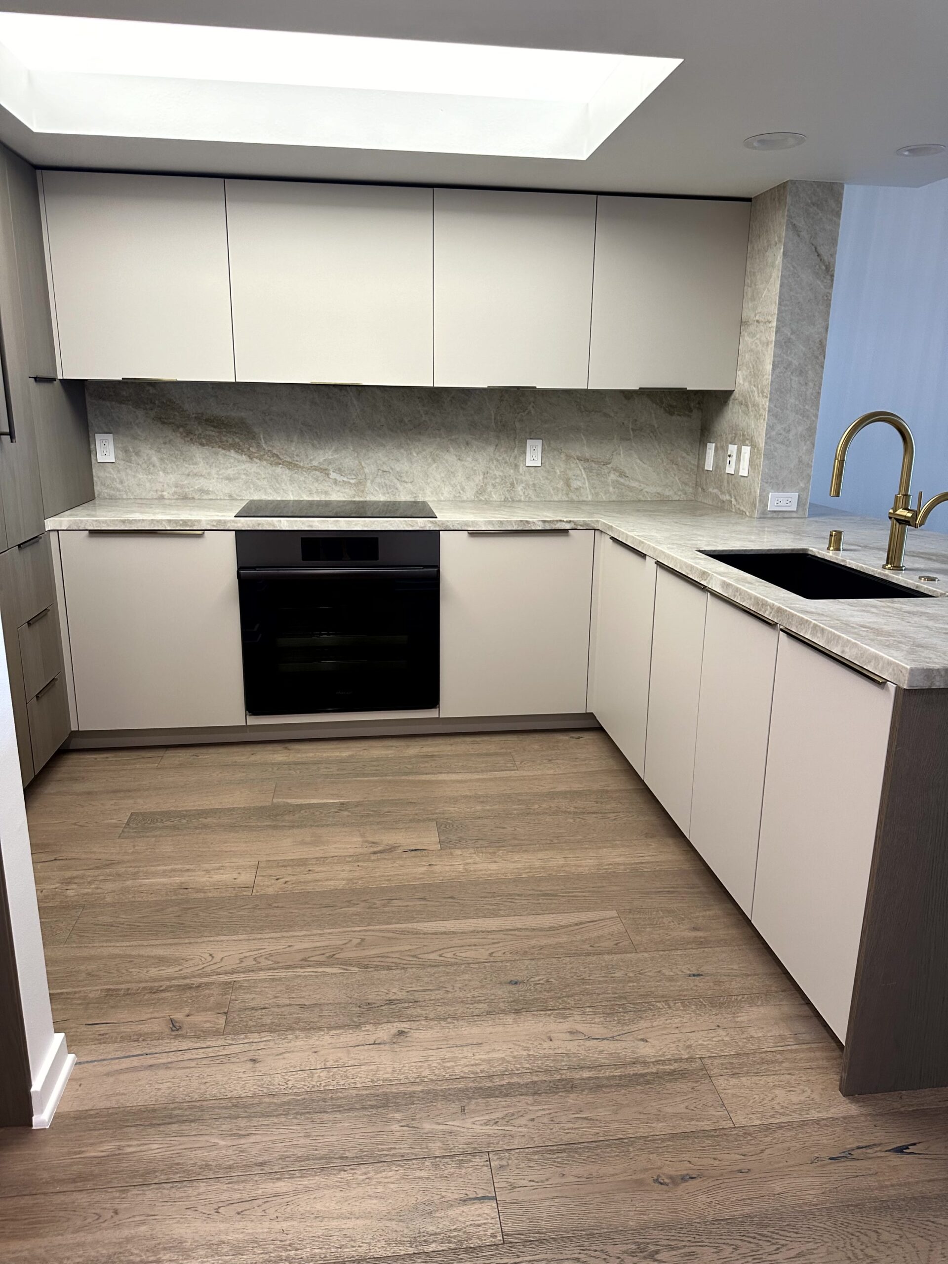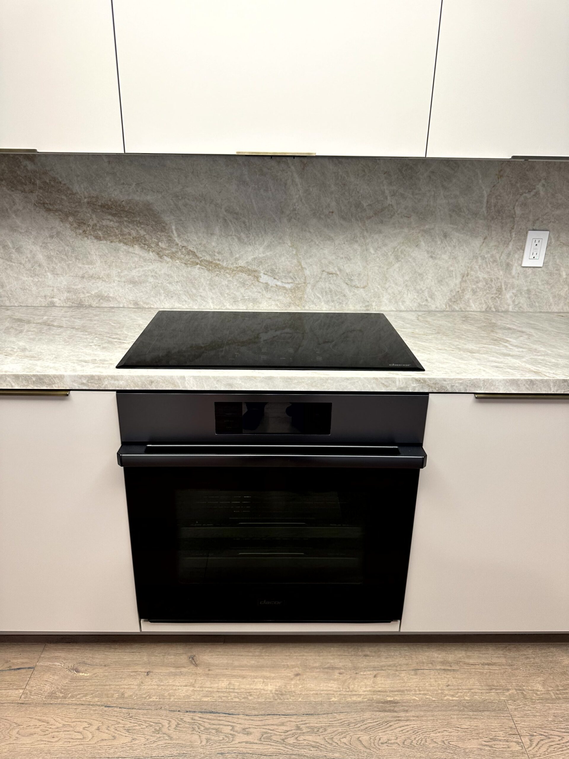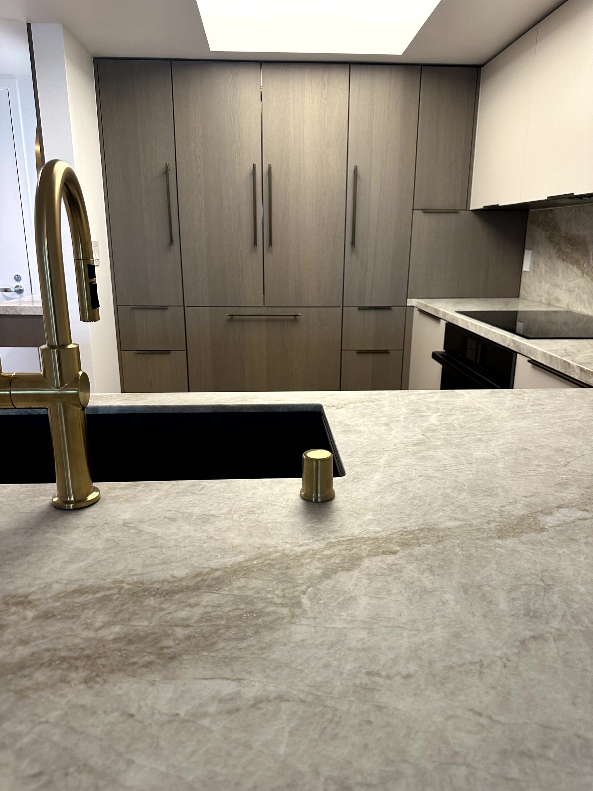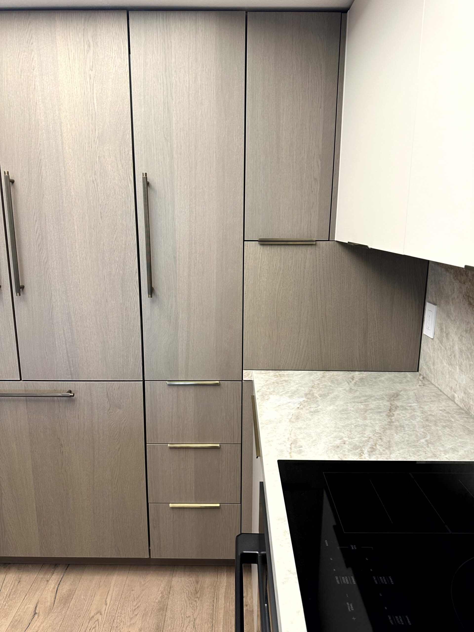 We were commissioned to renovate this 1,400-square-foot modern apartment, focusing on introducing a natural color palette and warm materials to create an inviting yet sophisticated atmosphere. To achieve this, we selected Perla quartzite for the kitchen counters, adding elegance and durability. For contrast, we incorporated graphite-colored Décor appliances, which paired beautifully with the warmth of custom white oak kitchen cabinets.