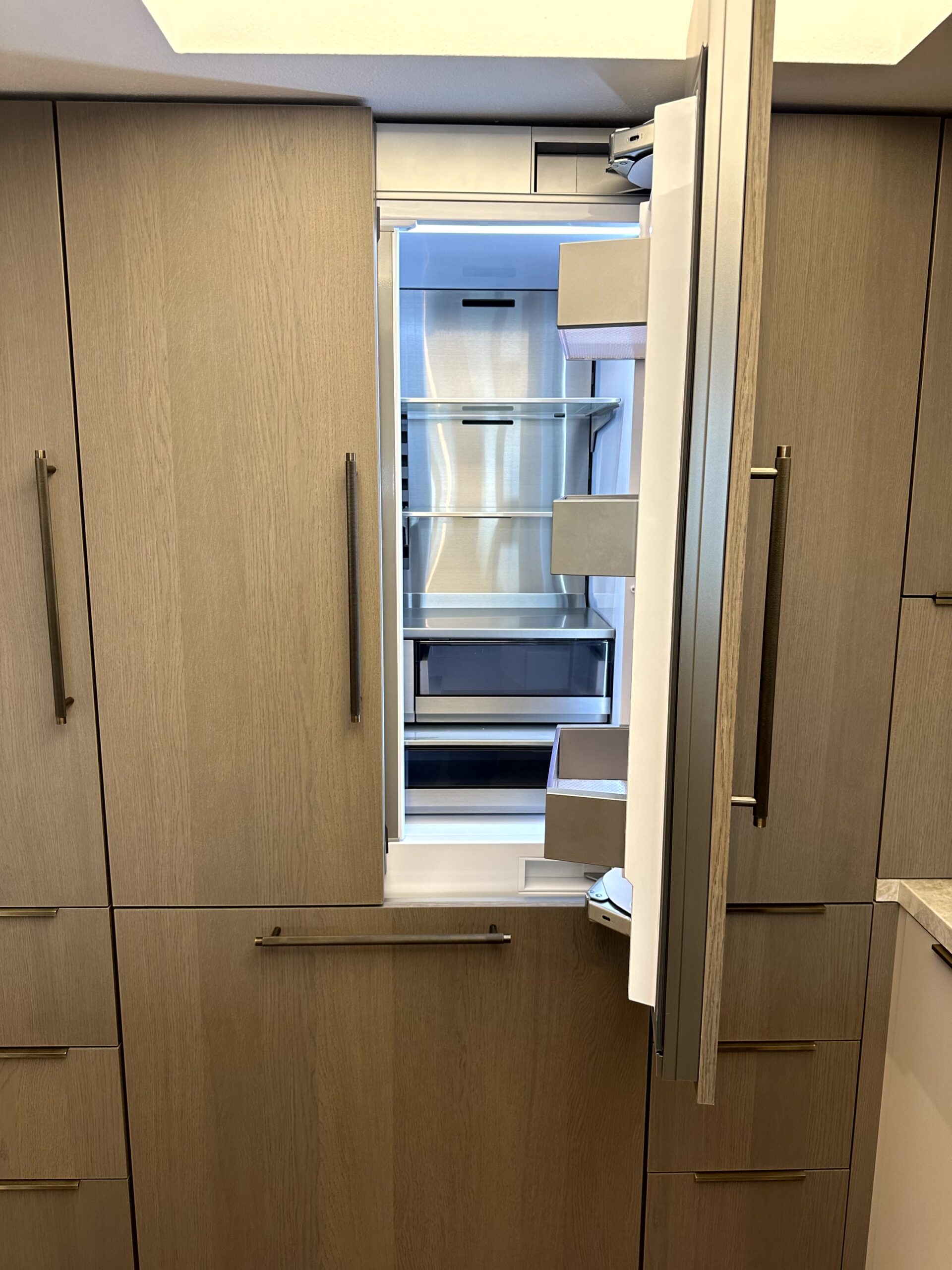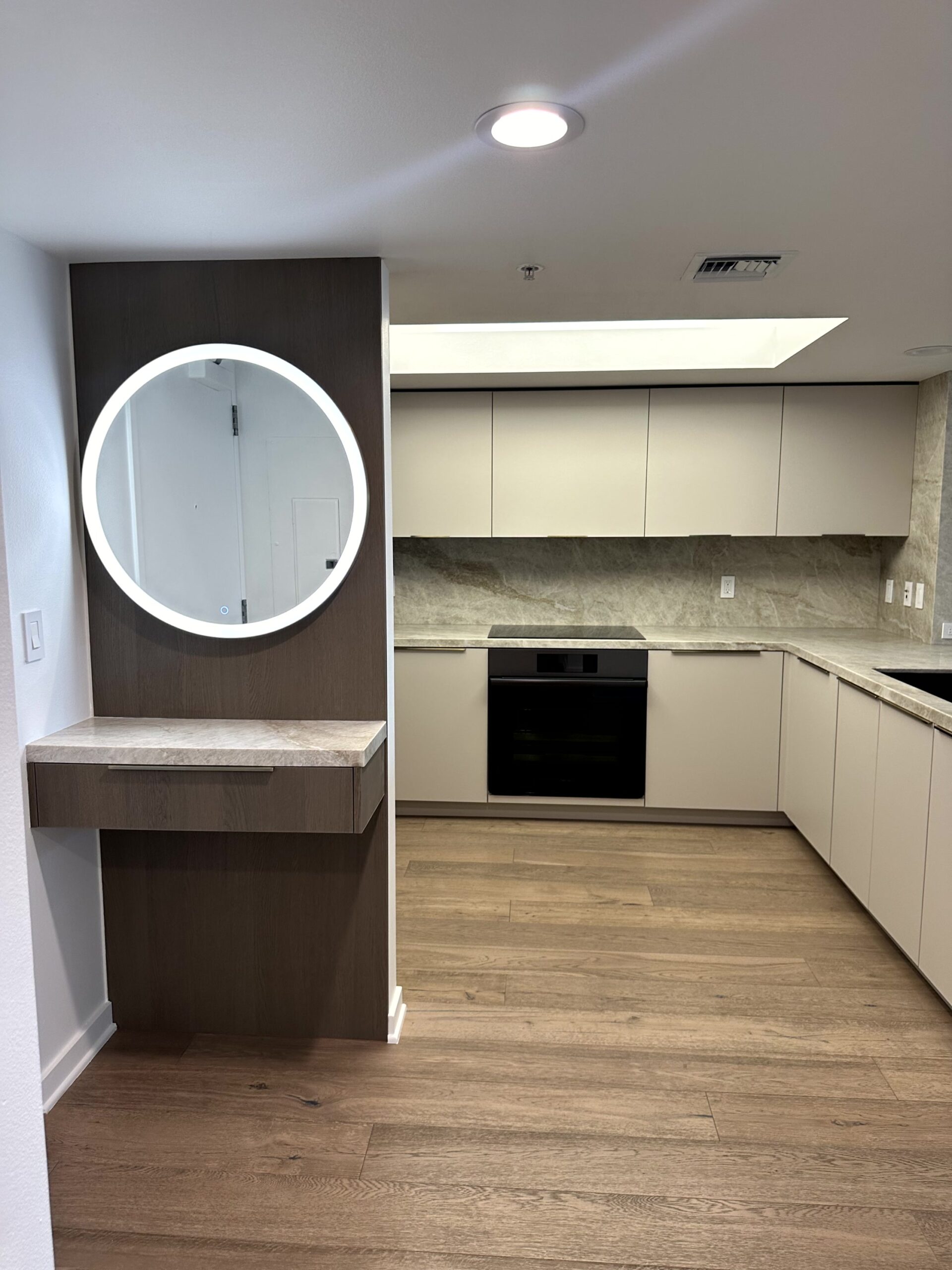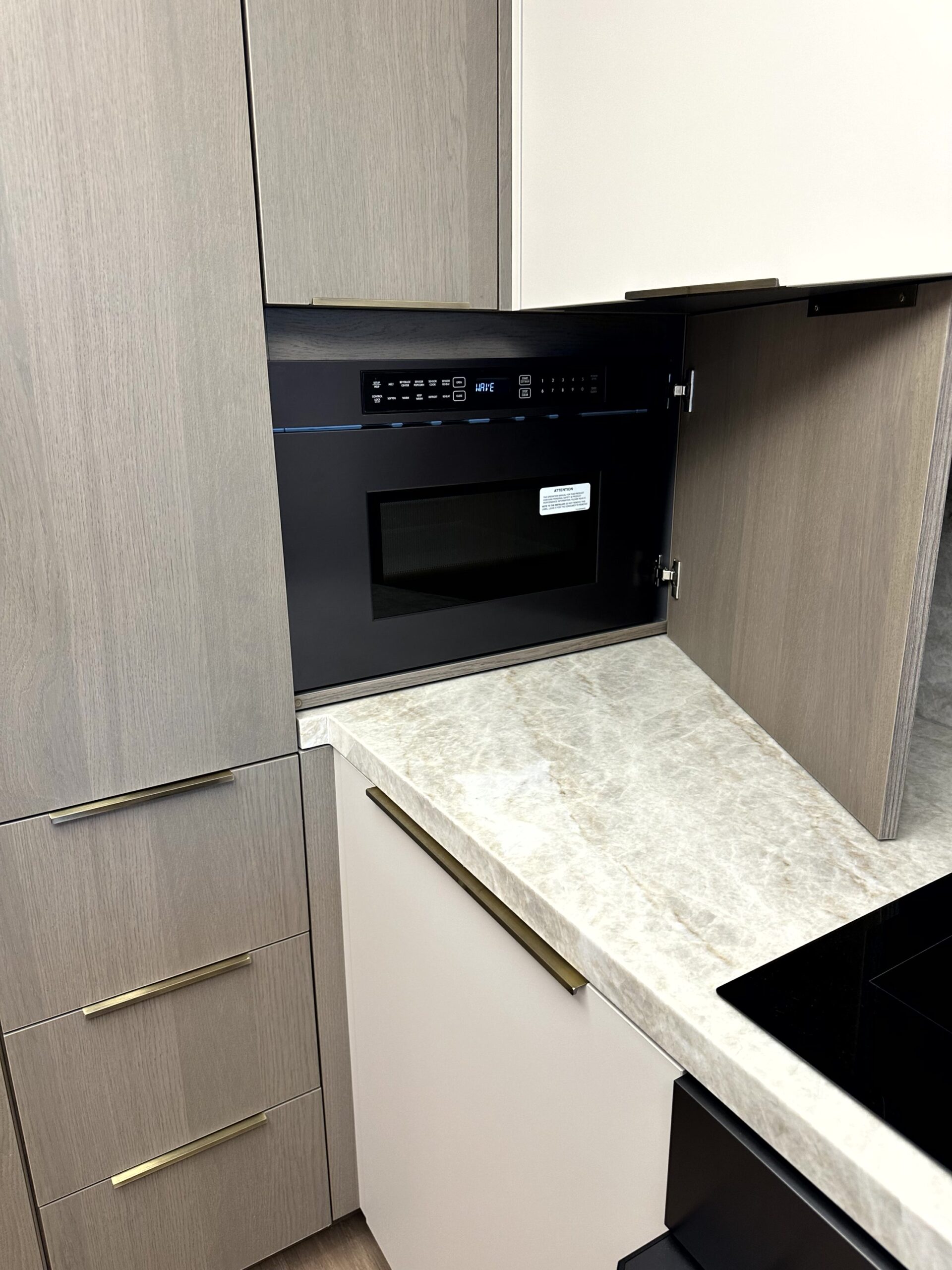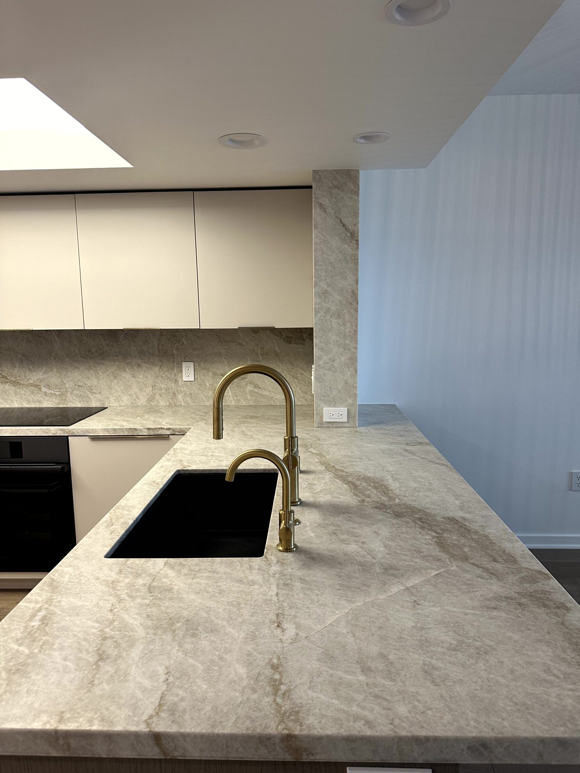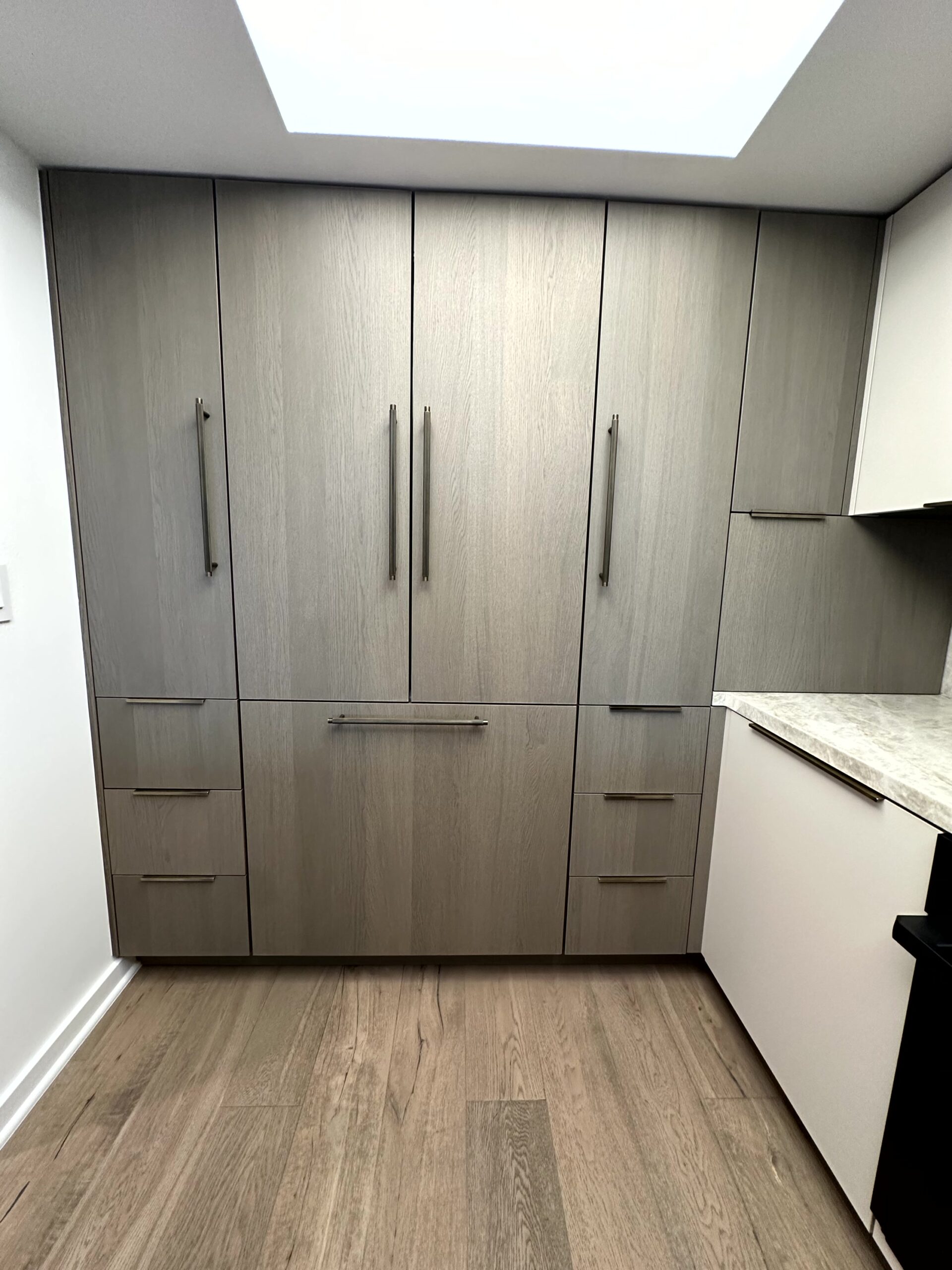 We were commissioned to renovate this 1,400-square-foot modern apartment, focusing on introducing a natural color palette and warm materials to create an inviting yet sophisticated atmosphere. To achieve this, we selected Perla quartzite for the kitchen counters, adding elegance and durability. For contrast, we incorporated graphite-colored Décor appliances, which paired beautifully with the warmth of custom white oak kitchen cabinets.
