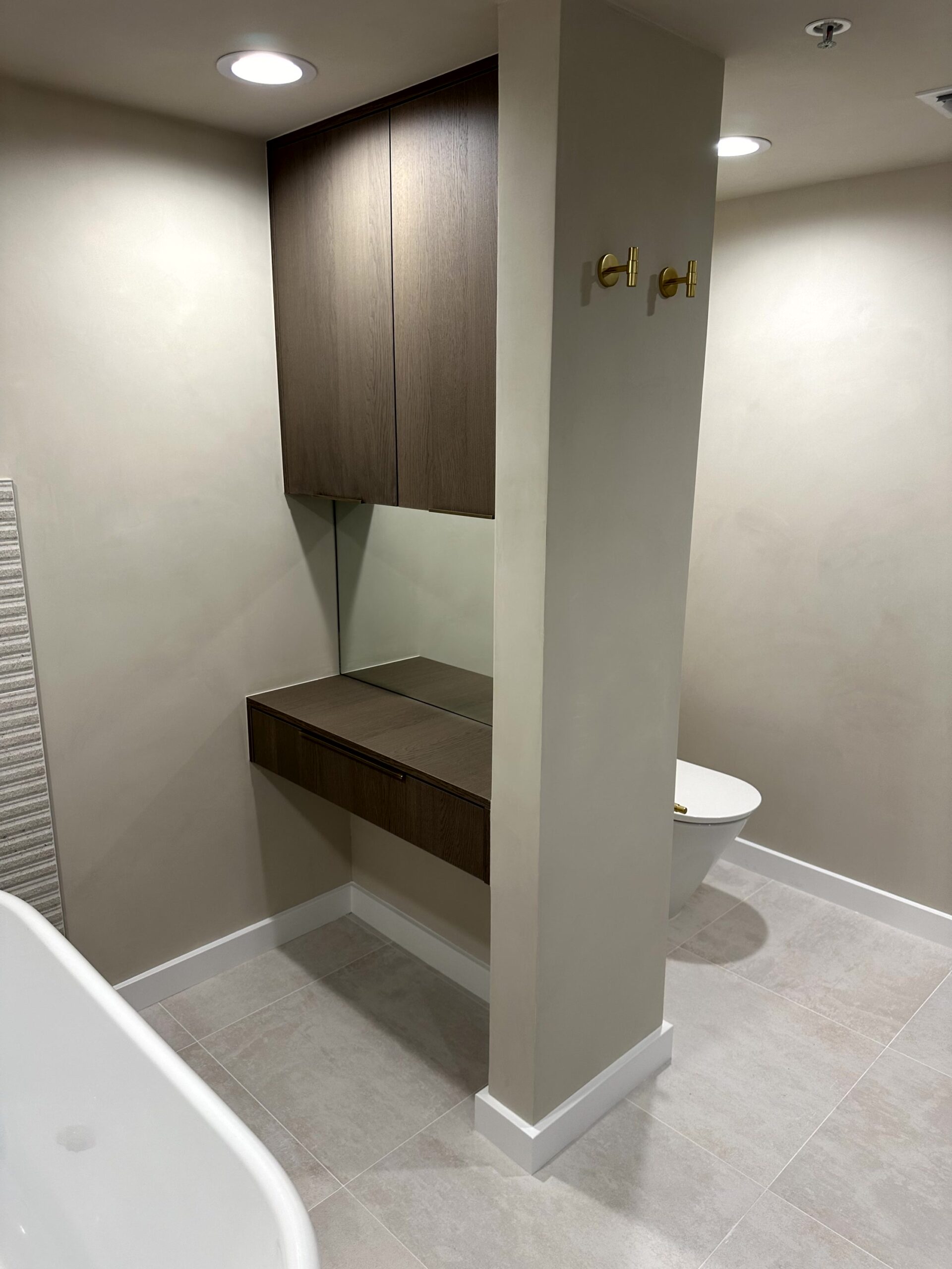 In the bathrooms, we embraced Roman clay-style finishes, offering a textured and timeless look that complemented the overall design. This renovation harmoniously blended modern elements with natural materials, resulting in a warm, contemporary living space that exudes both style and comfort.