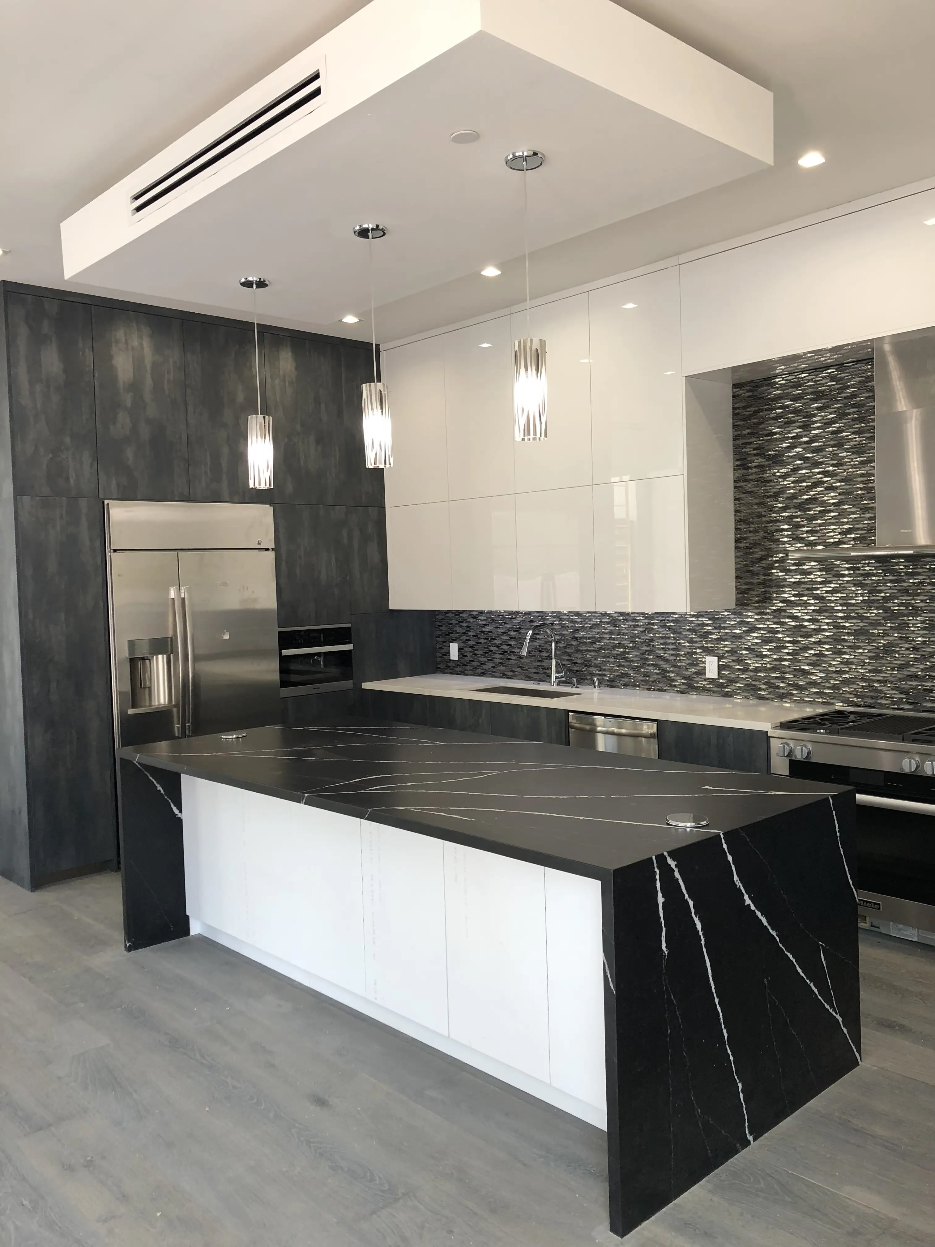 High-gloss white lacquer millwork reflects light like polished stone, amplifying scale and clarity. Dark oak wide-plank flooring introduces depth and grounded warmth beneath the modern envelope. Designer decorative tile selections punctuate the home with texture and curated detail — not ornamental, but intentional.