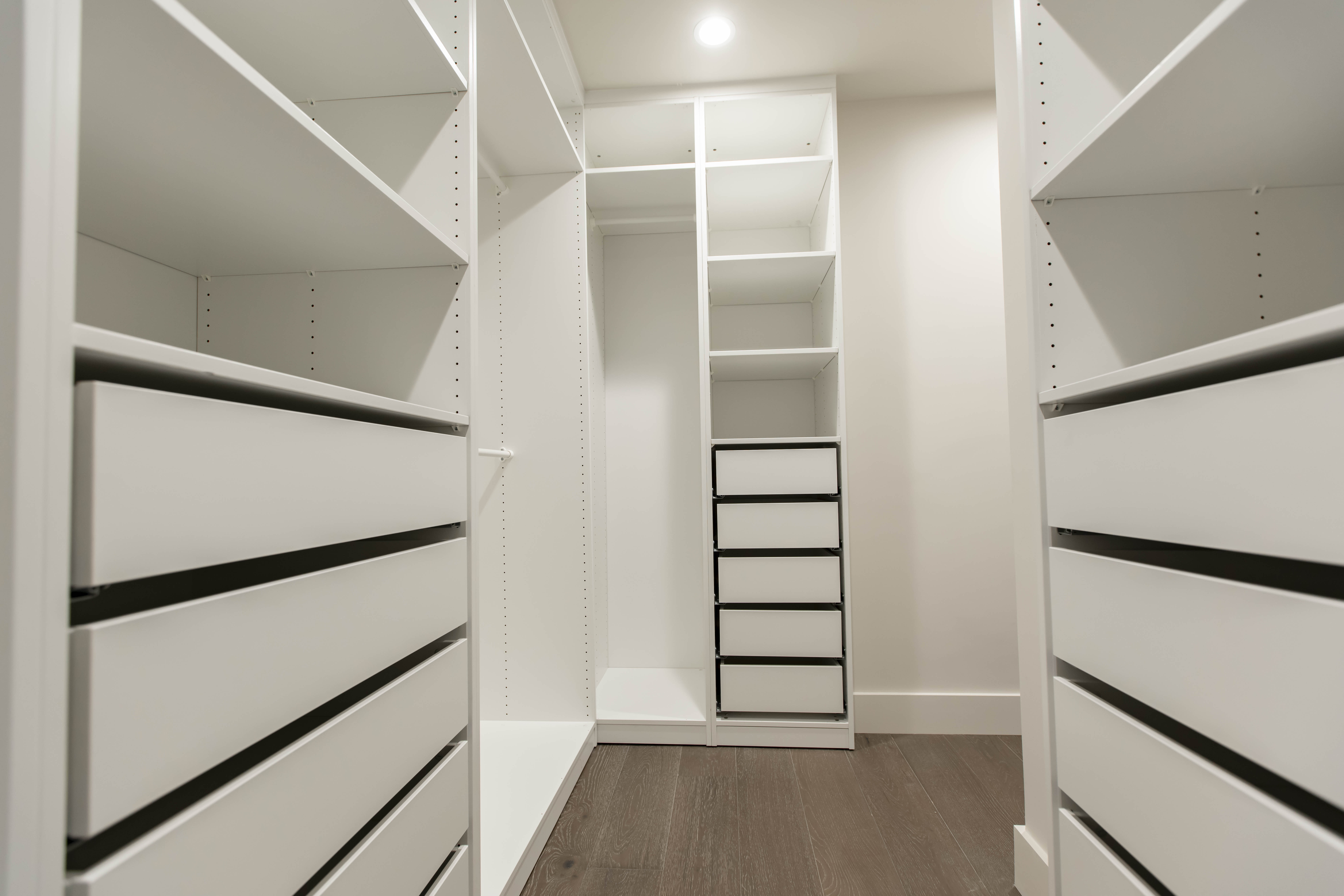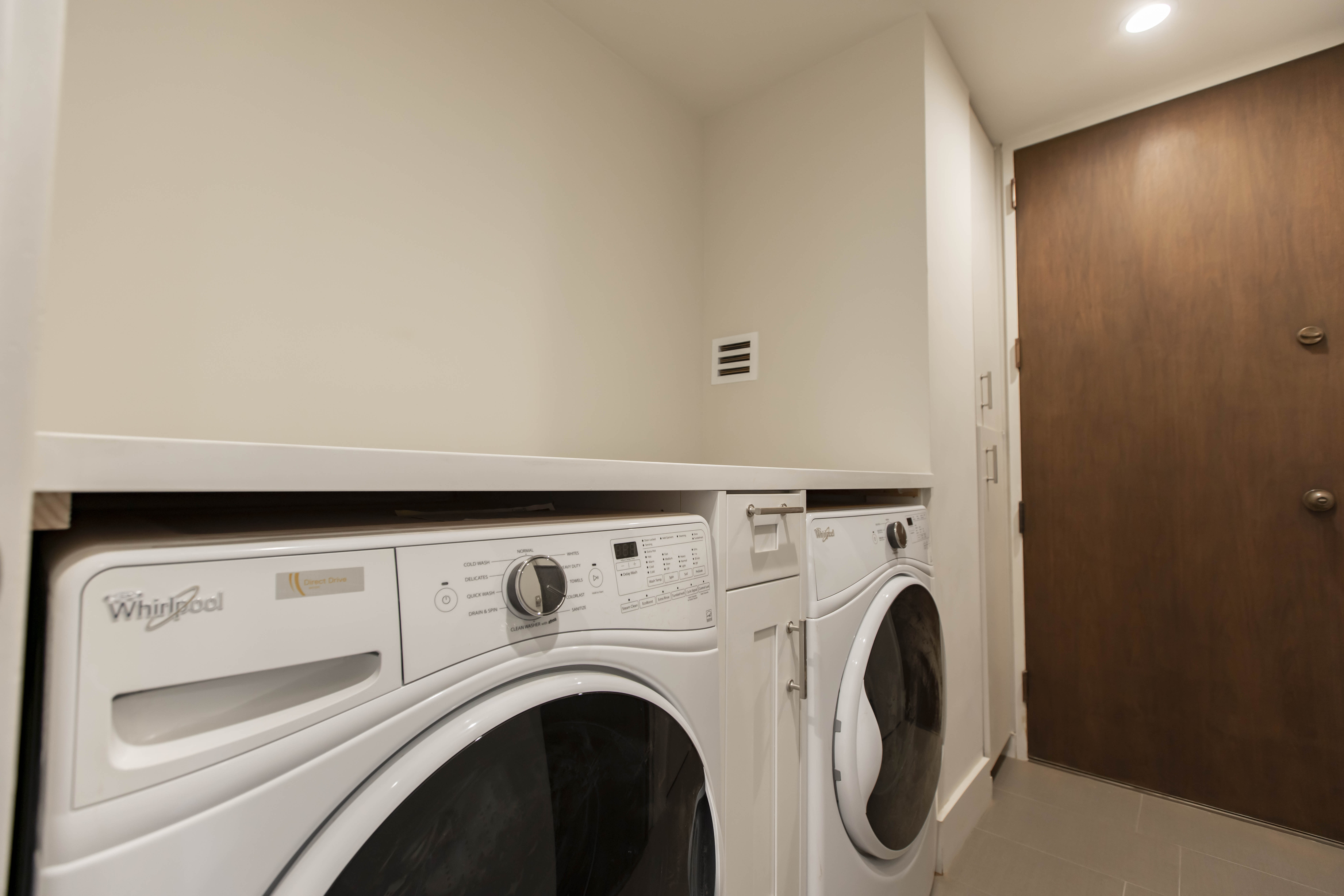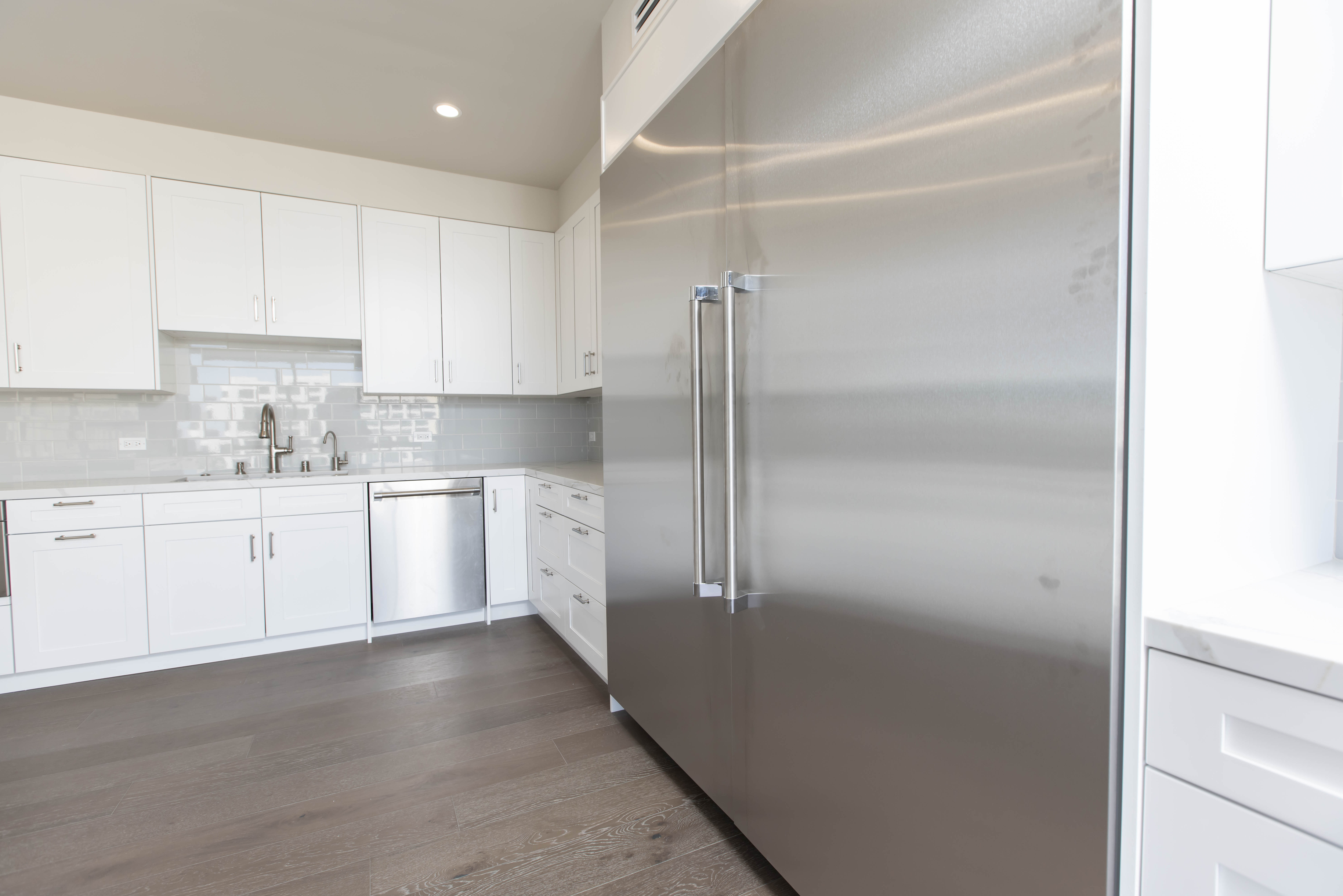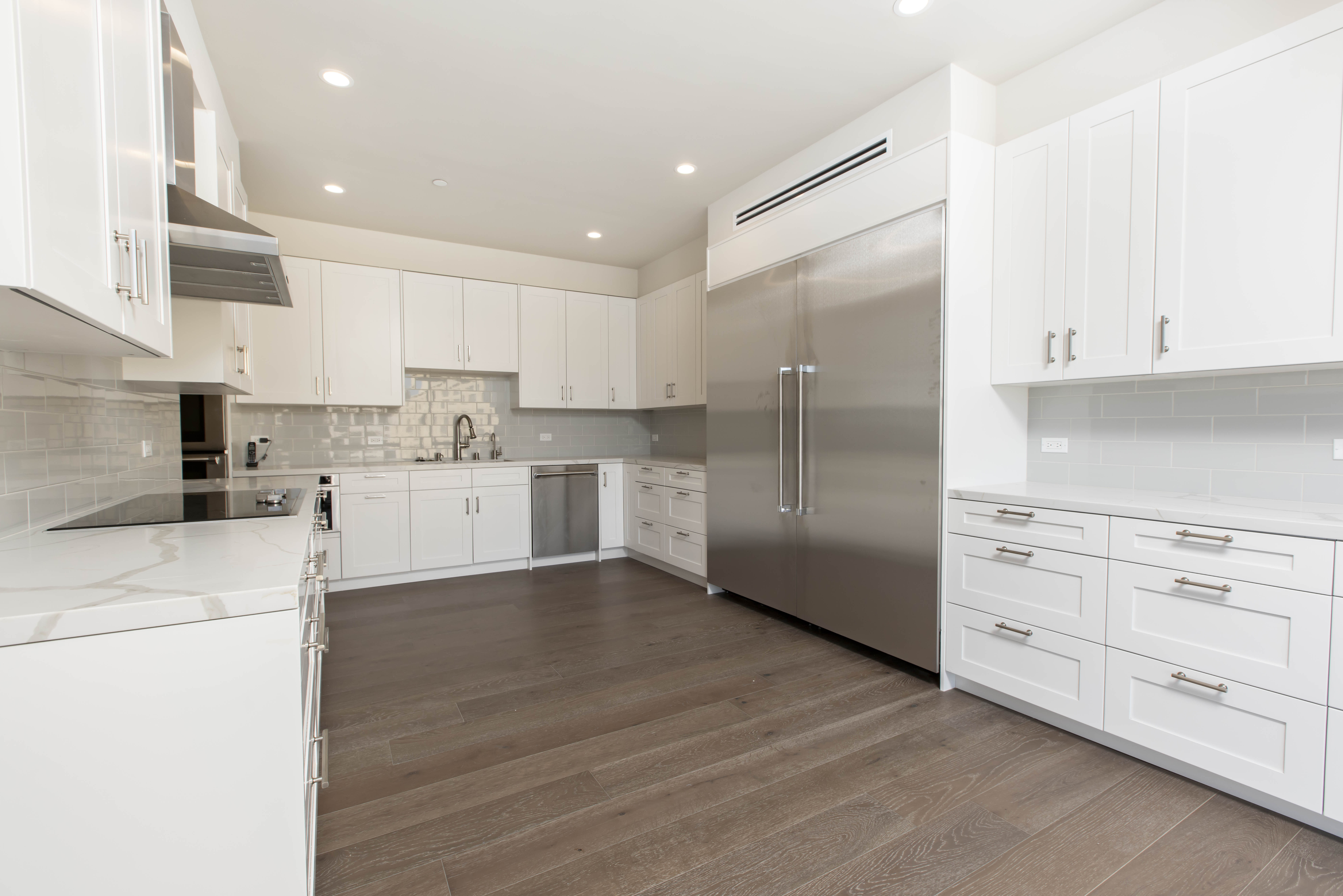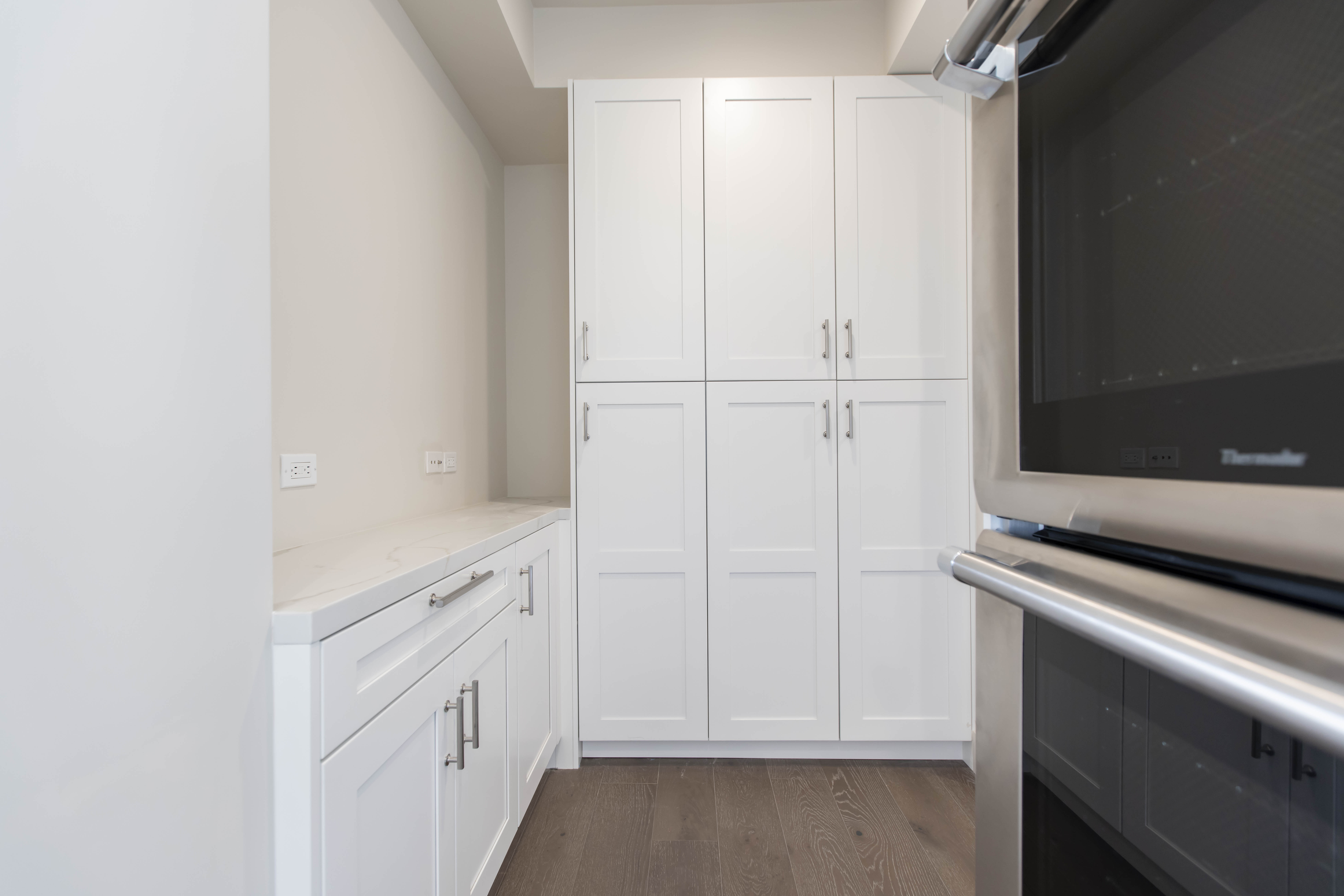 At the heart of the home, a custom shaker-style white kitchen introduces timeless architecture through tailored millwork, stainless steel appliances, refined hardware, and clean-lined surfaces that reflect natural light. Dark walnut engineered hardwood flooring runs throughout the residence, grounding the airy palette with warmth and depth while creating a striking contrast against the crisp cabinetry. In the bathrooms, large-format marble wraps floors and walls in a seamless gesture, paired with frameless glass enclosures and restrained detailing to evoke a serene, spa-like atmosphere within the urban skyline.