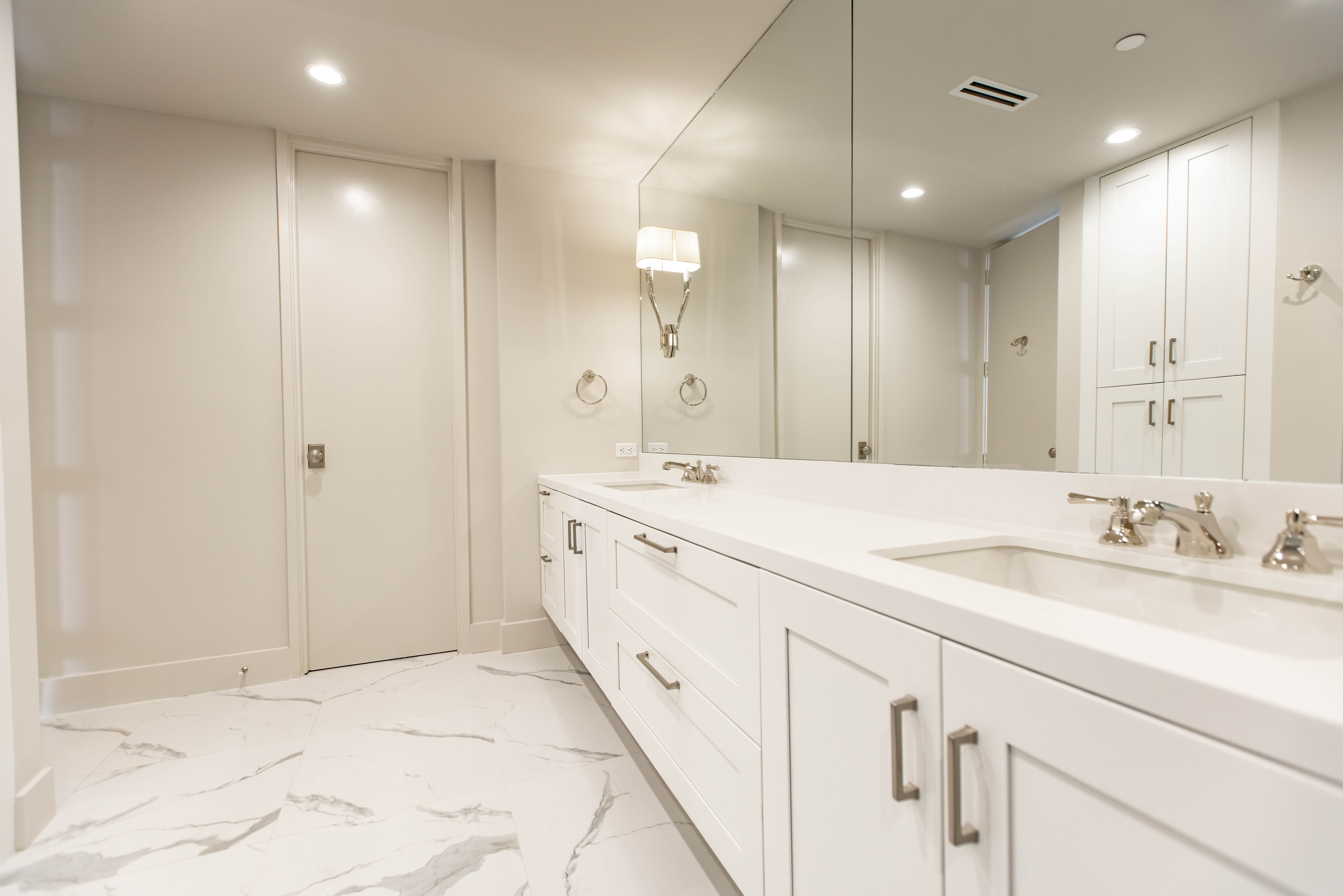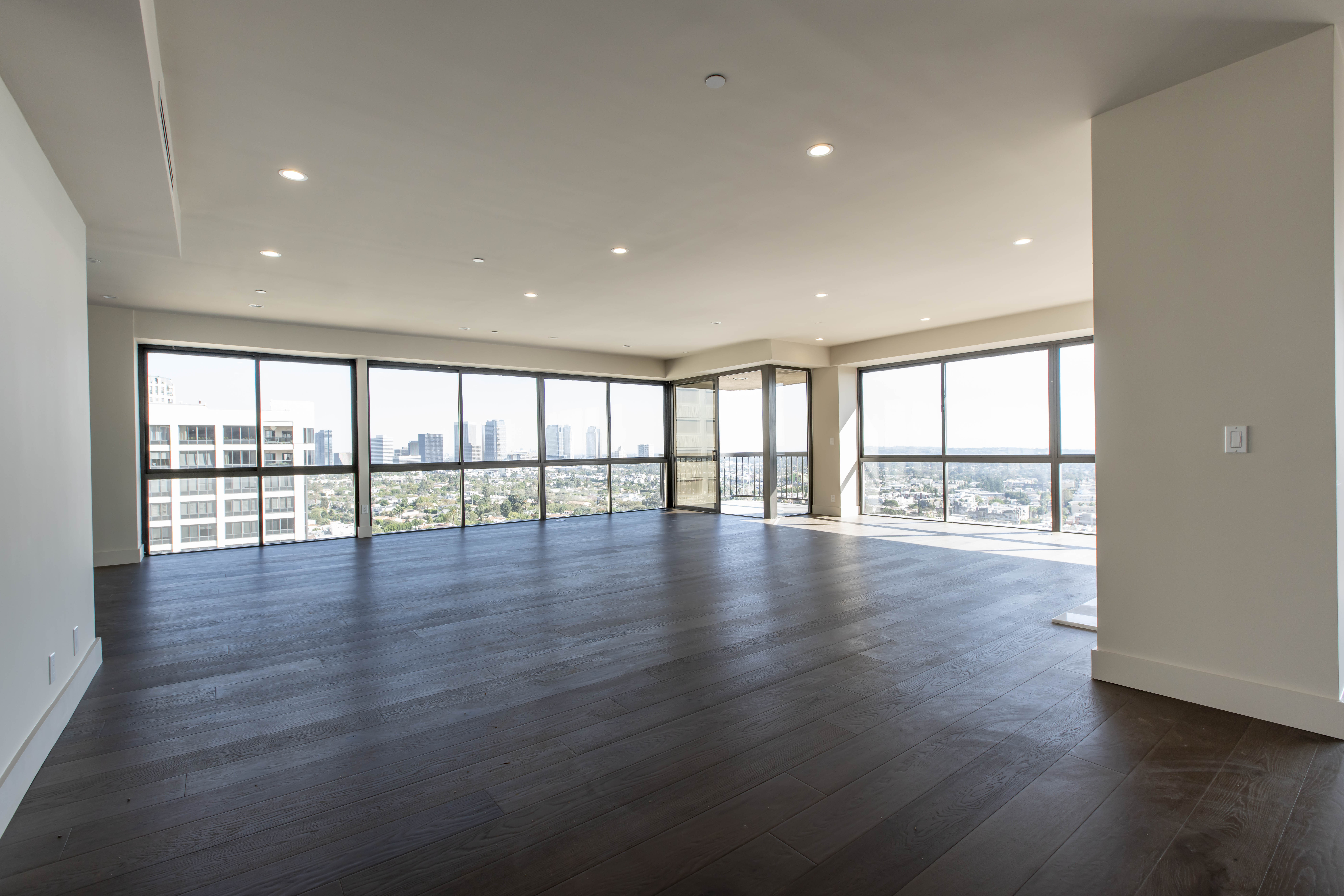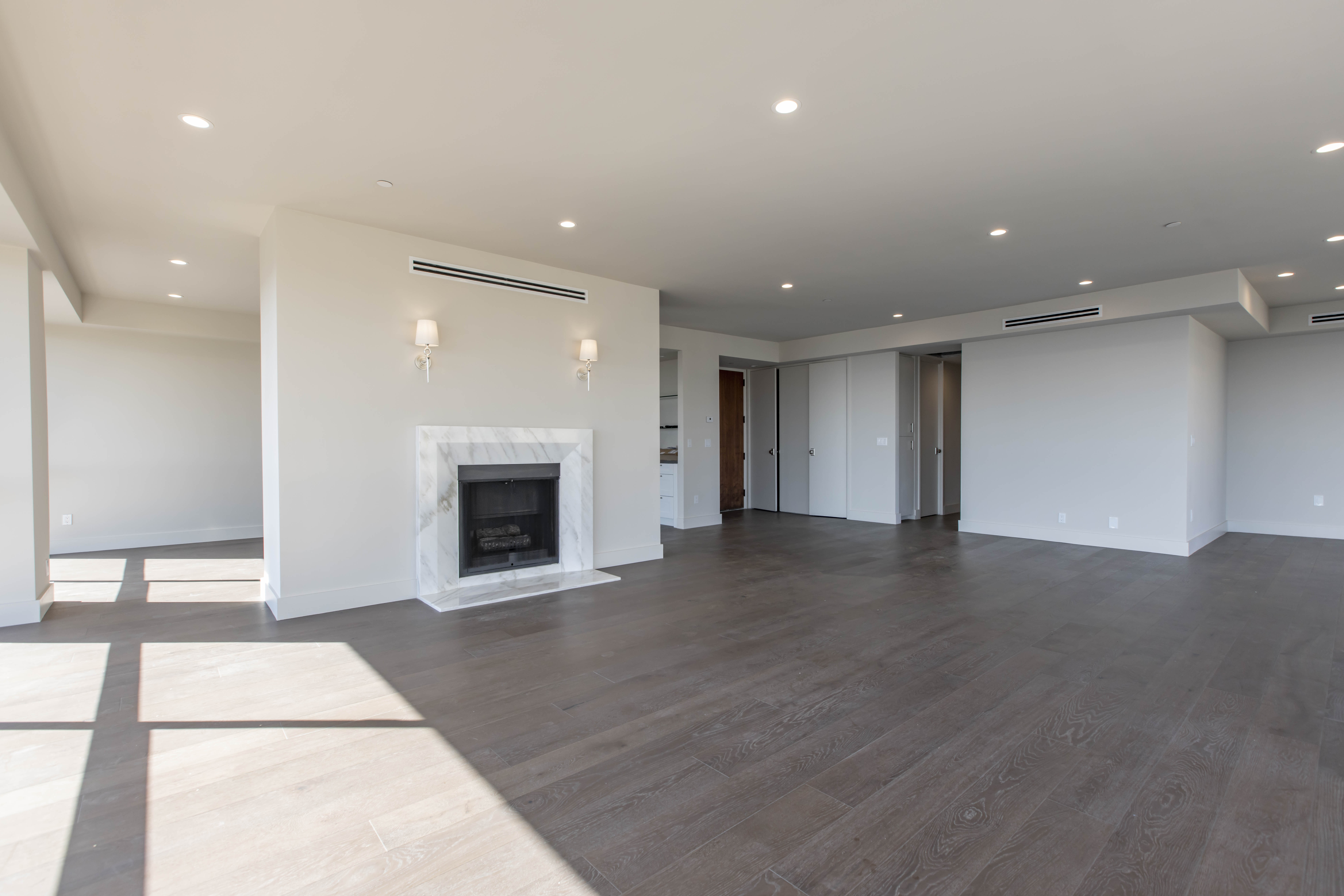 This Wilshire Corridor high-rise renovation reimagines a once compartmentalized condominium into a luminous, open-concept residence defined by proportion, material contrast, and technical precision. Constrained by fixed plumbing stacks, electrical risers, and structural shear walls typical of Los Angeles high-rise construction, the transformation required strategic engineering rather than simple demolition. Select non-load-bearing walls were removed, ceilings were thoughtfully raised where allowable, and custom soffits were redesigned to conceal rerouted mechanical systems — allowing the space to feel significantly larger without compromising the building’s infrastructure.